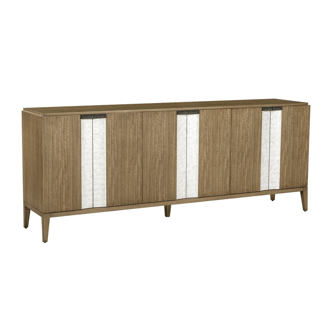 Our Aberdeen Sideboard features a smooth top, six doors with a "concave" Capiz shell detail, interior shelving, and textured bronze hardware.