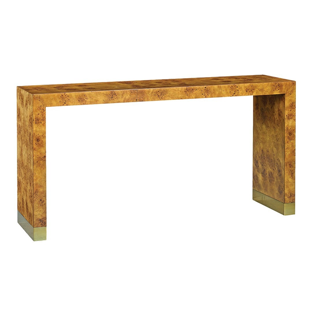 Our Anaheim Console Table features a smooth, waterfall style top and legs with a brass detail