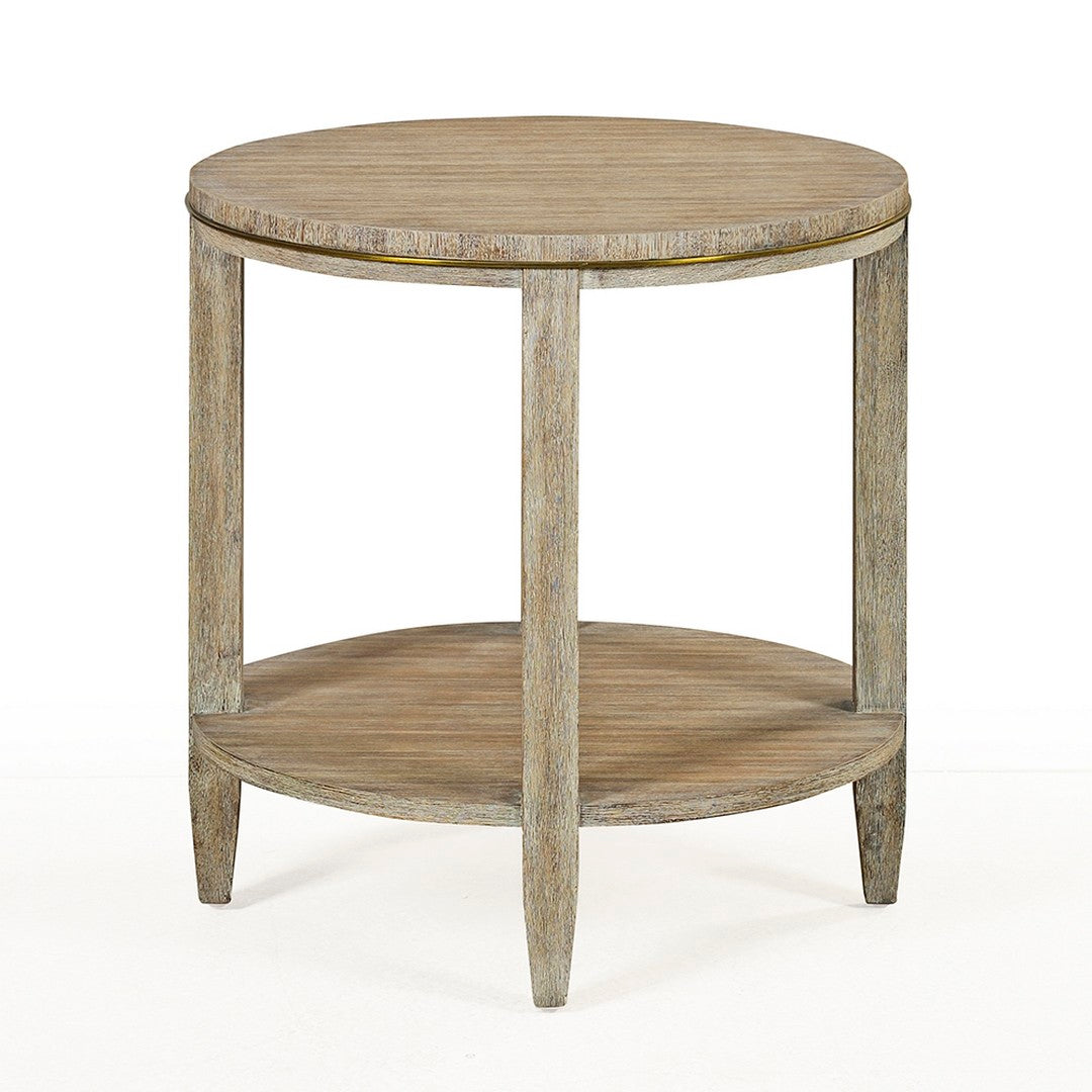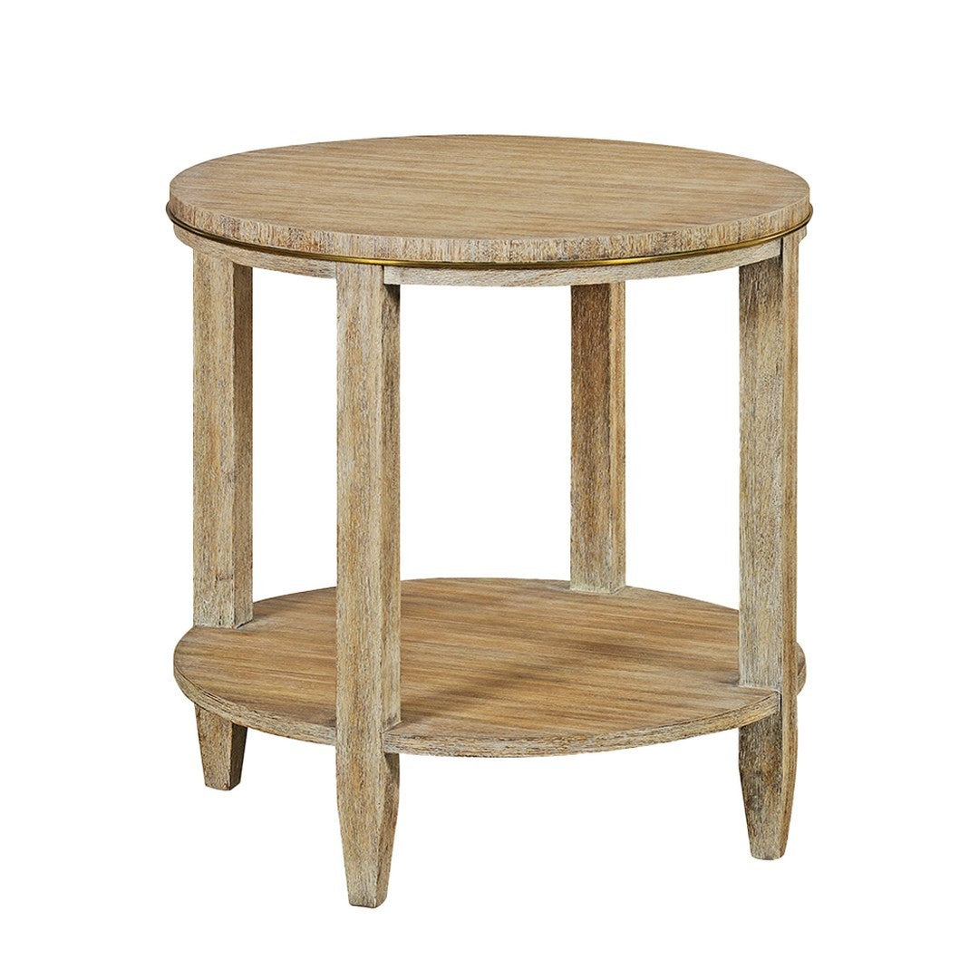 Our Antioch Side Table features a round, smooth top, open shelving, tapered legs, and a delicate brass detail