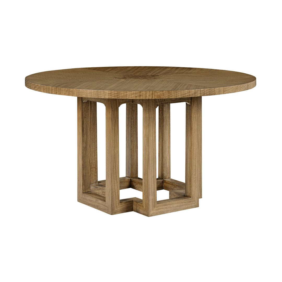 Our Ben Brook Dining Table features a smooth, round top with an Ash burl inlay and a uniquely shaped base.