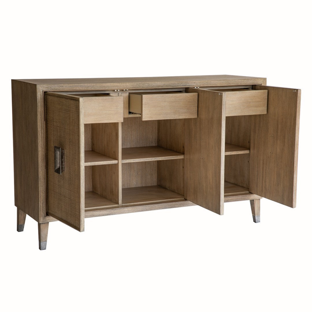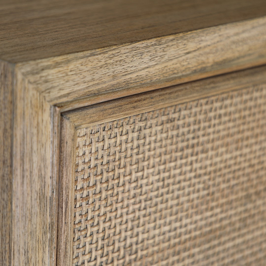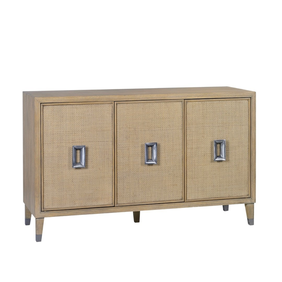 Our Canna Cabinet features three cane door fronts, a silver leaf hand-textured hardware and ferrules, and interior shelving and storage.