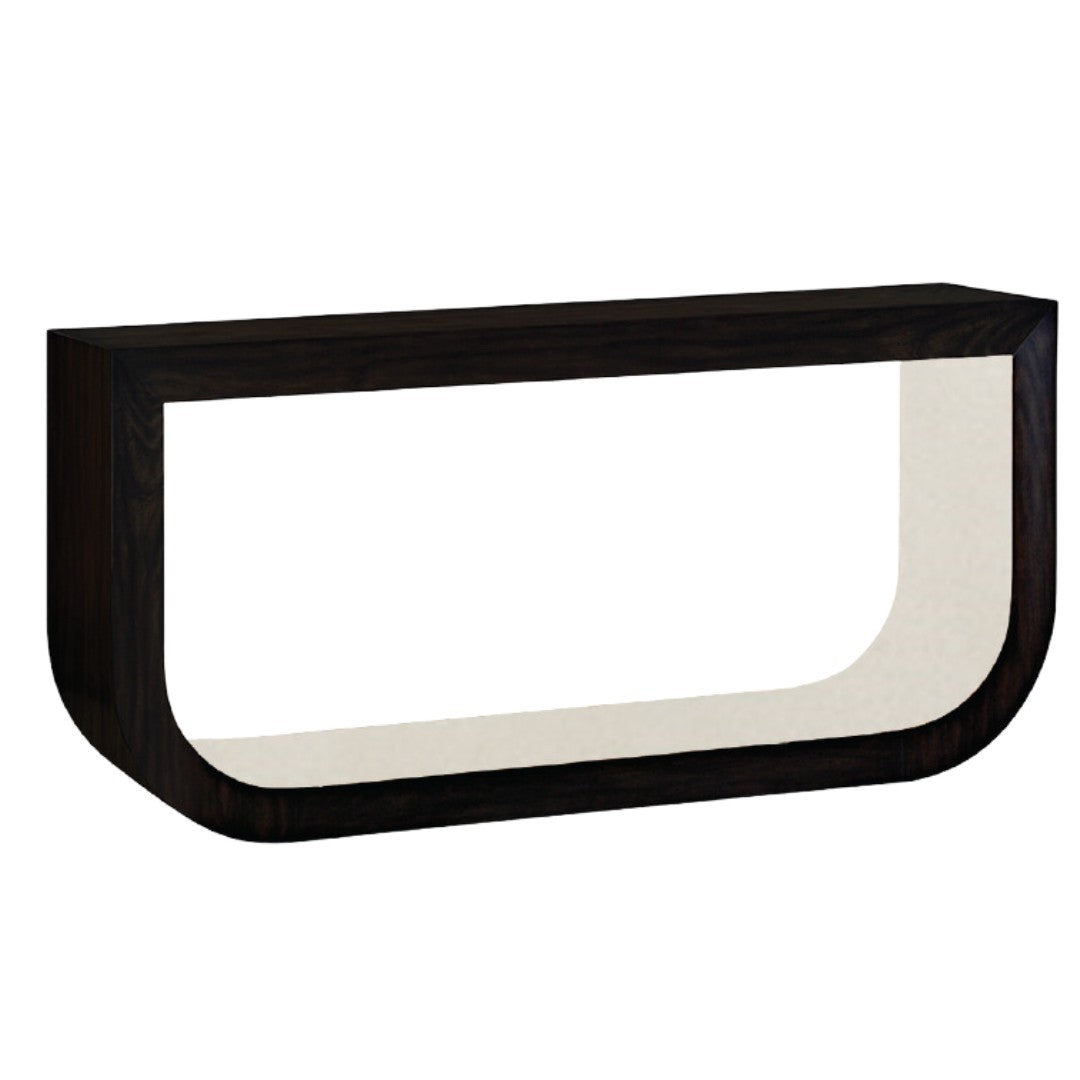 Our Carter Console Table features a smooth top, curved sides, a thick frame, and a lower shelf