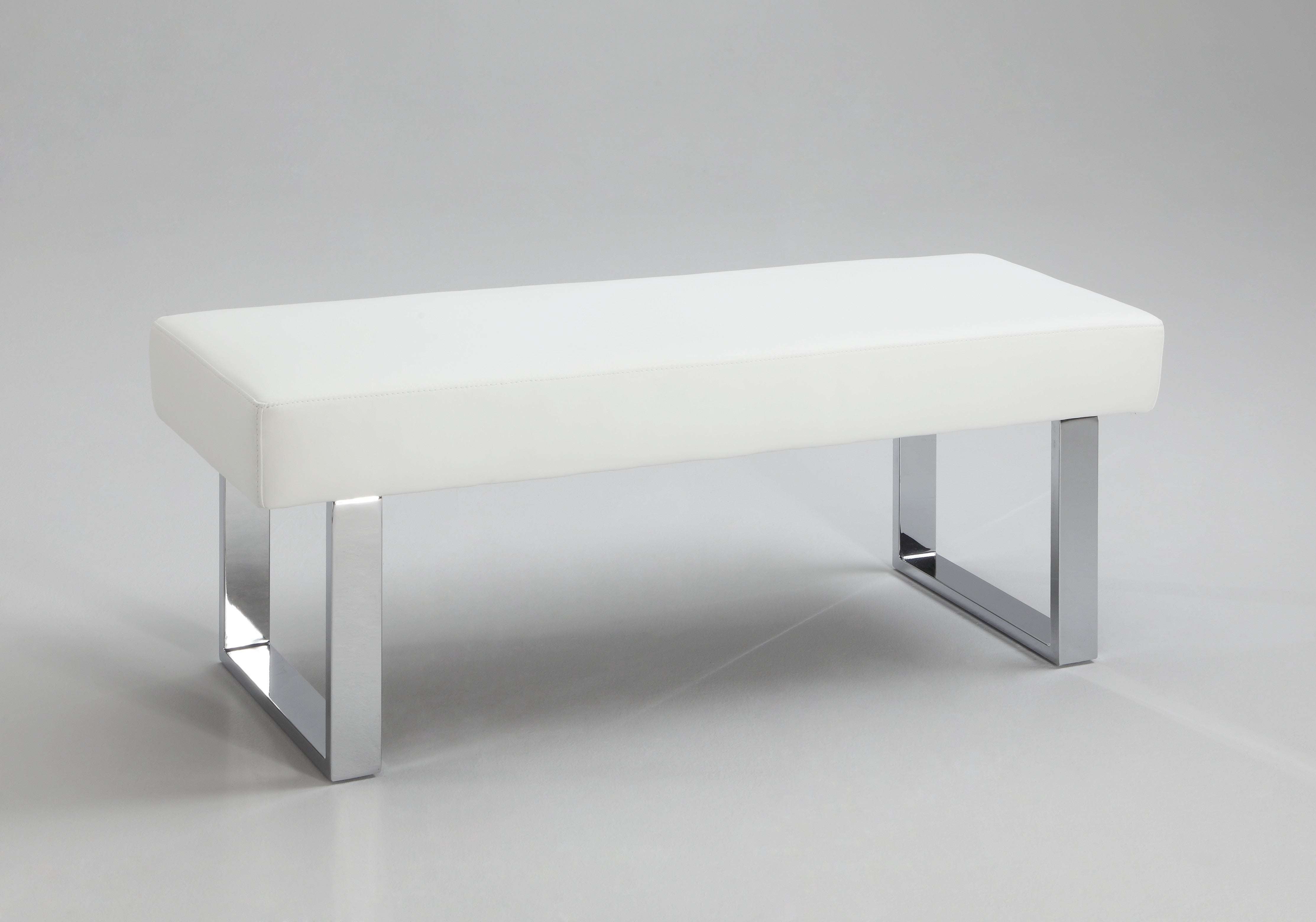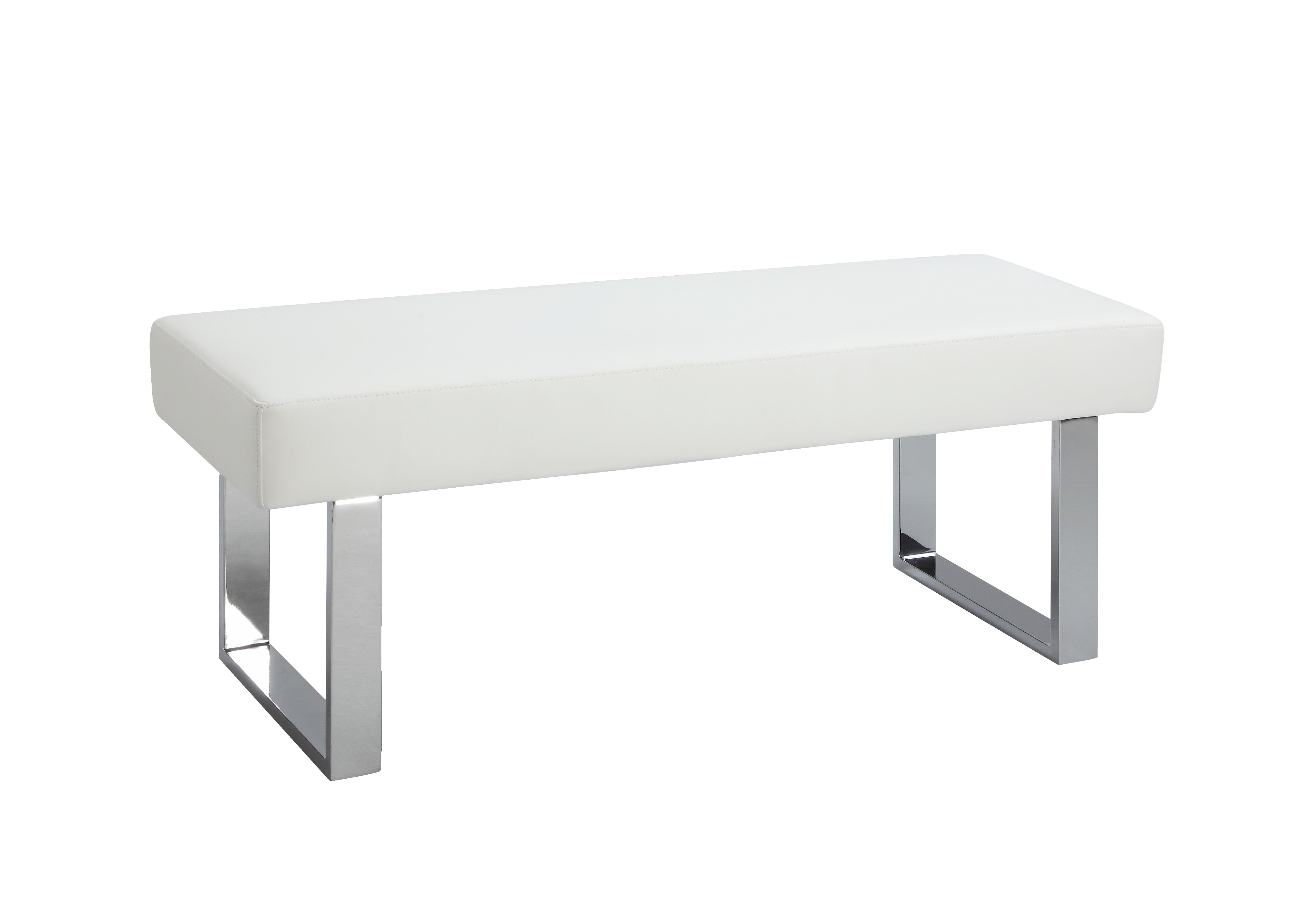 This sleek contemporary dining bench features ample seating room. The comfortable seat is upholstered in white faux leather, mounted on polished stainless steel legs.