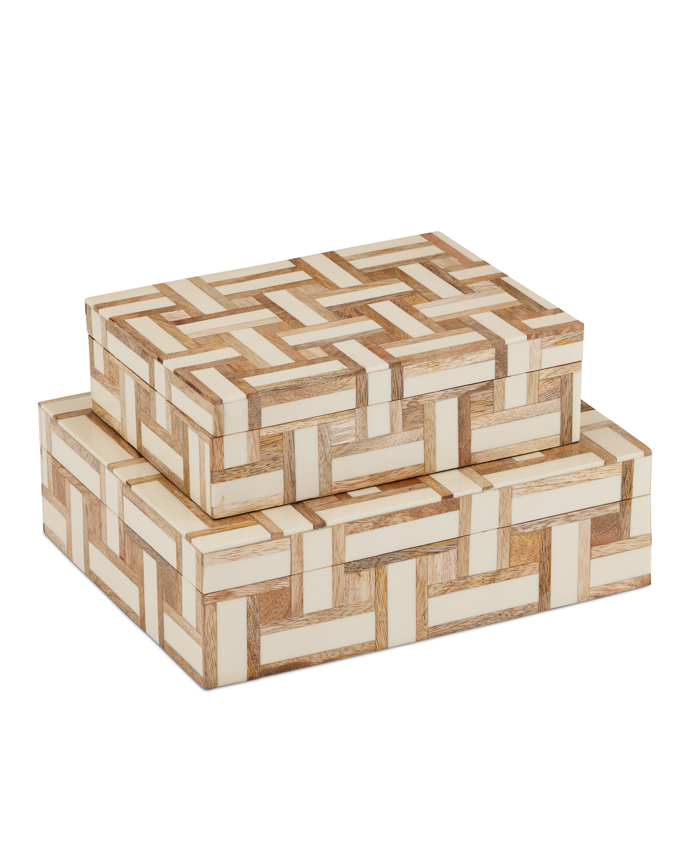 The Aarna Cream Box Set with its basket-weave pattern is made of pieces of wood interspersed with strips of ivory composite. The contrast of the textural woodgrains and the sleek composite creates such an interesting aspect to this design, as does the angular lines of the overall rectangular shapes that echo the elongated pieces on their surfaces. The interiors of the boxes are lined in white linen.