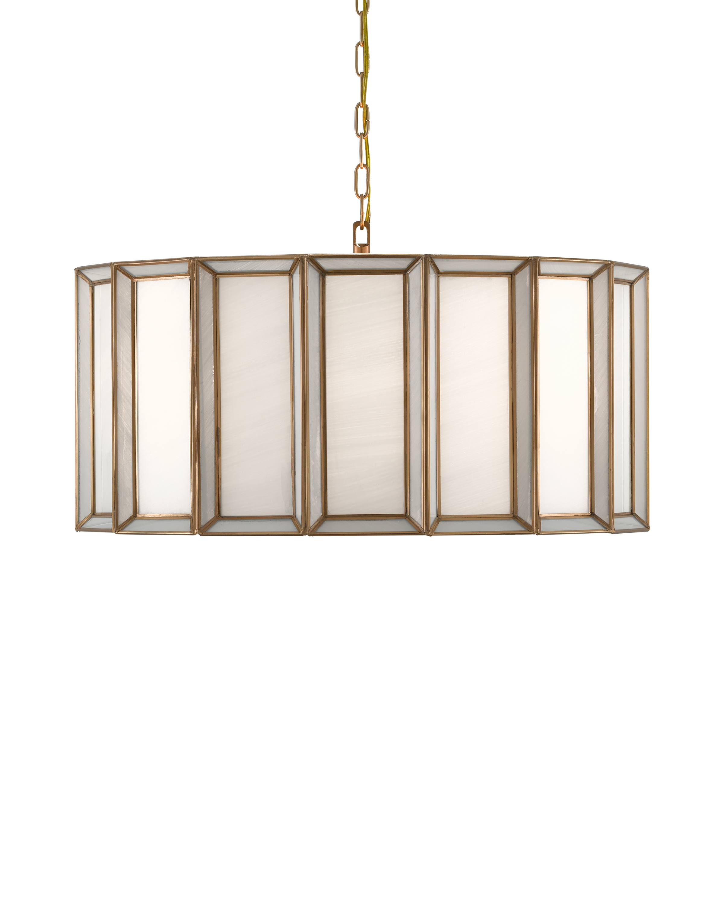 When a soft glow is desired, milk glass is one of the best materials to diffuse illumination. Our Daze Large Pendant is made of articulated panels of white milk glass that are joined together by ribs of metal in an antique brass finish. This white pendant, designed by Clarence Mallari, will turn luminous when it is switched on. Adjustable from 19.5" to 87.5" with use of included chain/rod kit/cable. If your space calls for a longer drop, additional chain/rods/cable is available for purchase.