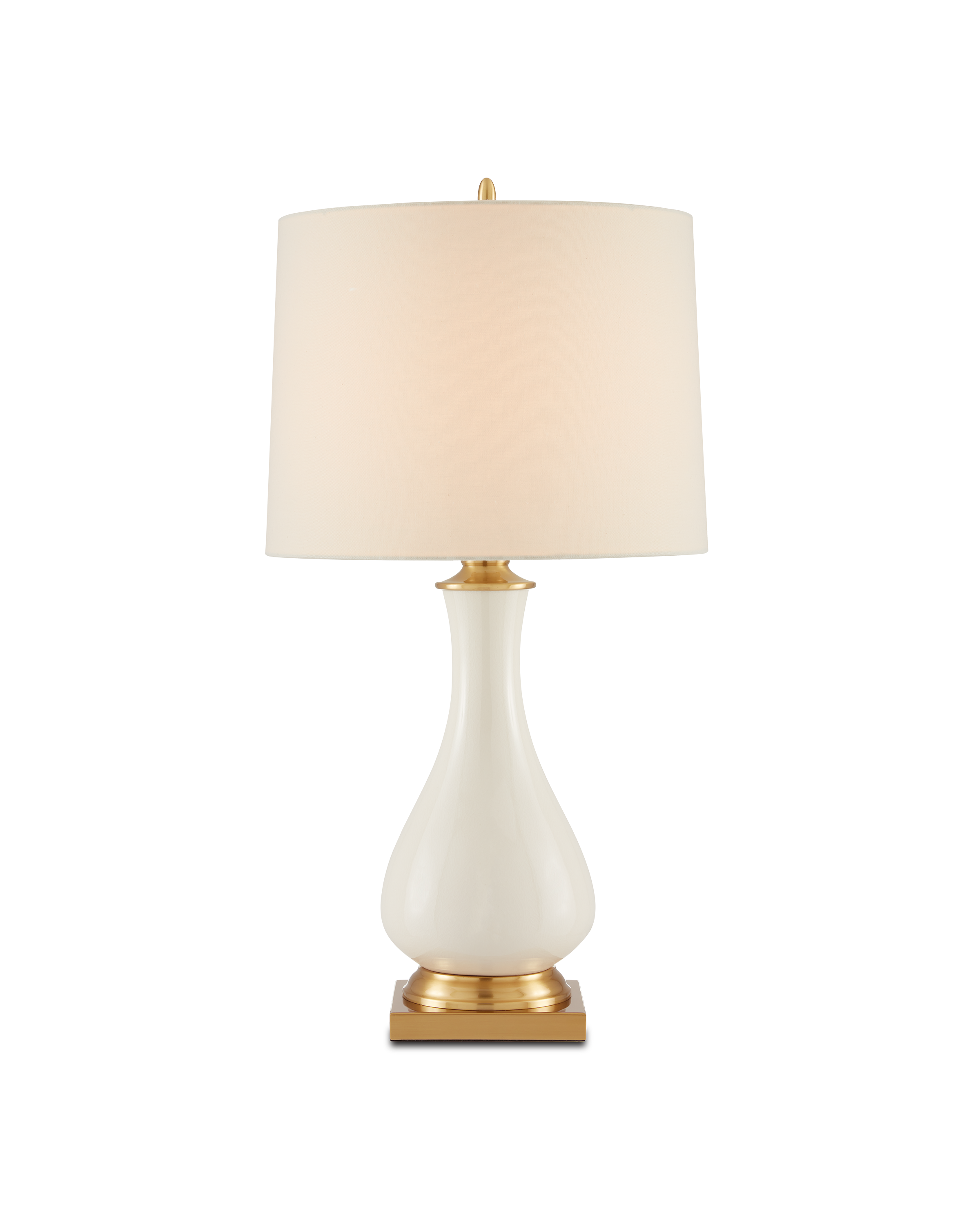 The Lynton Cream Table Lamp, a modernized version of a classically styled ceramic lamp, has a cream crackle finish. The warm glow of the brass mountings and coordinating finial contrast the body and the off-white linen shade.