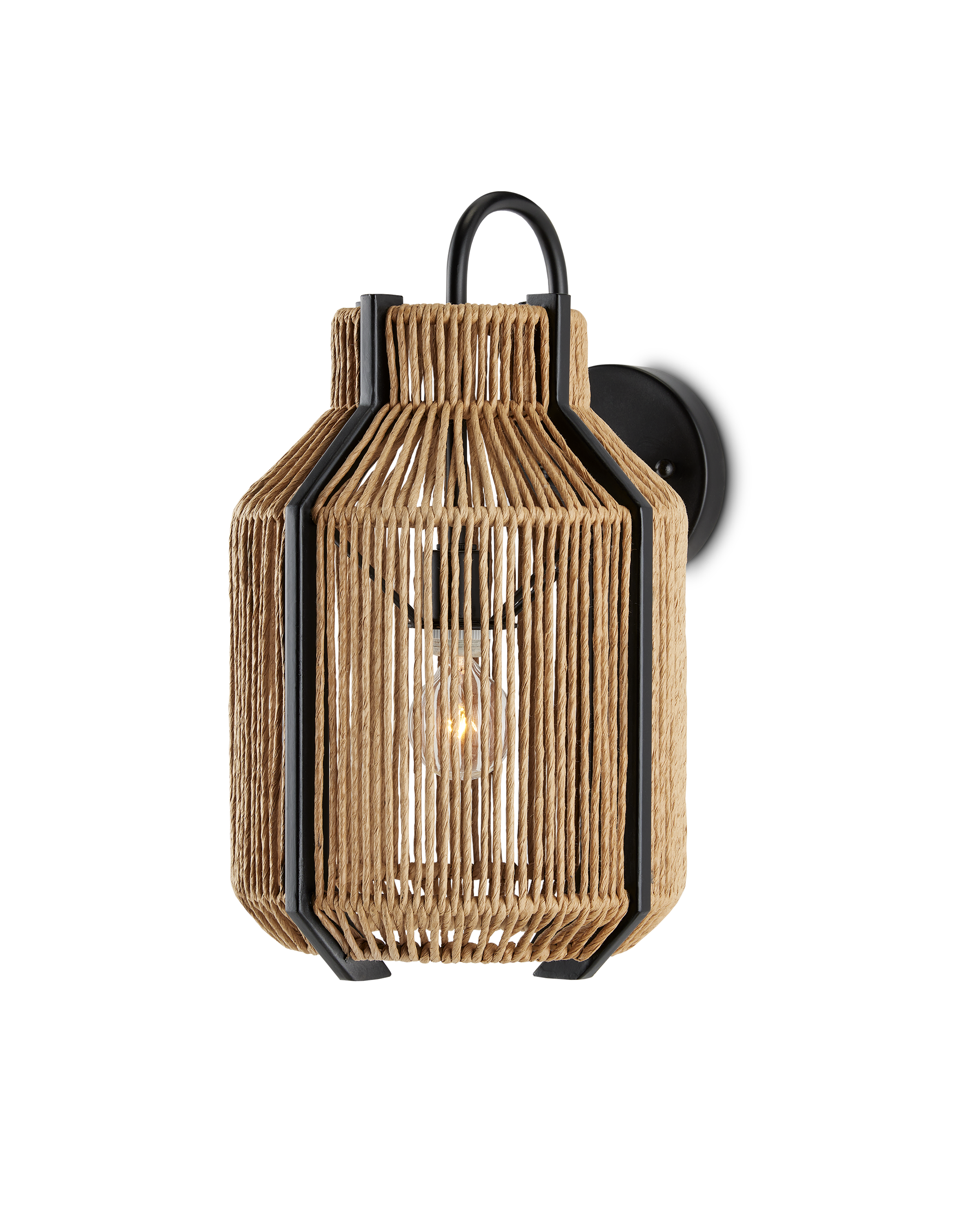 The Mali Wall Sconce, designed by Clarence Mallari, has a complex interplay of sleek and earthy elements. The lines that rise above and below the natural woven shade are made of wrought iron in a satin black finish, as are the stem curving into the sconce and the hardware that holds the bulb. These are the clean-lined elements that contrast the Kraft paper twine on the rope sconce, which is tightly woven but not so dense that it interrupts the warm glow of illumination from its interior.