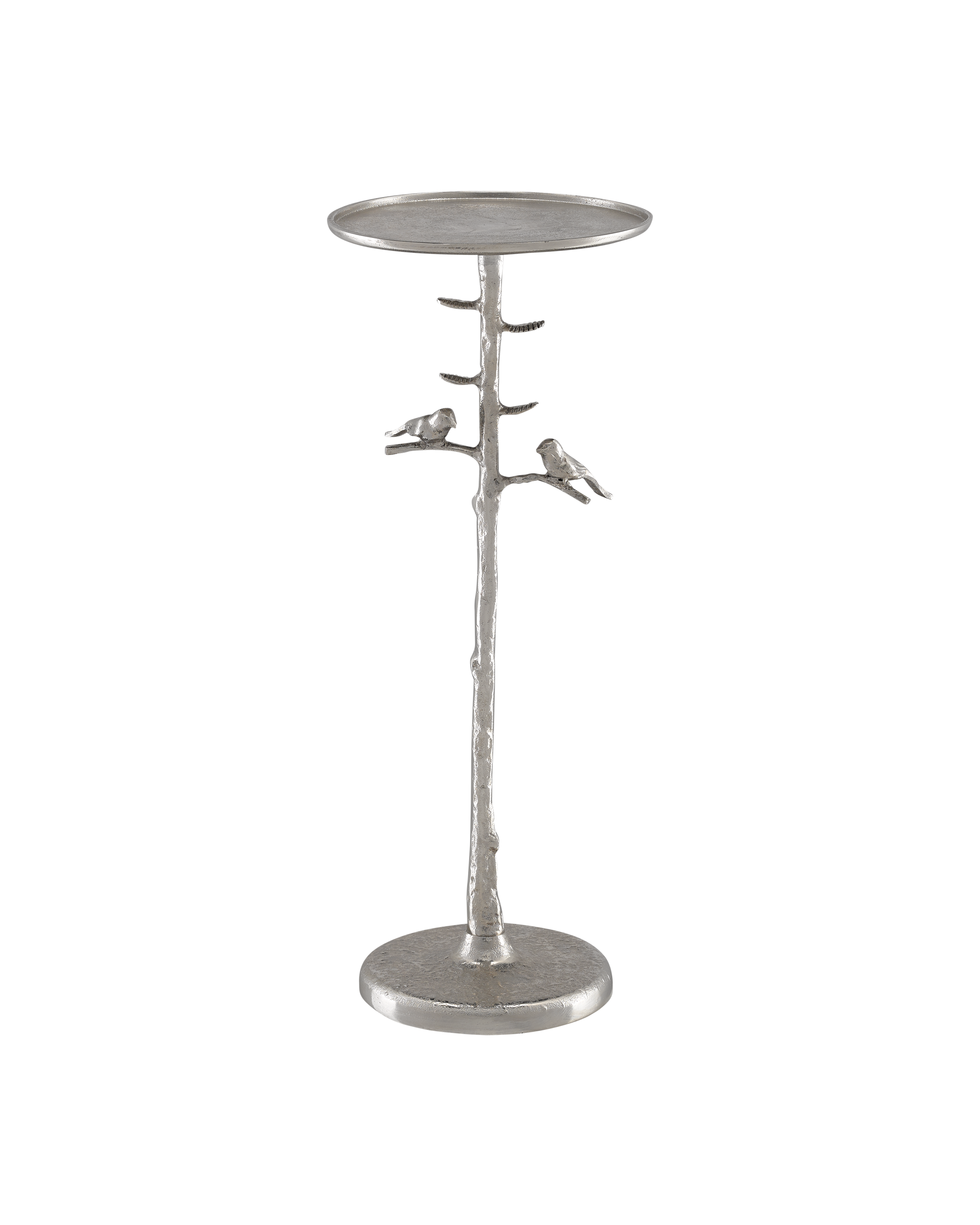 The Piaf Silver Drinks Table is a cast aluminum accent table in a luminous polished nickel finish that will make it gleam from its spot in a room. The whimsical design has two birds perched on twigs extending from a branch-like stem that holds its top.
