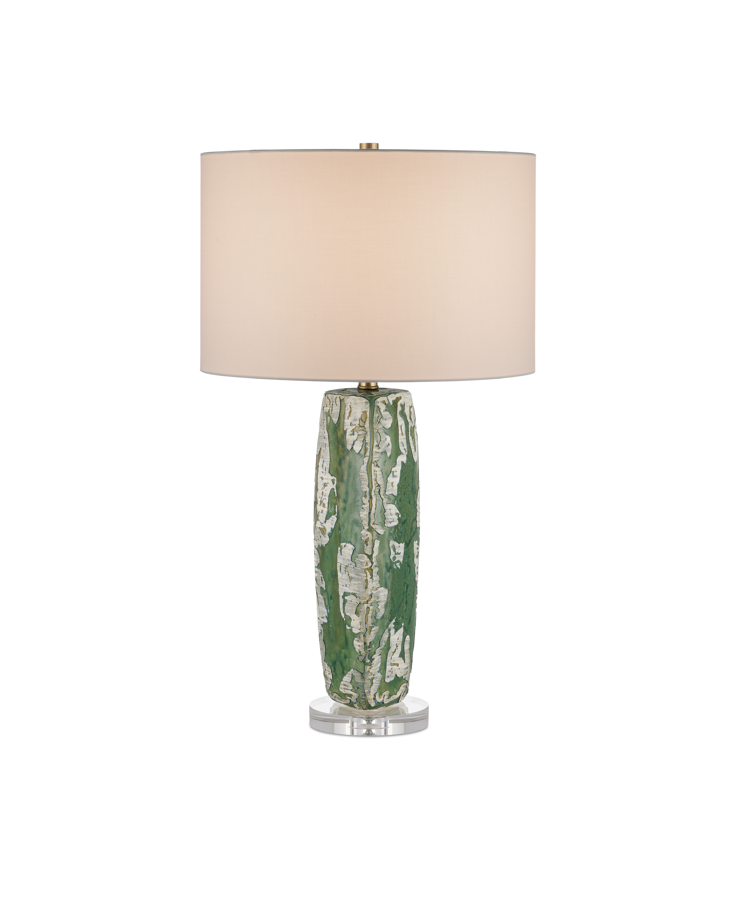 The Zowan Table Lamp is made of ceramic in a matte green smoke glazing flowing along its surface that looks like a genealogical map. The cream that overlays the green has been hand-applied to bring the lamp an artful feel, and the optic crystal base from which the fixture rises leaves the painterly column to be the focal point of the design. One of the interesting things about this green lamp is that the pattern will change slightly when seen from different angles.