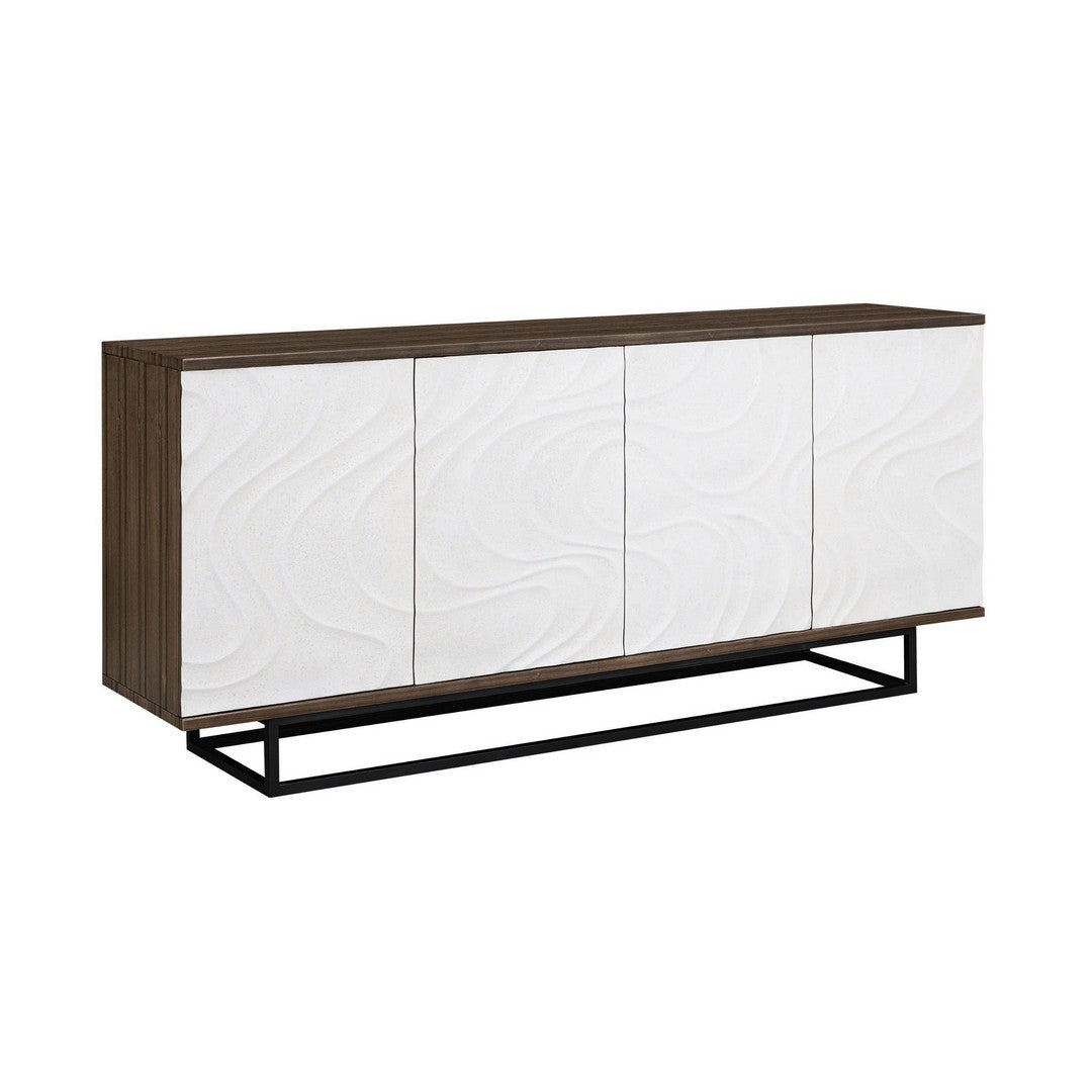 Our Dietrich Sideboard features a smooth top, four textured, "faux-concrete" door fronts, push/pull hardware, interior shelving, and a bronze base.