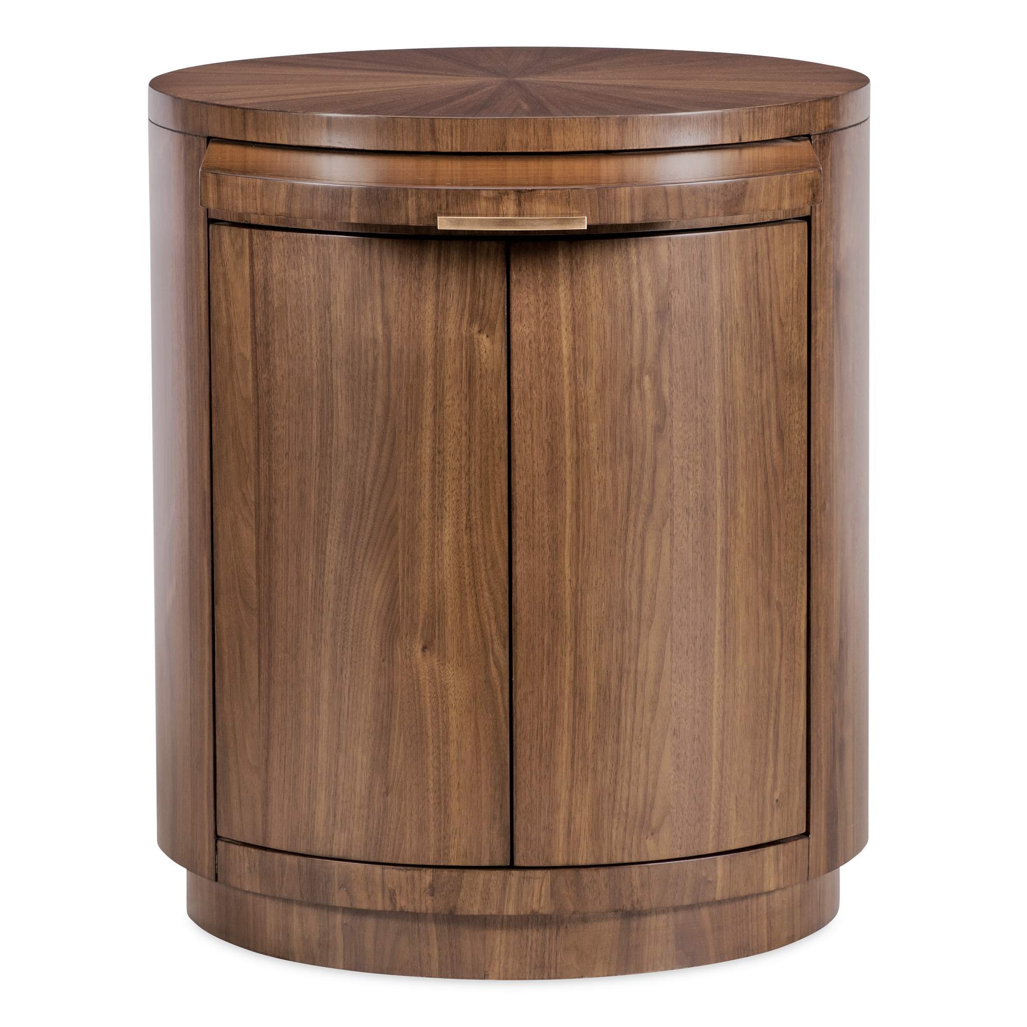 The Eleana Round Nightstand features a beautiful starburst veneer top, touch-latch wood doors, and a pull-out tray for added versatility. Finished in Light Caramel walnut veneers with Sunlit Bronze hardware, this piece is perfect for adding warmth and luxury to any bedroom.