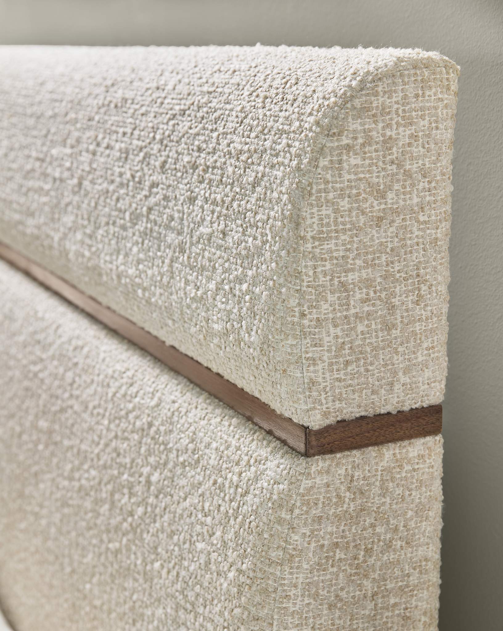 Experience luxurious comfort with the Eleana Upholstered California King Panel Bed, blending fabric upholstery with Light Caramel walnut veneer trim. Its spacious California King size and modern, clean lines make it a perfect addition for transitional interiors.
