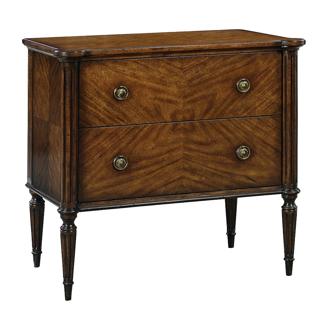 Our Fairfield Nightstand features a smooth top, a shaped edge, two storage drawers, a "secret" push/pull drawer, and tapered legs; Country finish on Acacia crown veneer and solids.