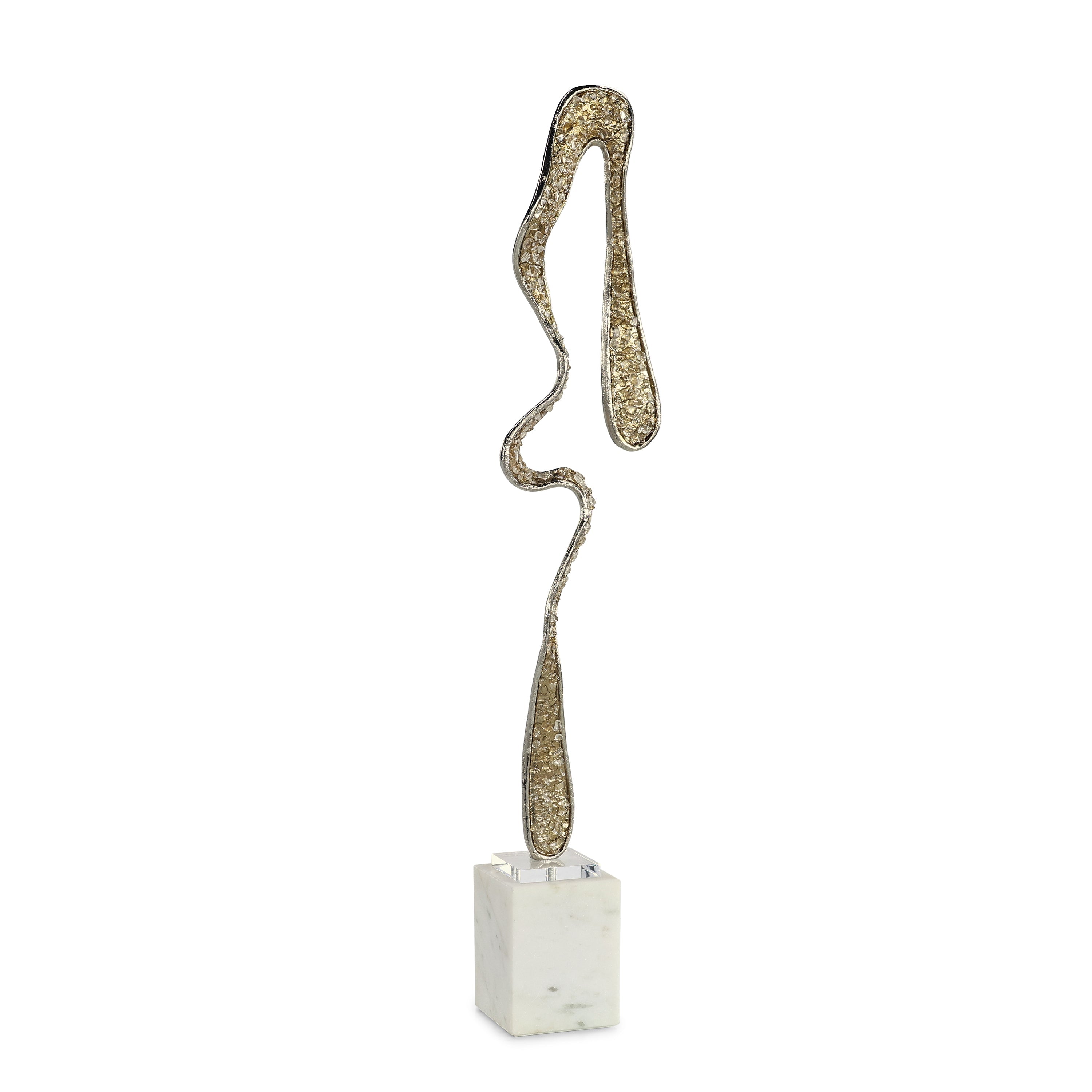 The Fluidity Sculpture enhances gorgeous tones and rich textures with an alluring sense of motion. This aluminum sculpture in a Champagne finish showcases a fluid, abstract shape embellished with pieces of shattered glass. The piece is trimmed in a Nickel finish and features a two-tiered base of acrylic and natural white marble.