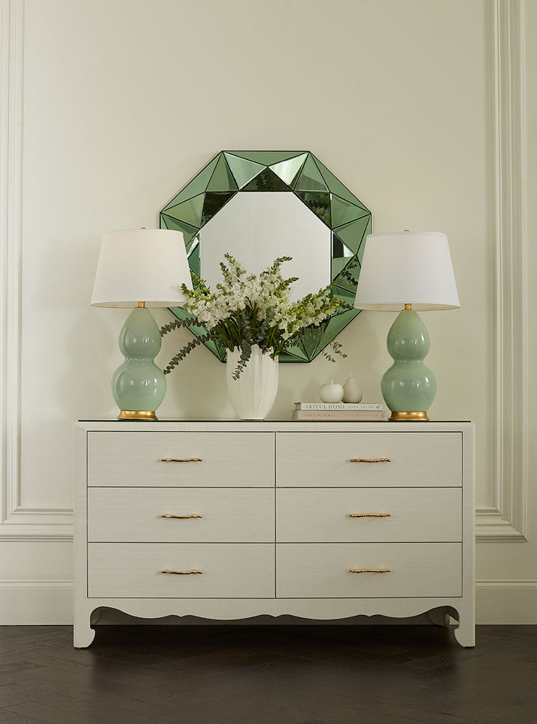The Gianna Collection exudes feminine charm and delicate beauty. Each piece is meticulously wrapped in grasscloth and finished with a clear lacquer, highlighting the natural texture while providing a subtle sheen. Graceful flourished detailing adorns the trim and feet, adding a touch of artistry that enhances the collection's refined aesthetic. This harmonious blend of materials and design elements creates a timeless appeal, making the Gianna Collection a perfect addition to spaces seeking a soft, sophisticated ambiance.