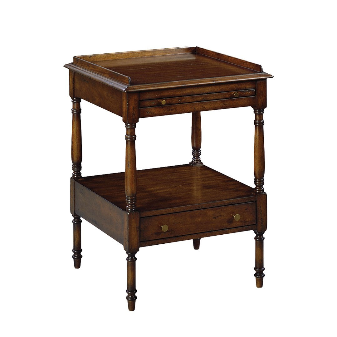 Our Haven Side Table features a square lip top, a pullout and drawer, delicate hand-cast, brass hardware, a lower shelf, and turned legs