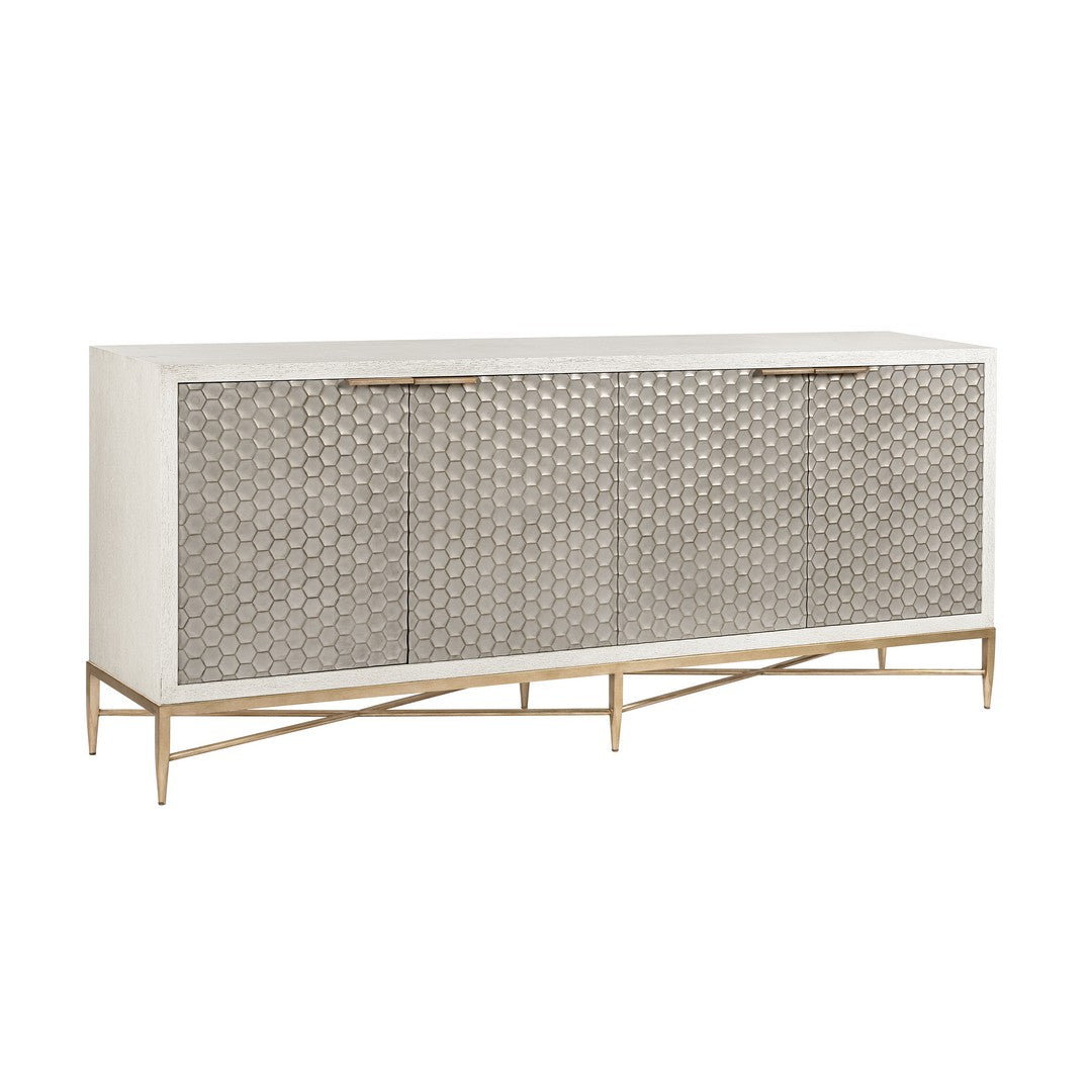 Our Honeycomb Sideboard features two, honeycomb patterned doors, interior shelving, a metal base, tapered legs, and a double "X" shaped stretcher.