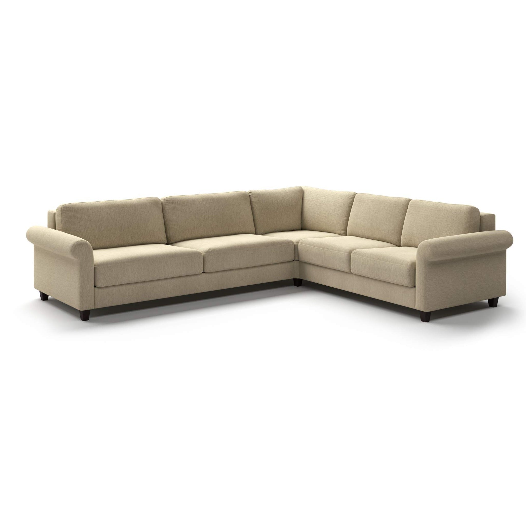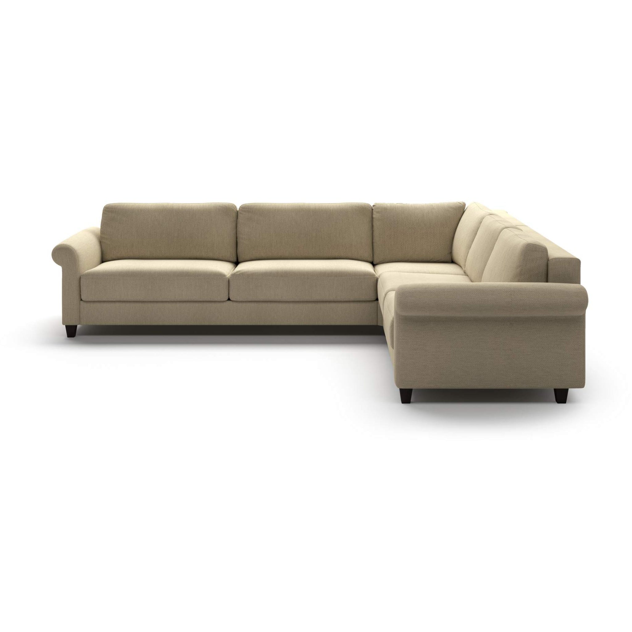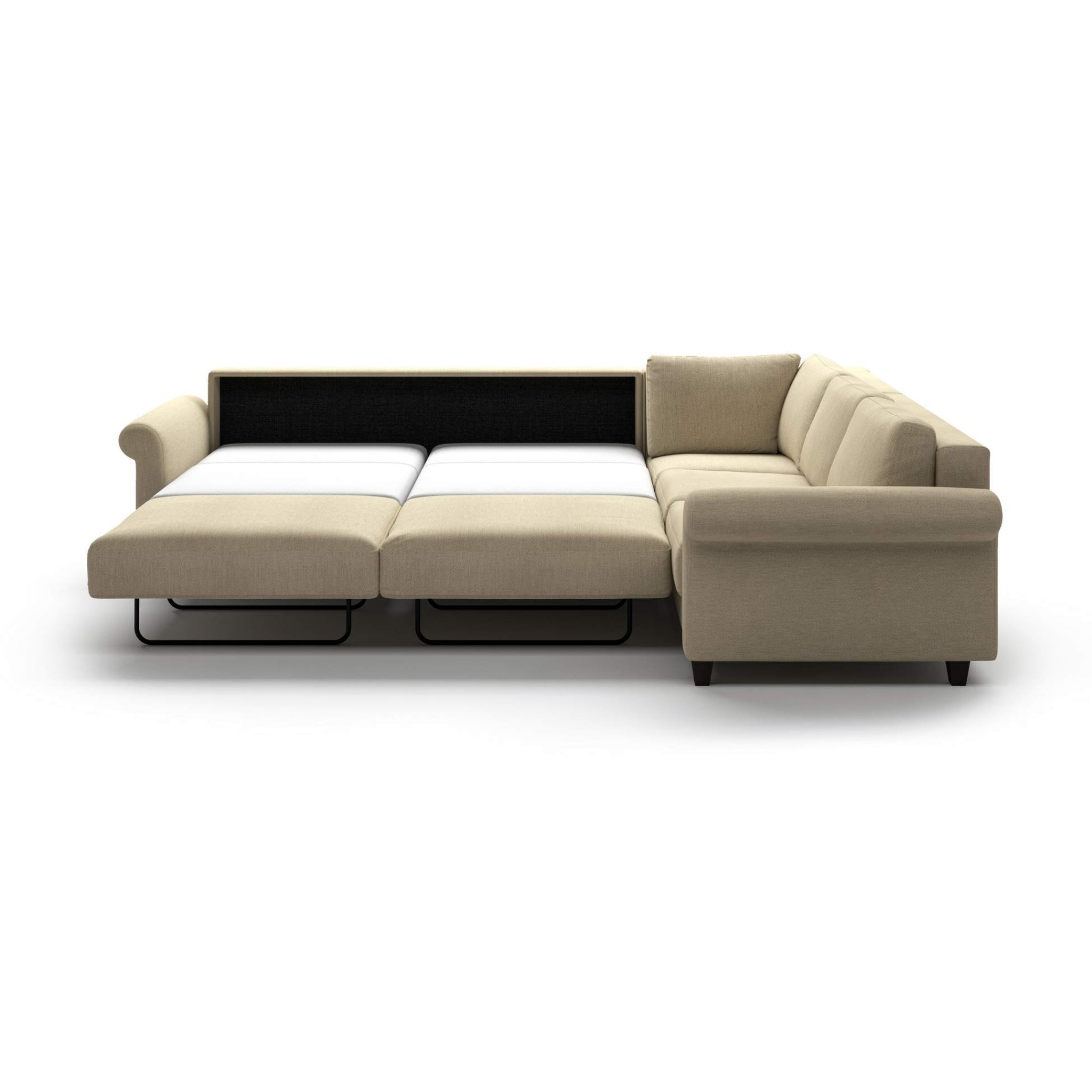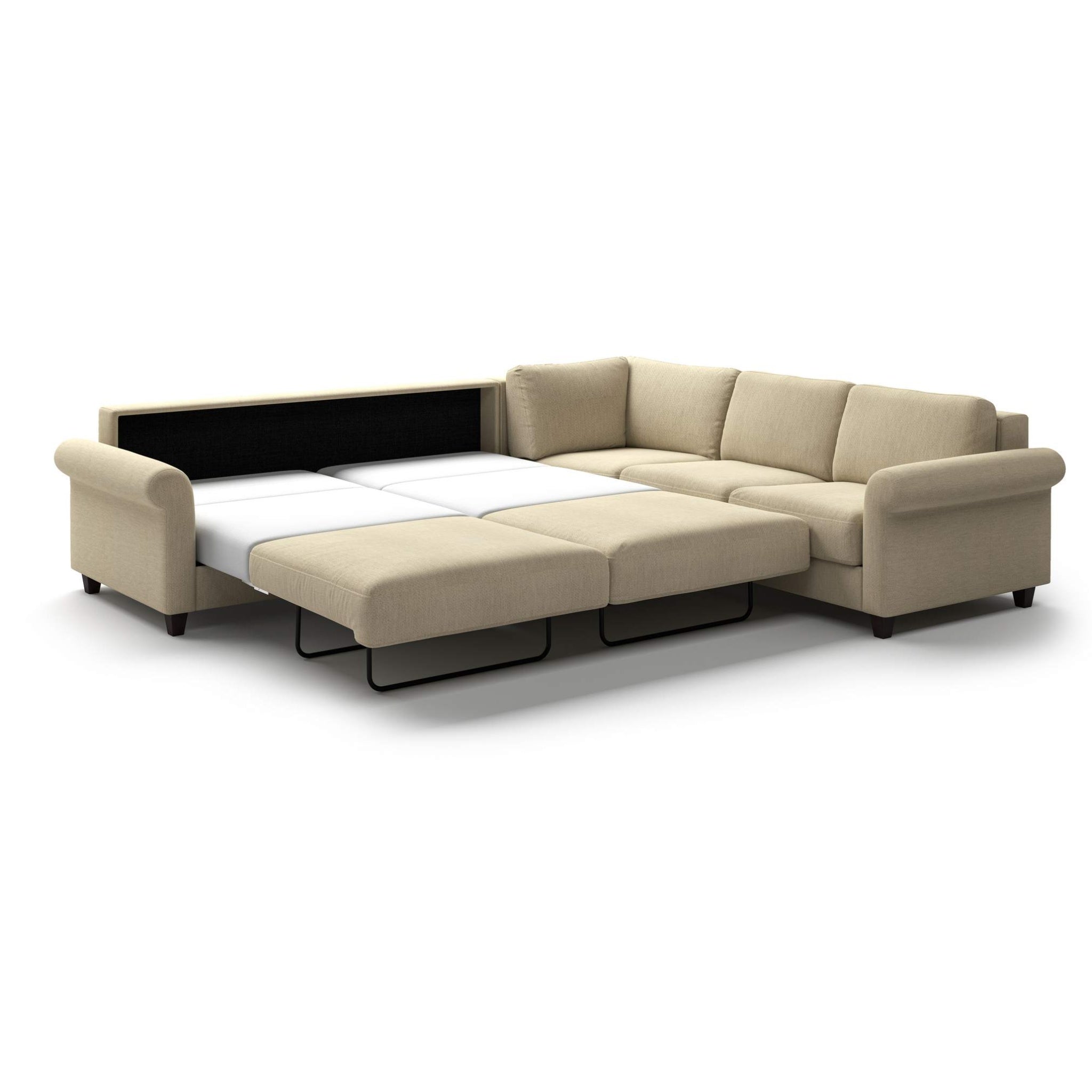 This large sectional features a king size sleeper sofa with a corner and loveseat, within its soft rolled arms. Flexibility is included on this design and can be reversed in either left side or right side configuration.