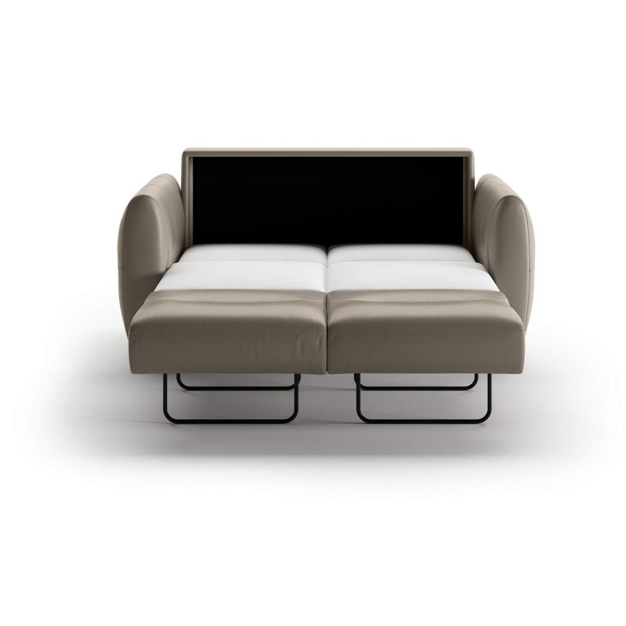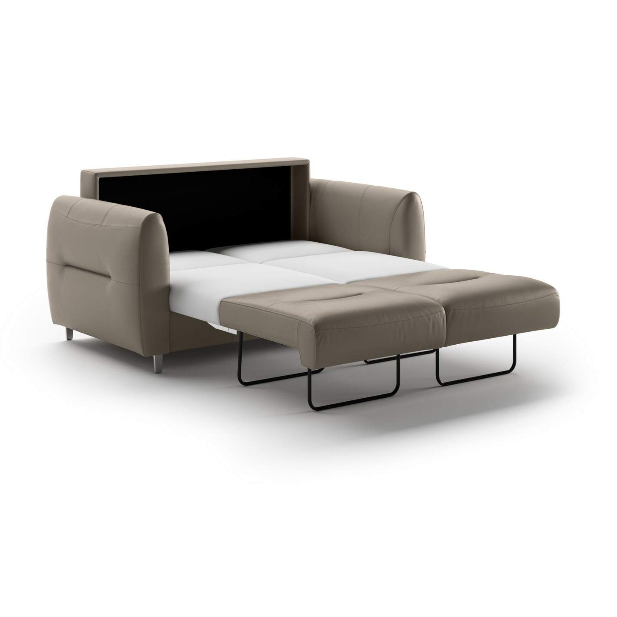 Modern track arms, comfortable seat with under knee support, and its bed nests beneath its seat. This is a world-class style that looks luxurious in leather.