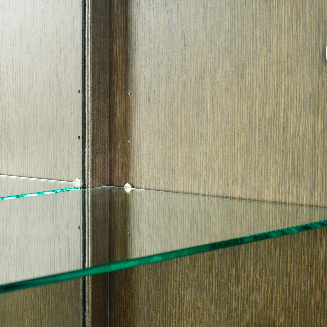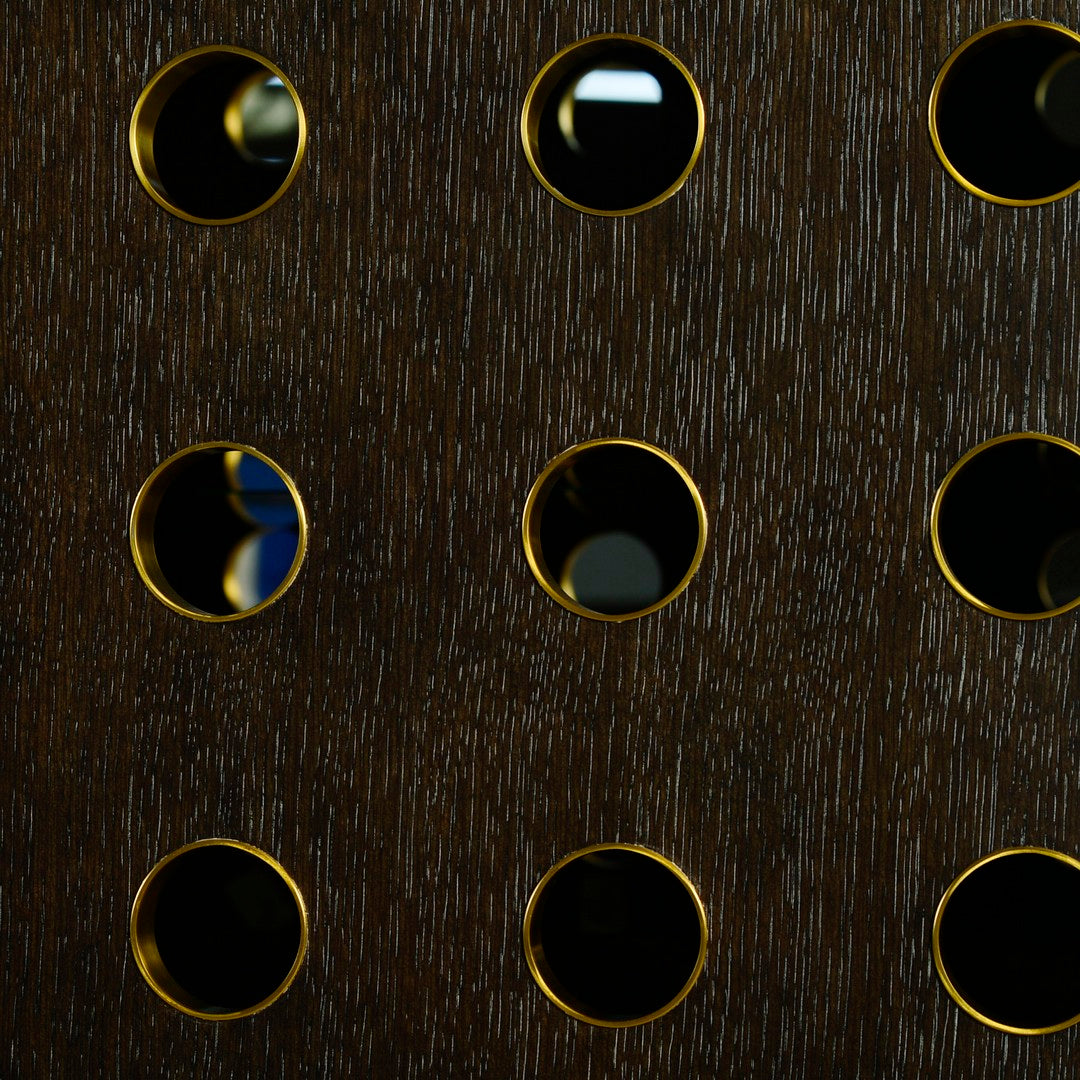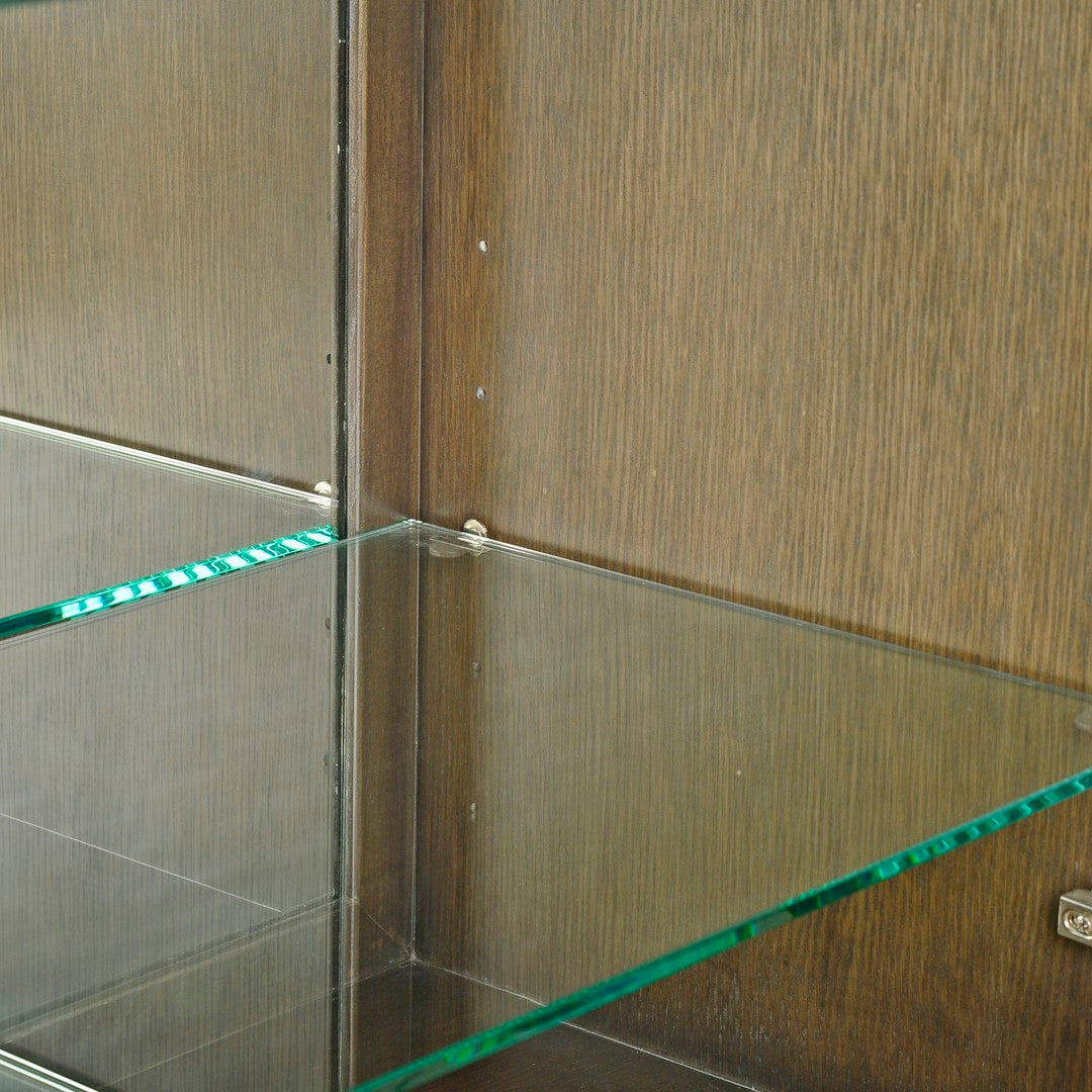 Our Kent China Cabinet features two perforated doors with a burnished brass detail, exterior trim, and base and tempered glass interior shelving; Midnight finish on quarter cut White oak veneer and solids.
