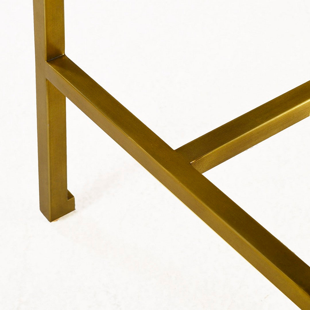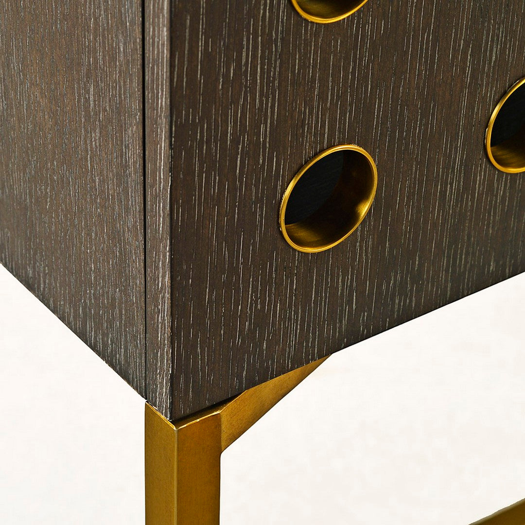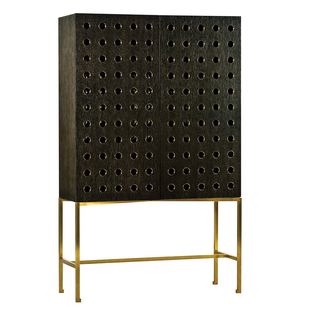 Our Kent China Cabinet features two perforated doors with a burnished brass detail, exterior trim, and base and tempered glass interior shelving; Midnight finish on quarter cut White oak veneer and solids.