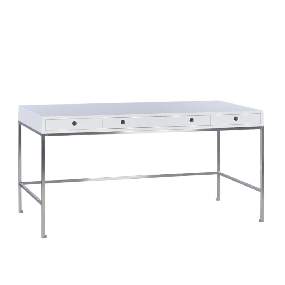 Our Kent Desk features three shallow drawers with metal grommet finger pulls, a metal base, legs, and stretcher