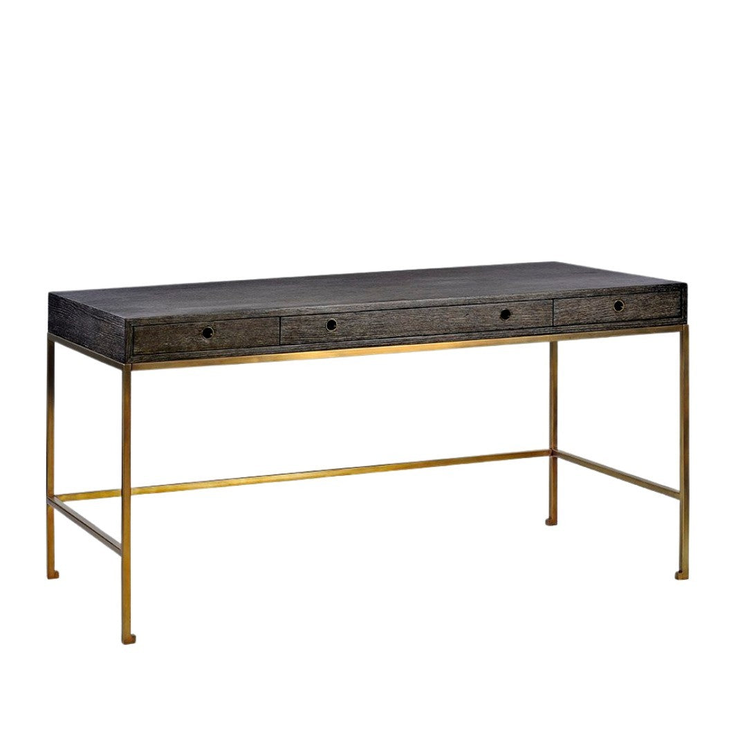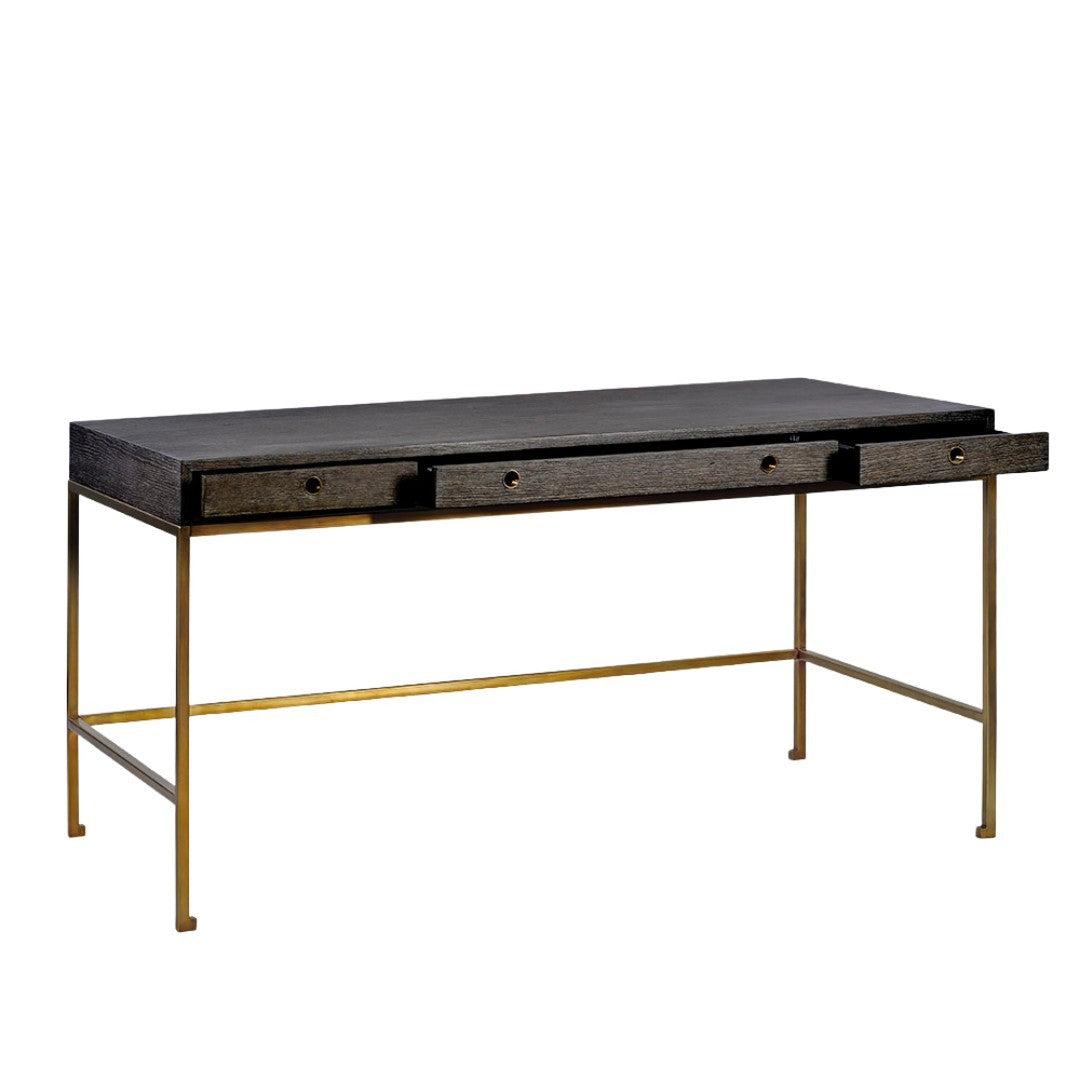 Our Kent Desk features three shallow drawers with metal grommet finger pulls, a metal base, legs, and stretcher
