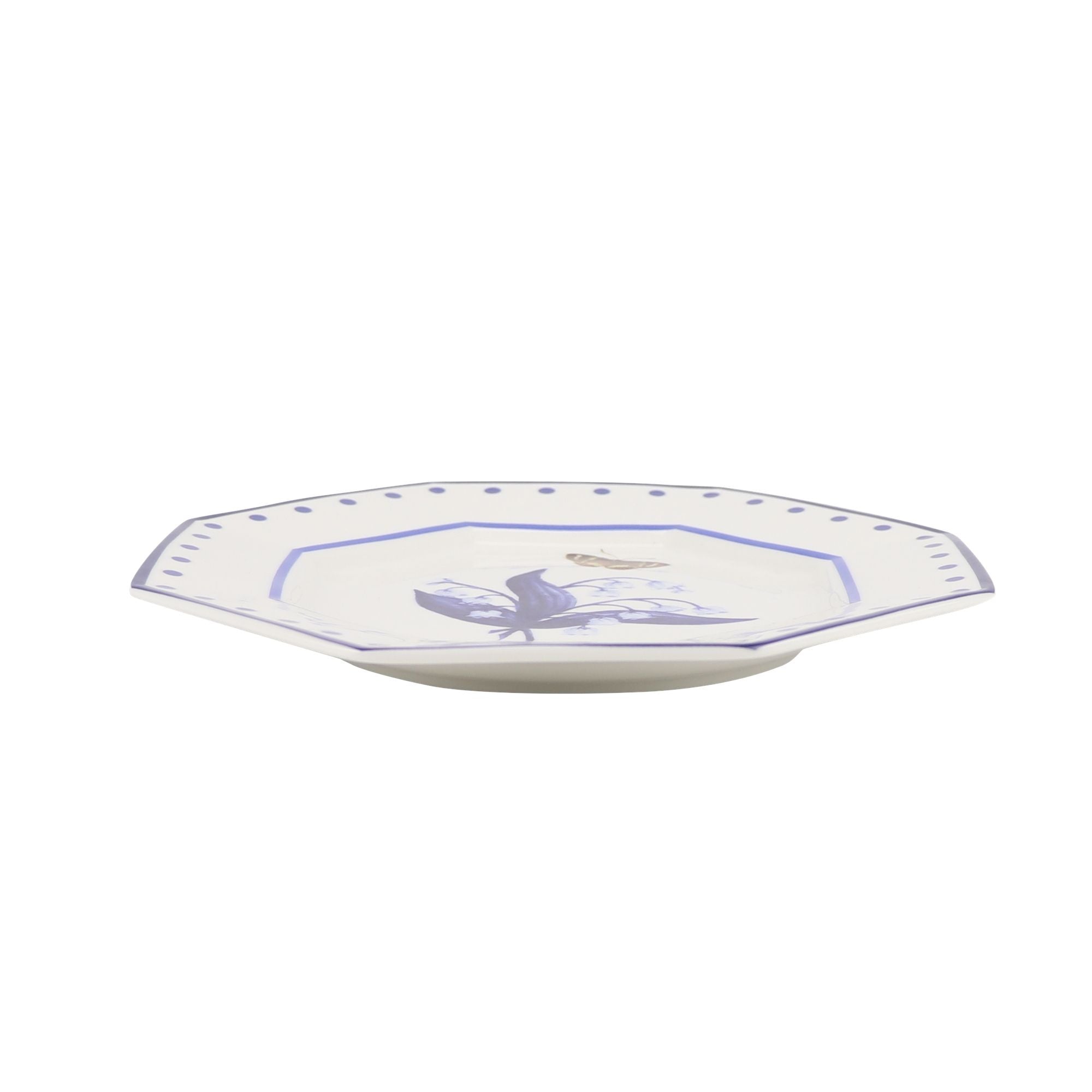The stunning "Lily of the Valley" collection, showcased on our navy and white porcelain plates. Each plate features a beautifully detailed original painting by Carolyne Roehm, depicting an elegant lily of the valley with a delicate butterfly. These plates are designed to add a touch of charm and sophistication to any table setting.