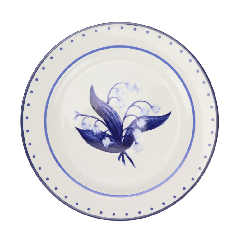 The stunning "Lily of the Valley" collection, showcased on our navy and white porcelain dinner plates. Each plate features a beautifully detailed original painting by Carolyne Roehm, depicting an elegant lily of the valley. These plates are designed to add a touch of charm and sophistication to any table setting.