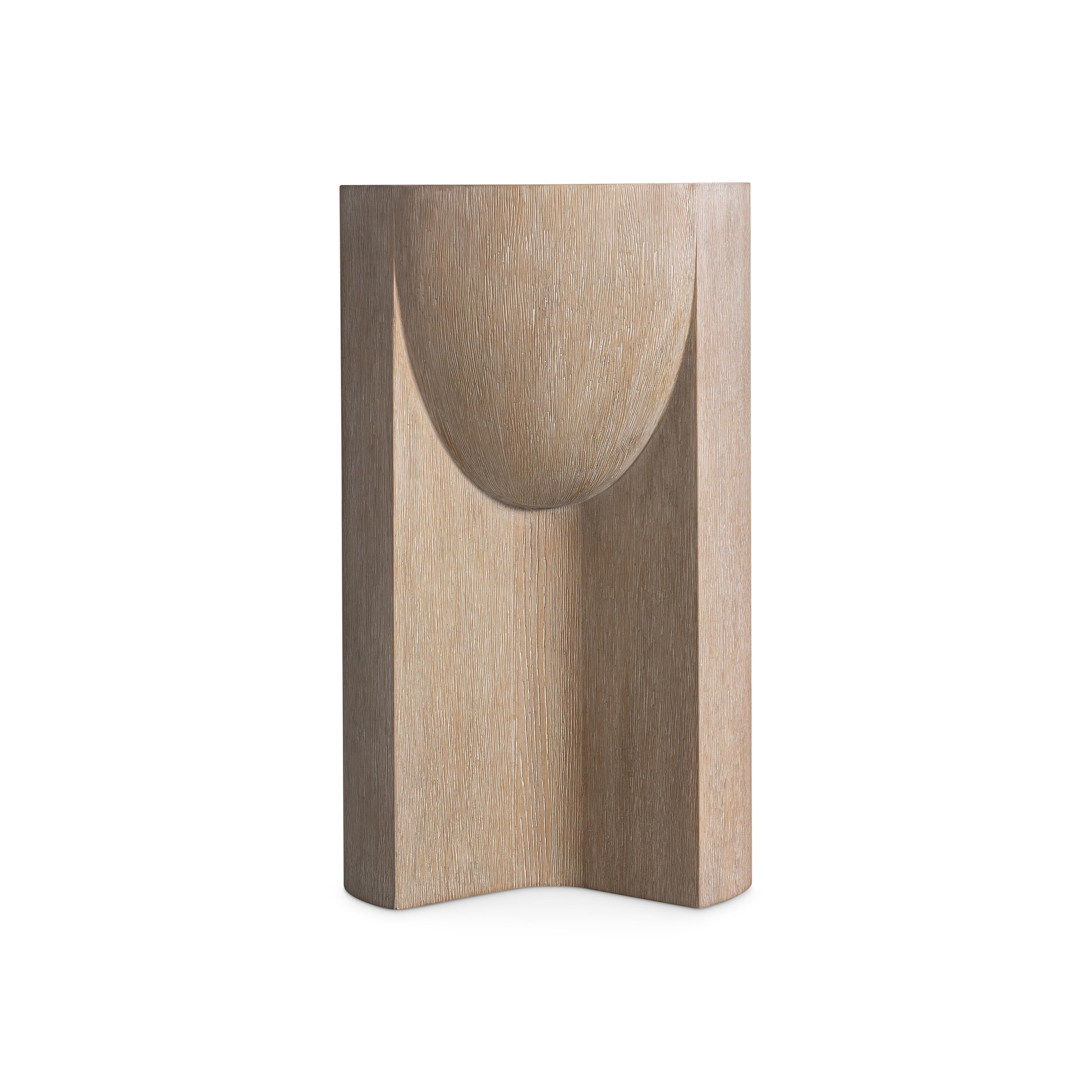 The Loggia side table makes a play for modern styling with a combination of convex and concave shapes. Crafted of resin with a wood grain pattern, the table has the appearance of a bowl resting within straight-lined supports. A shallow basin top adds a soft curve, with the entire design finished in Aria.