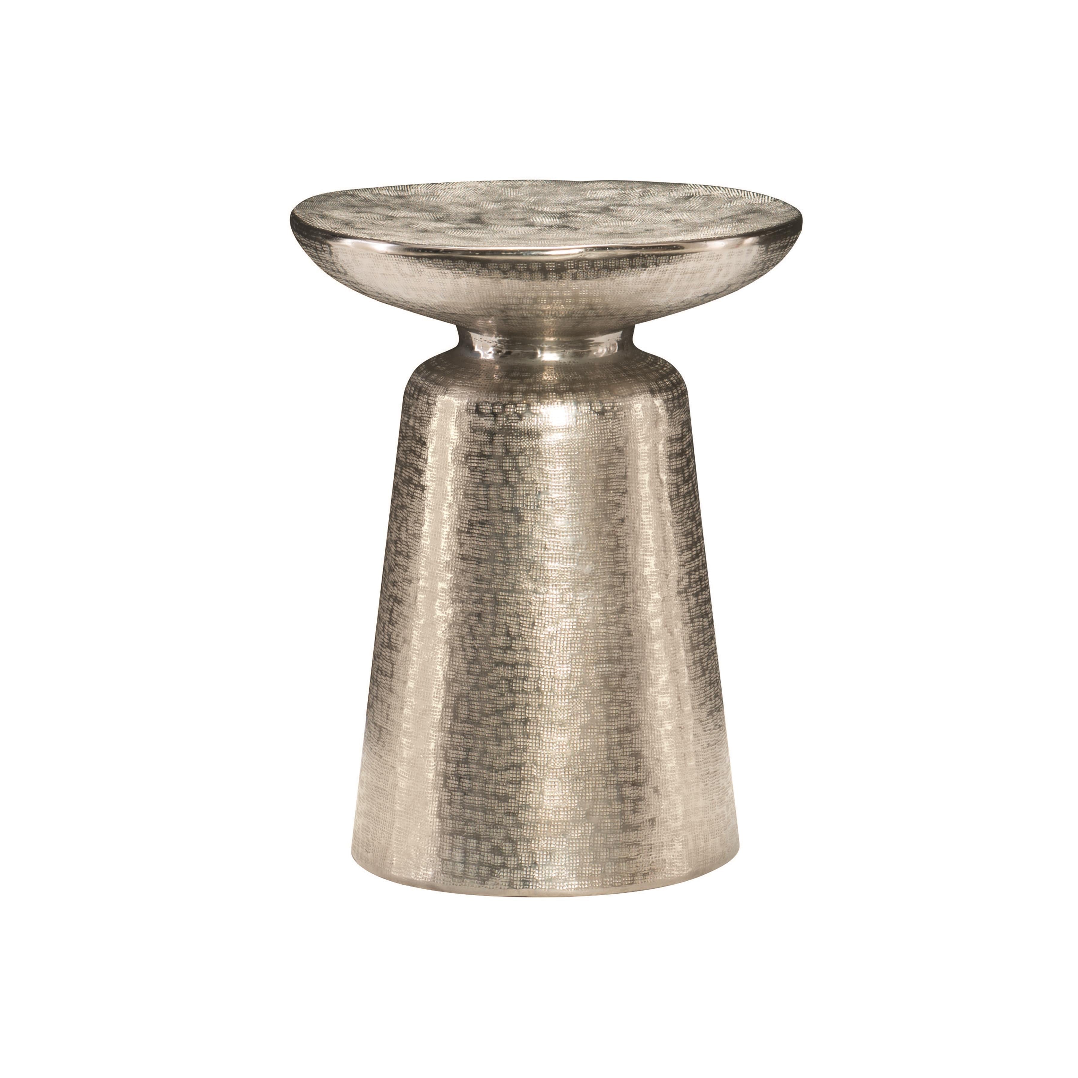 With an intriguing sculptural shape and luminous nickel finish, this round chairside table is an artistic, luxurious accent piece.