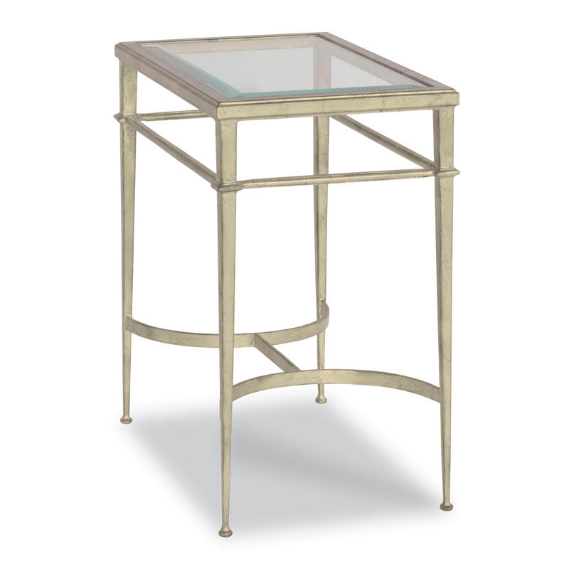 A lovely table inspired by 19th Century French originals featuring a rectangular " ½" beveled glass top that is fitted inside a top frame. The top frame is elevated by gracefully tapering posts, joined by shaped stretchers.