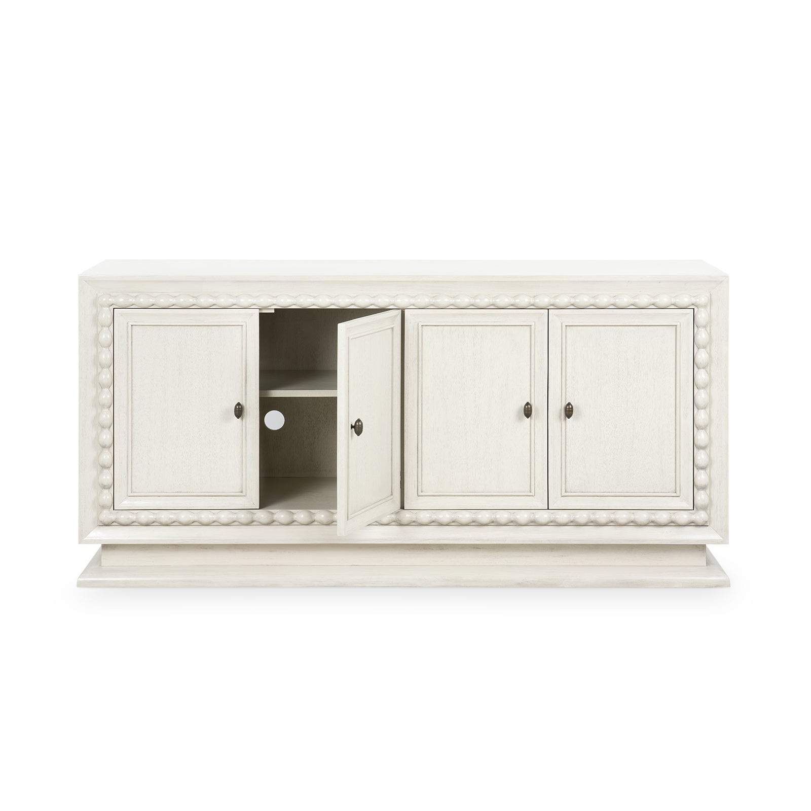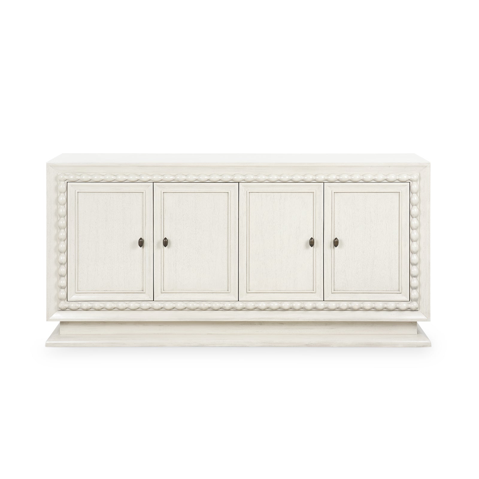 The Maxwell 4-Door Cabinet puts a playful spin on traditional design, blending bold proportions with intricate detailing. Set on a dramatic platform base, its stately silhouette is framed by an oversized beaded trim that outlines all four doors with eye-catching dimension. Striking yet approachable, the Maxwell adds texture and presence while showcasing a modern approach to traditional detailing.