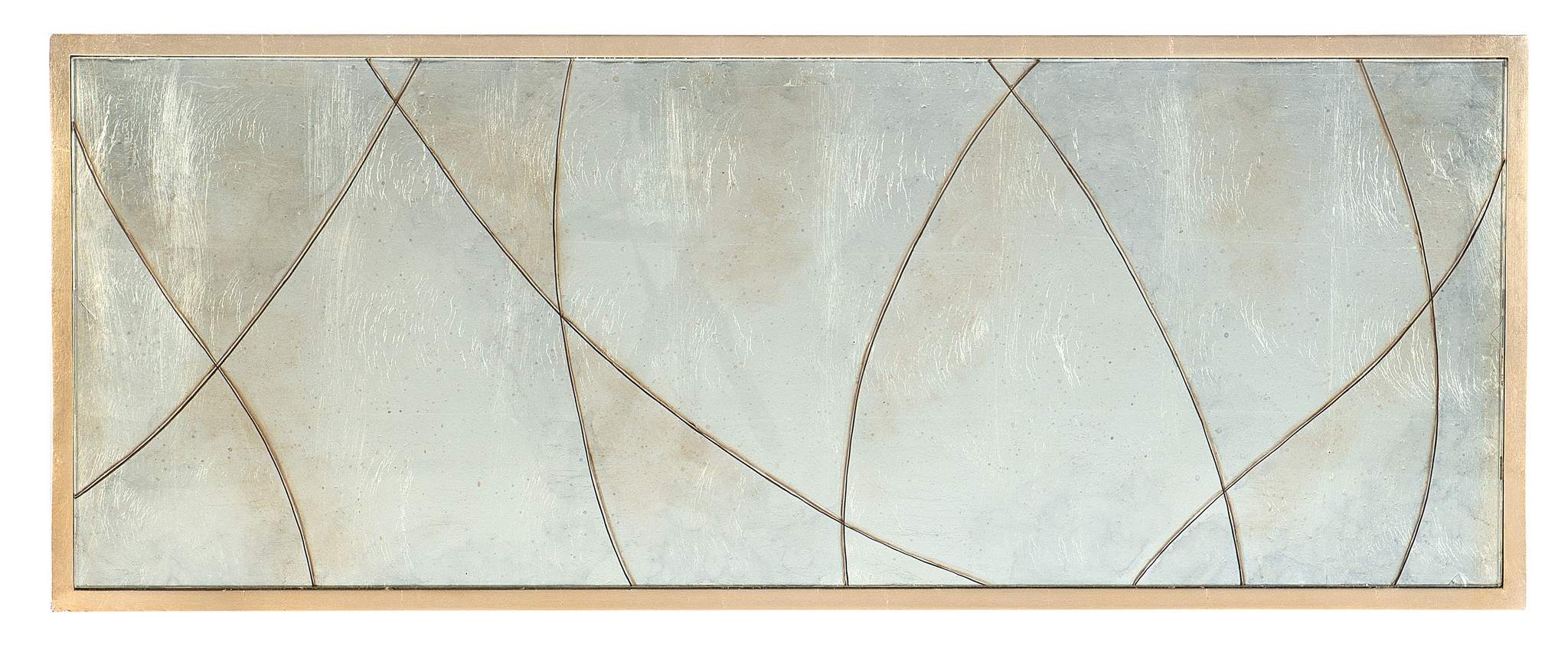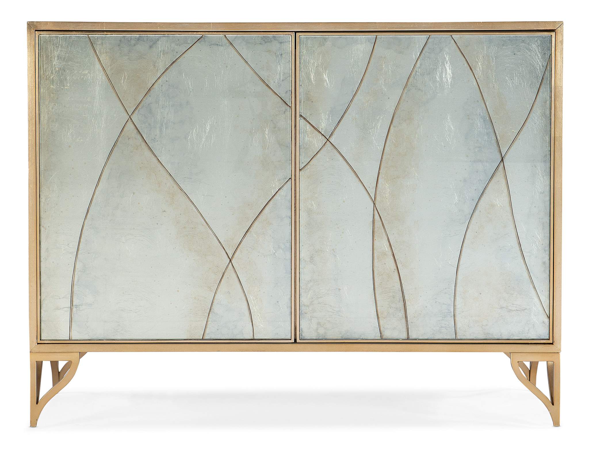 With a delicate organic look, the Joannie Chest has silver leaf eglomise doors featuring a lacey etched pattern, accentuated by a gold frame and base and gray painted interior. The two doors have soft-close hinges and touch latches, with one adjustable shelf behind the pair of doors and a ventilated back panel.