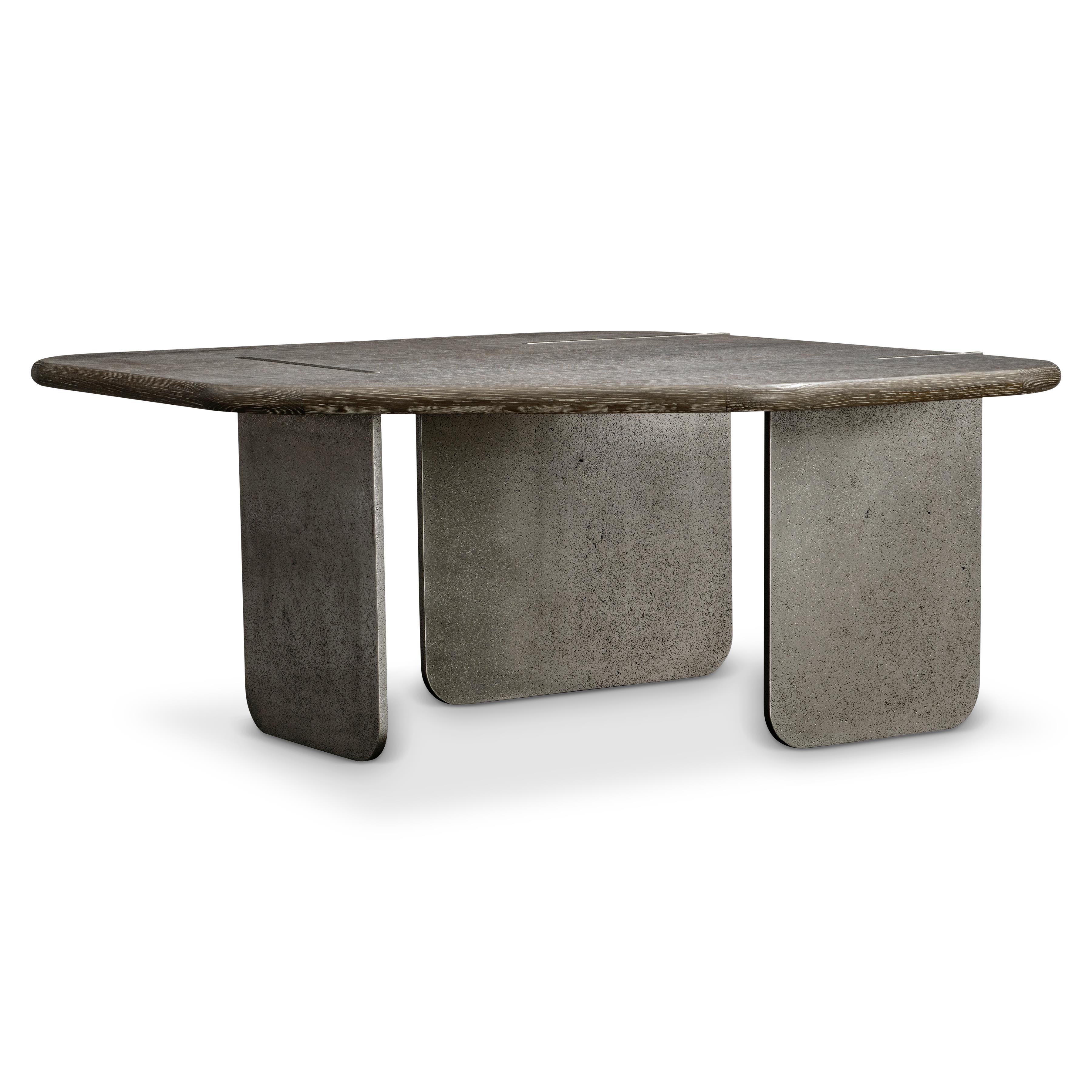 The Melba cocktail table finds itself at the perfect intersection between modern and rustic styles. Three textured cast aluminum panels finished in Graphite pierce the top. The uniquely shaped wood surface is wirebrushed for texture and finished in Puma.