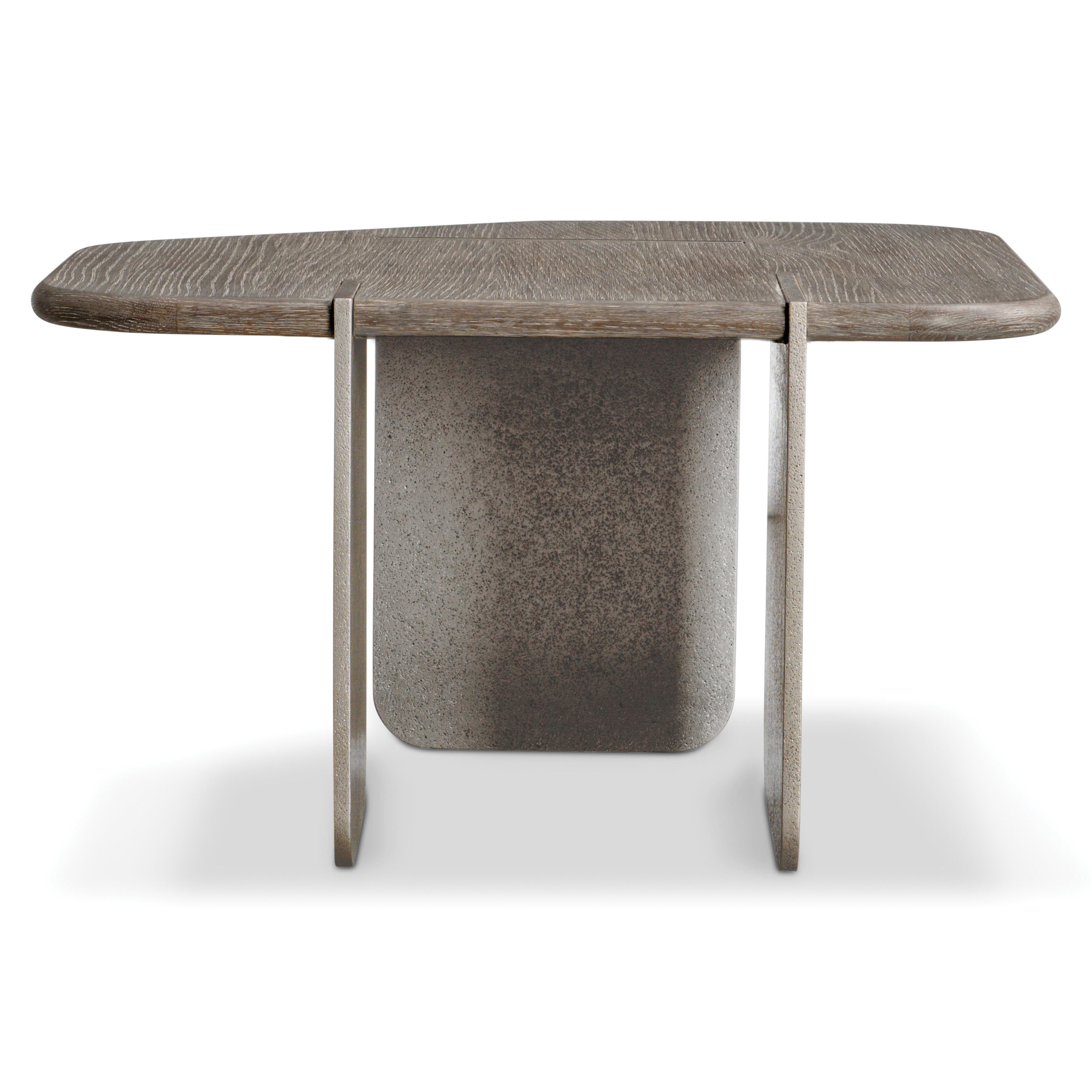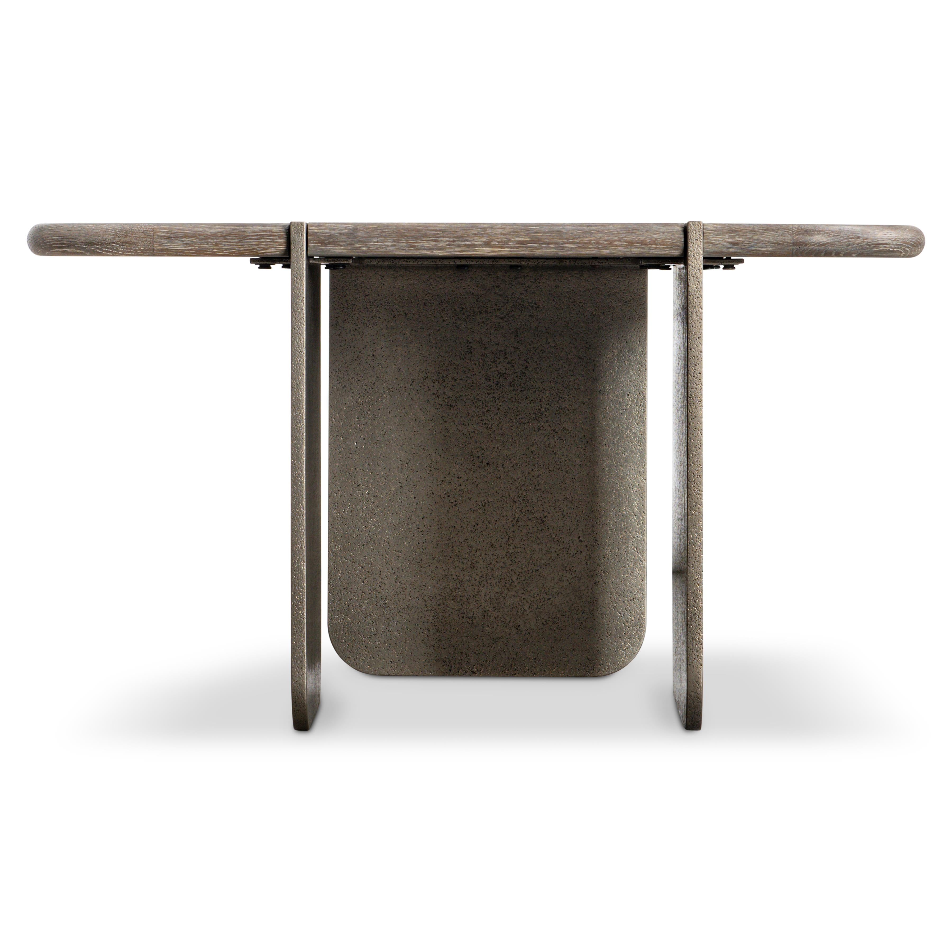 The Melba cocktail table finds itself at the perfect intersection between modern and rustic styles. Three textured cast aluminum panels finished in Graphite pierce the top. The uniquely shaped wood surface is wirebrushed for texture and finished in Puma.