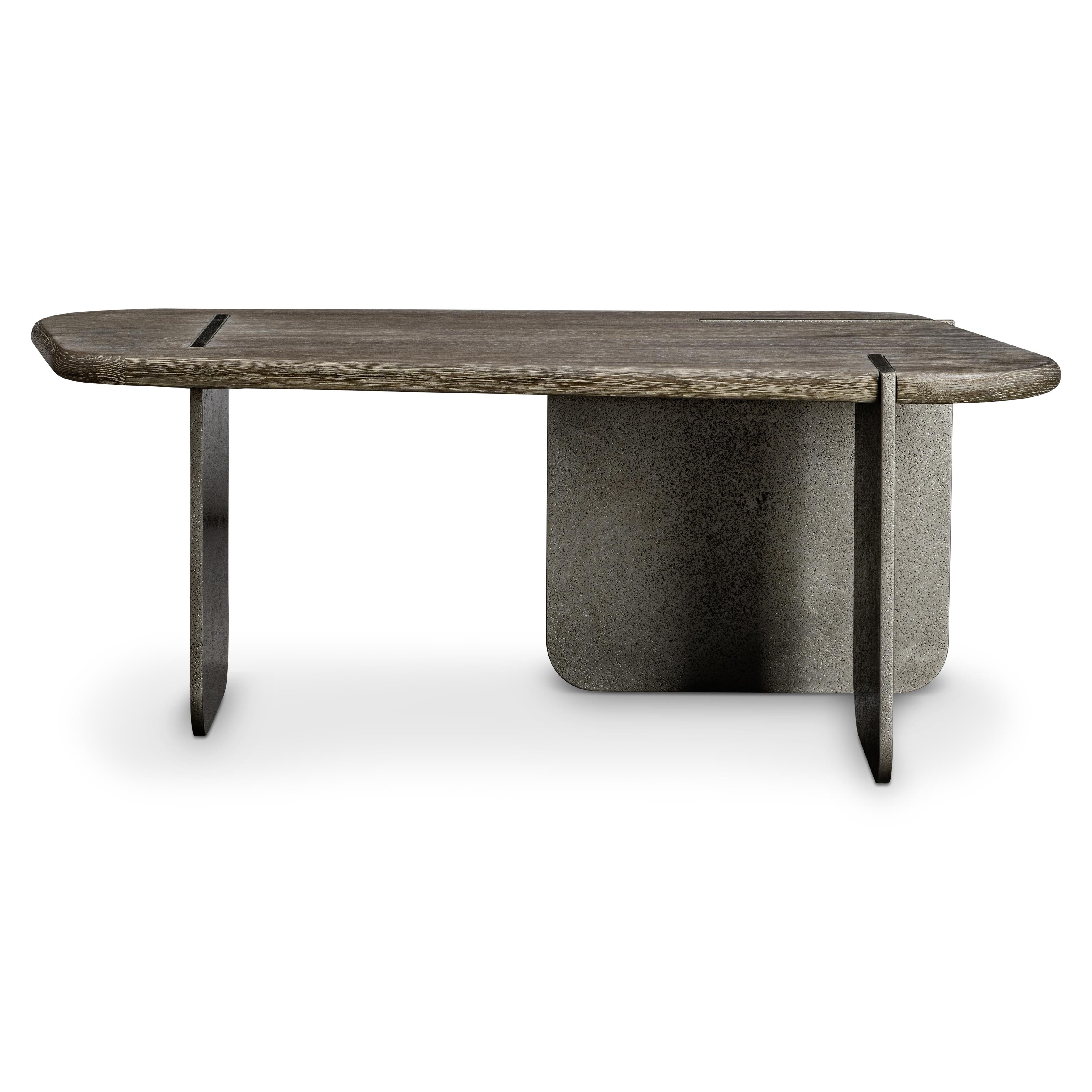 The Melba side table finds itself at the perfect intersection between modern and rustic styles. Three textured cast aluminum panels finished in Graphite pierce the top. The uniquely shaped wood surface is wirebrushed for texture and finished in Puma. The side table can be used to create a multilevel look with the Melba cocktail table.
