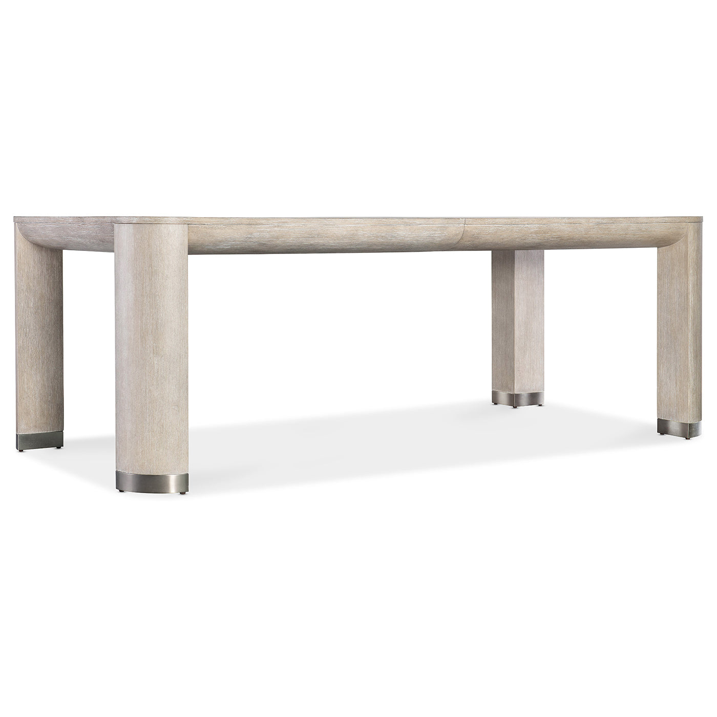Inspired by decades of design movements with an unmistakably modern aesthetic that transcends time, the Modern Mood Leg Dining Table is a striking, softly sophisticated profile. Featuring a rounded table apron and corners, matched veneers on the top and metal banding accents on the legs in a warm pewter finish, it is crafted of Quartered Oak Veneers in a Diamond Finish with crystal-like alabaster hues. With one 24-inch leaf, the table extends up to 110 inches long. - Color: Light Brown - One 24-inch leaf