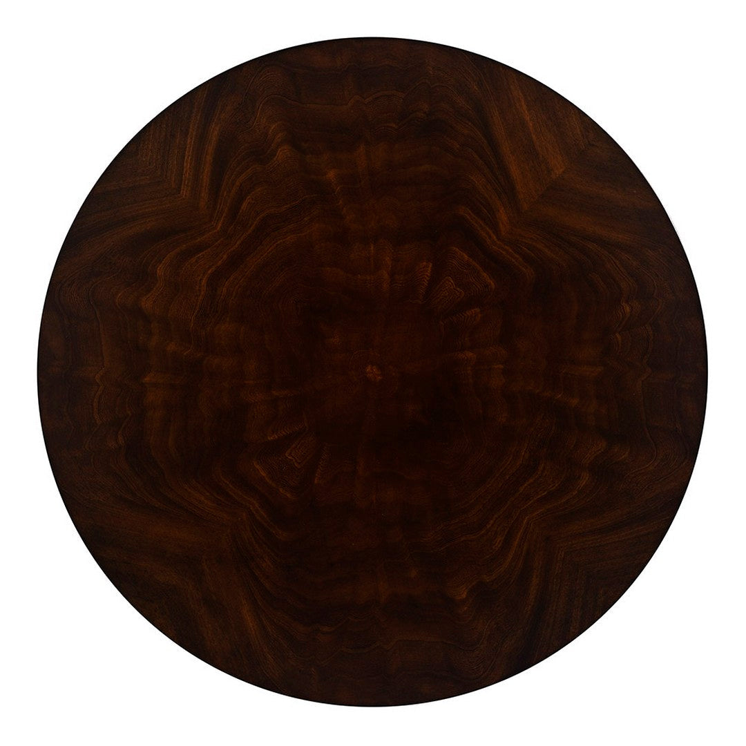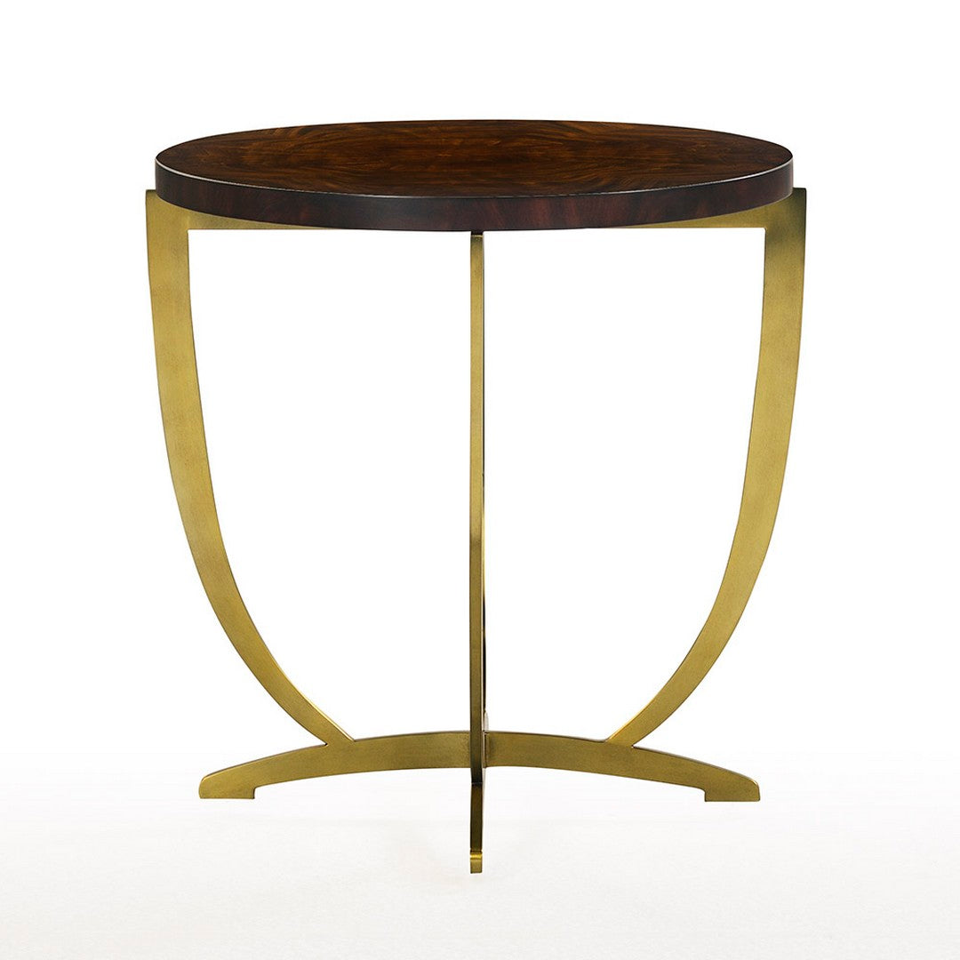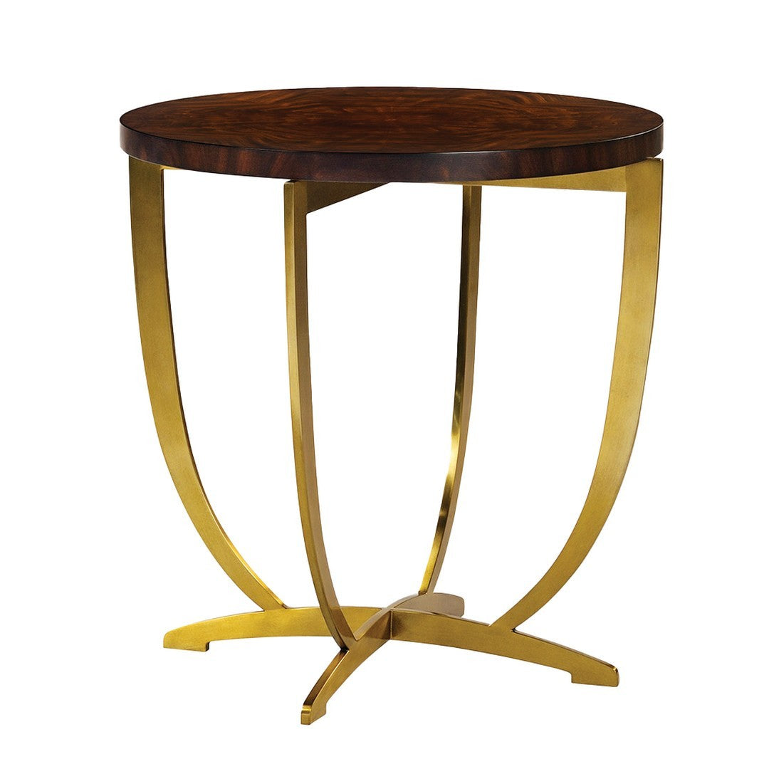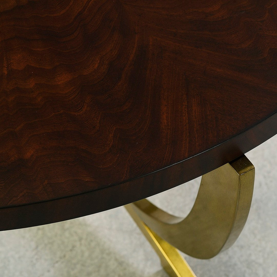 Our Park Place Side Table features a smooth top and a shaped base; Syrup finish on Mahogany crotch veneer and solids.