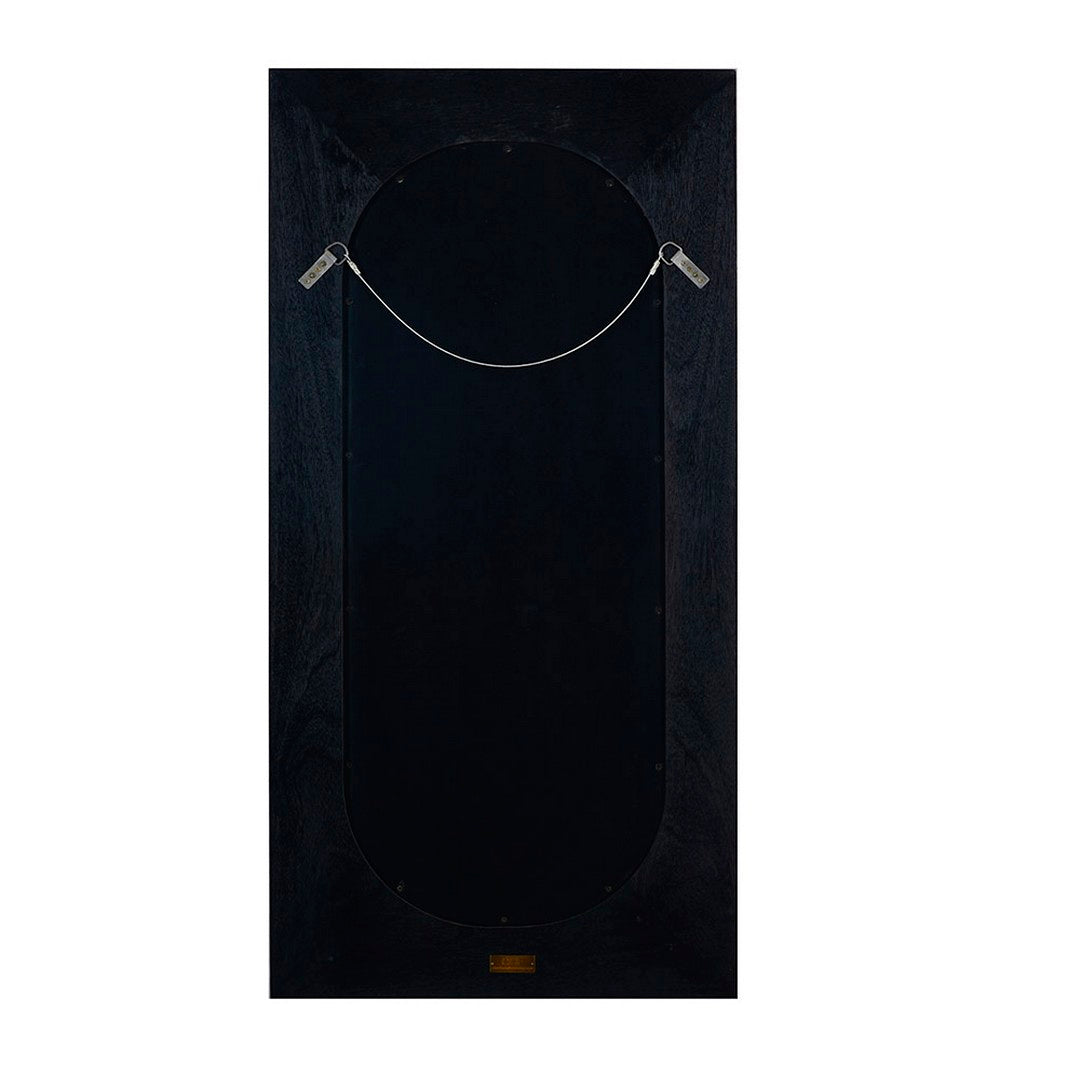 Our Portal Mirror features a "racetrack" shaped mirror set in a rectangular wood frame with a brass trim detail