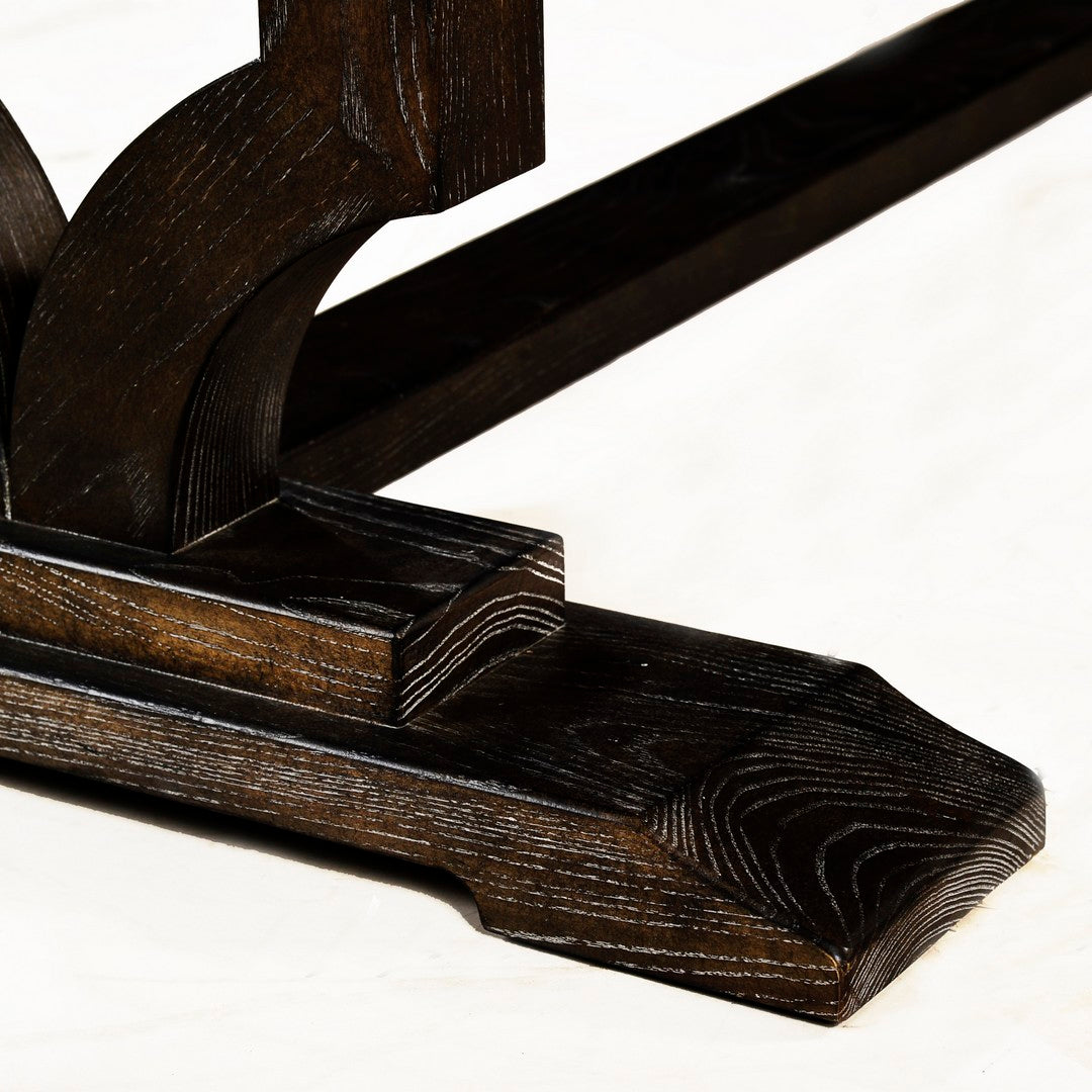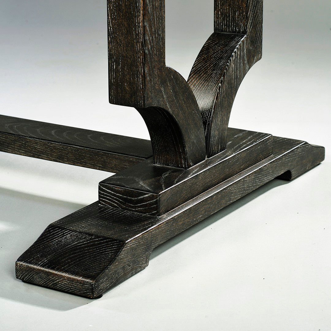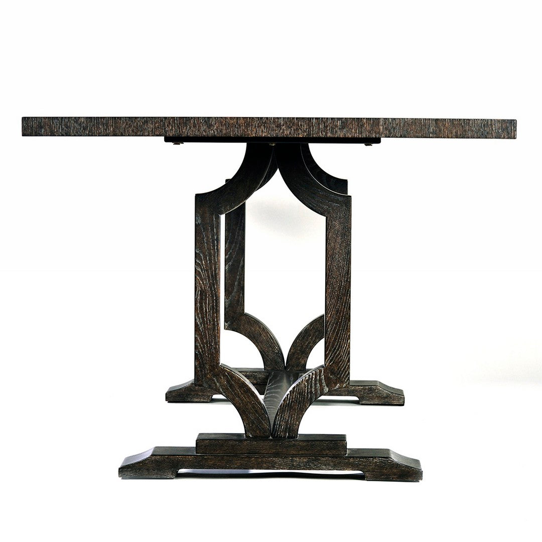 Our Portia Dining Table features a smooth, rectangular top and a portrait shaped pedestal base