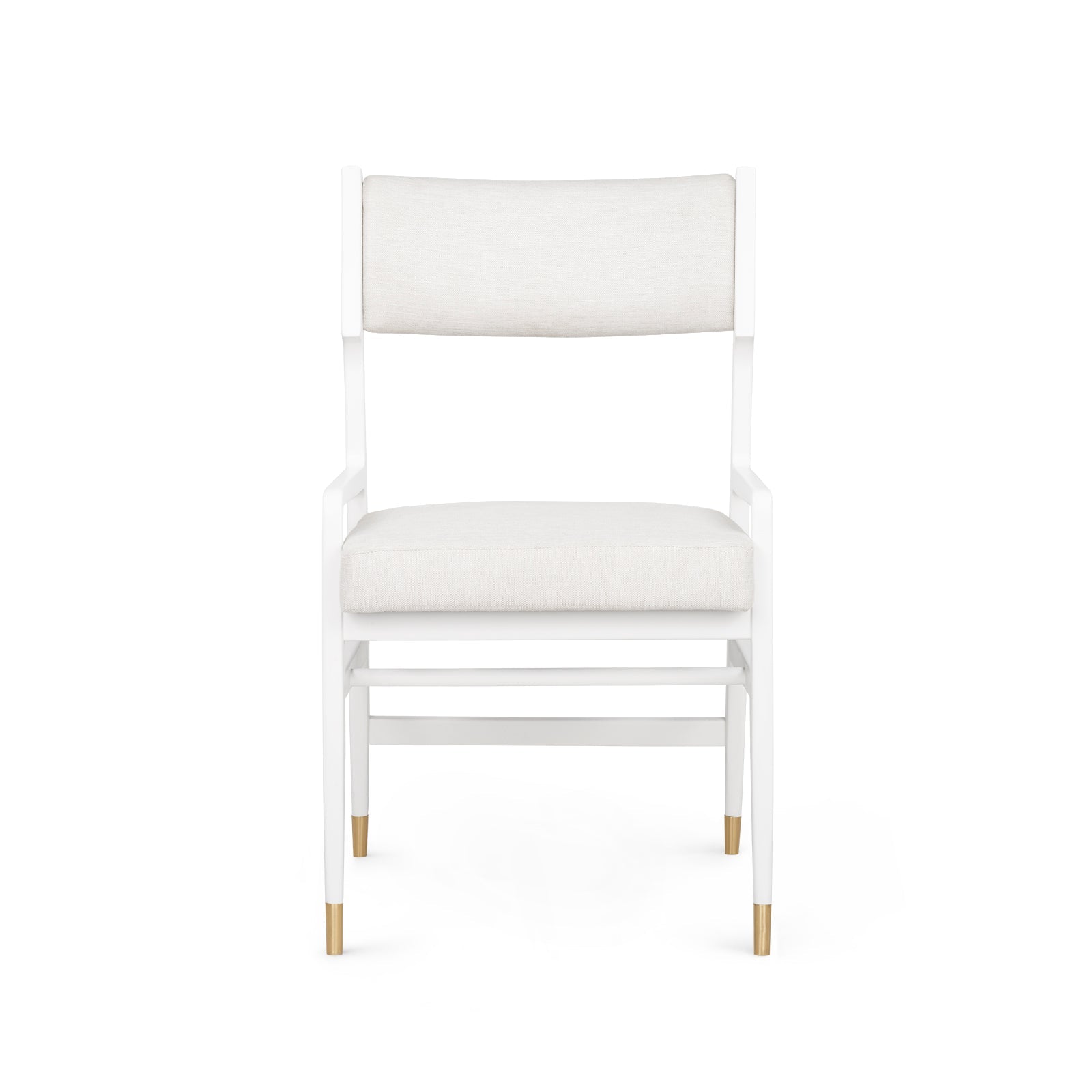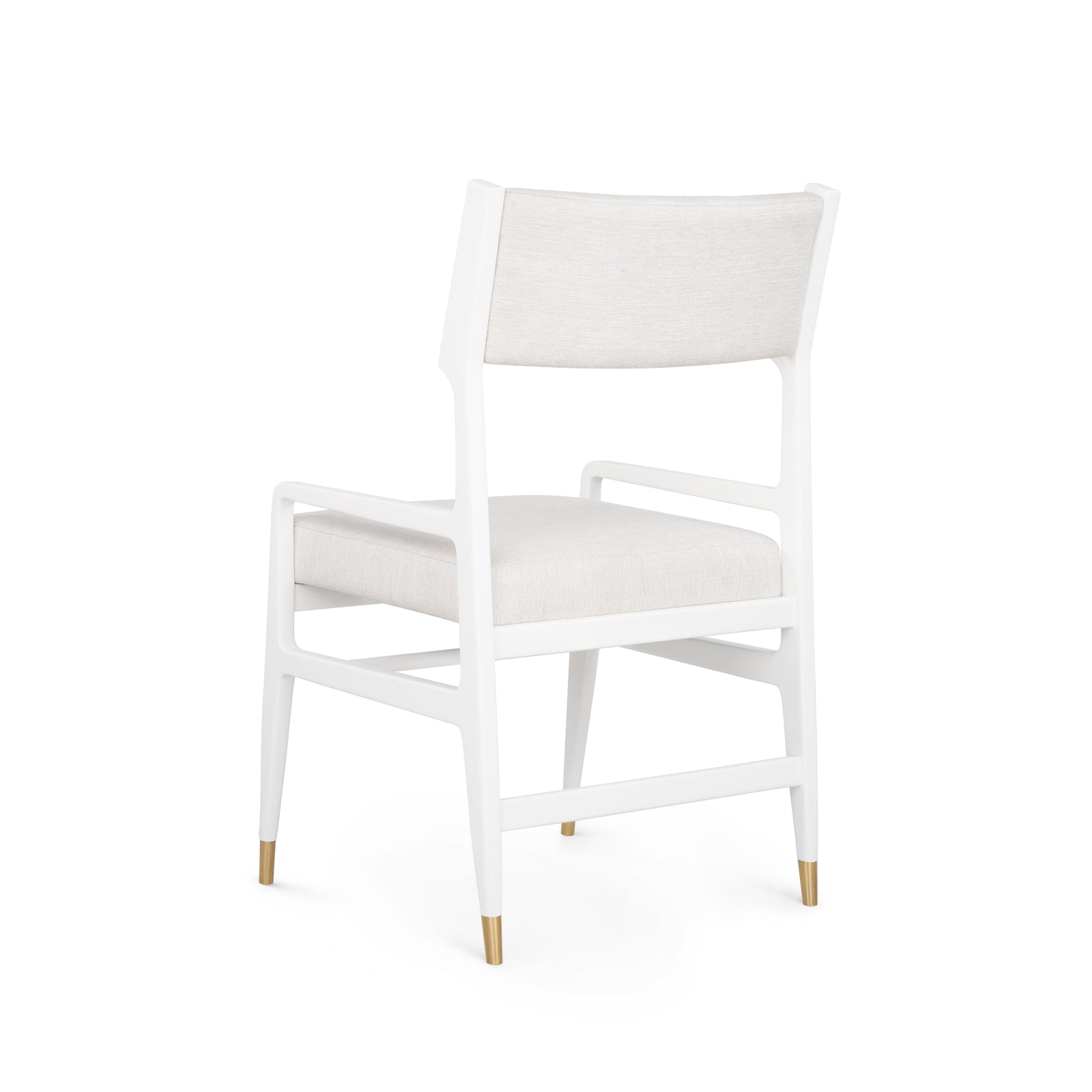 The Renata Chair offers a roomier take on contemporary Scandinavian-inspired design. Crafted from solid mahogany and finished in crisp white lacquer, its wider frame features a floating back cushion, matching drop-in seat, and architectural base with alternating stretchers and tapered legs. Polished brass sabots add a hint of shine, while the expanded silhouette delivers extra comfort without compromising on style.