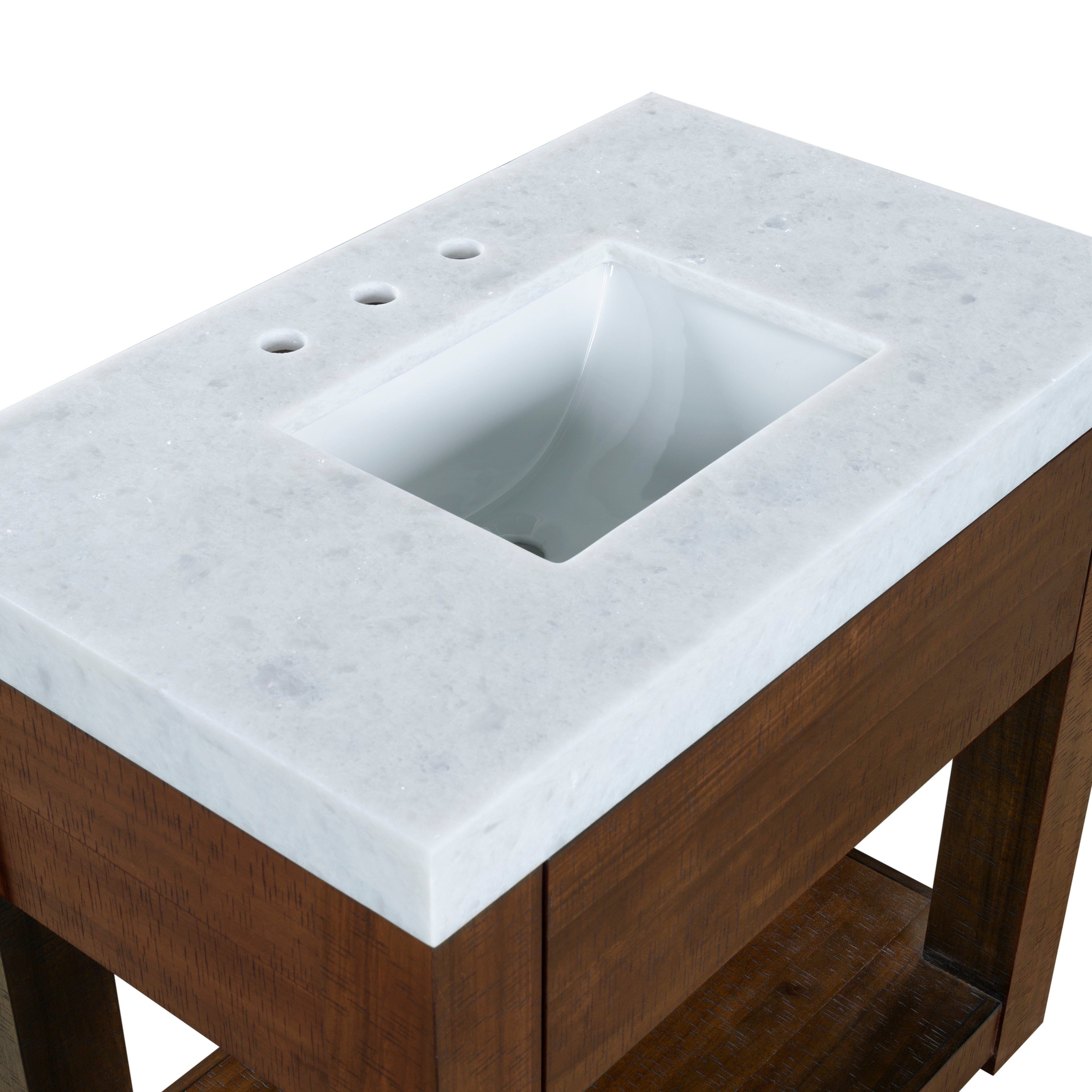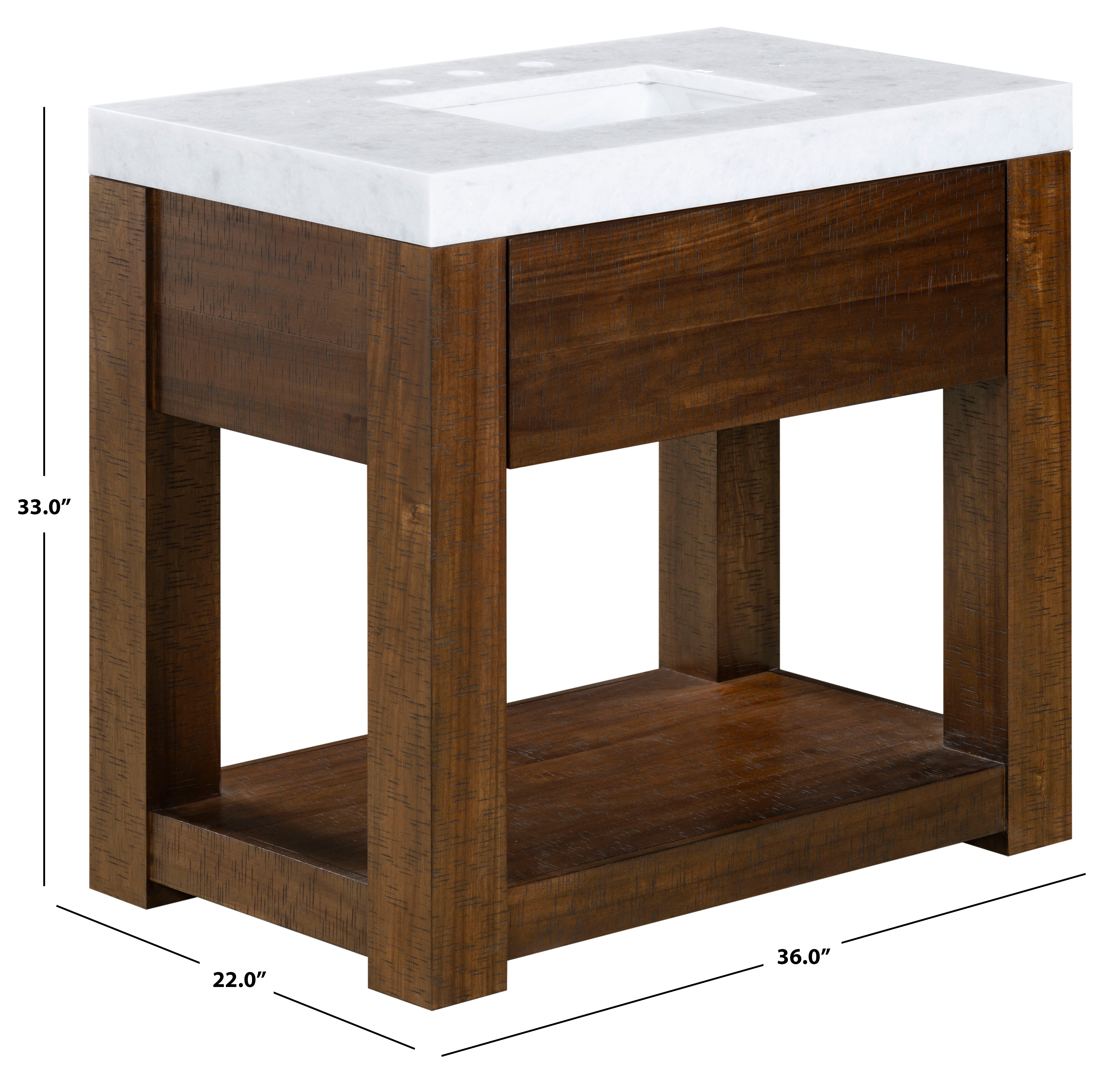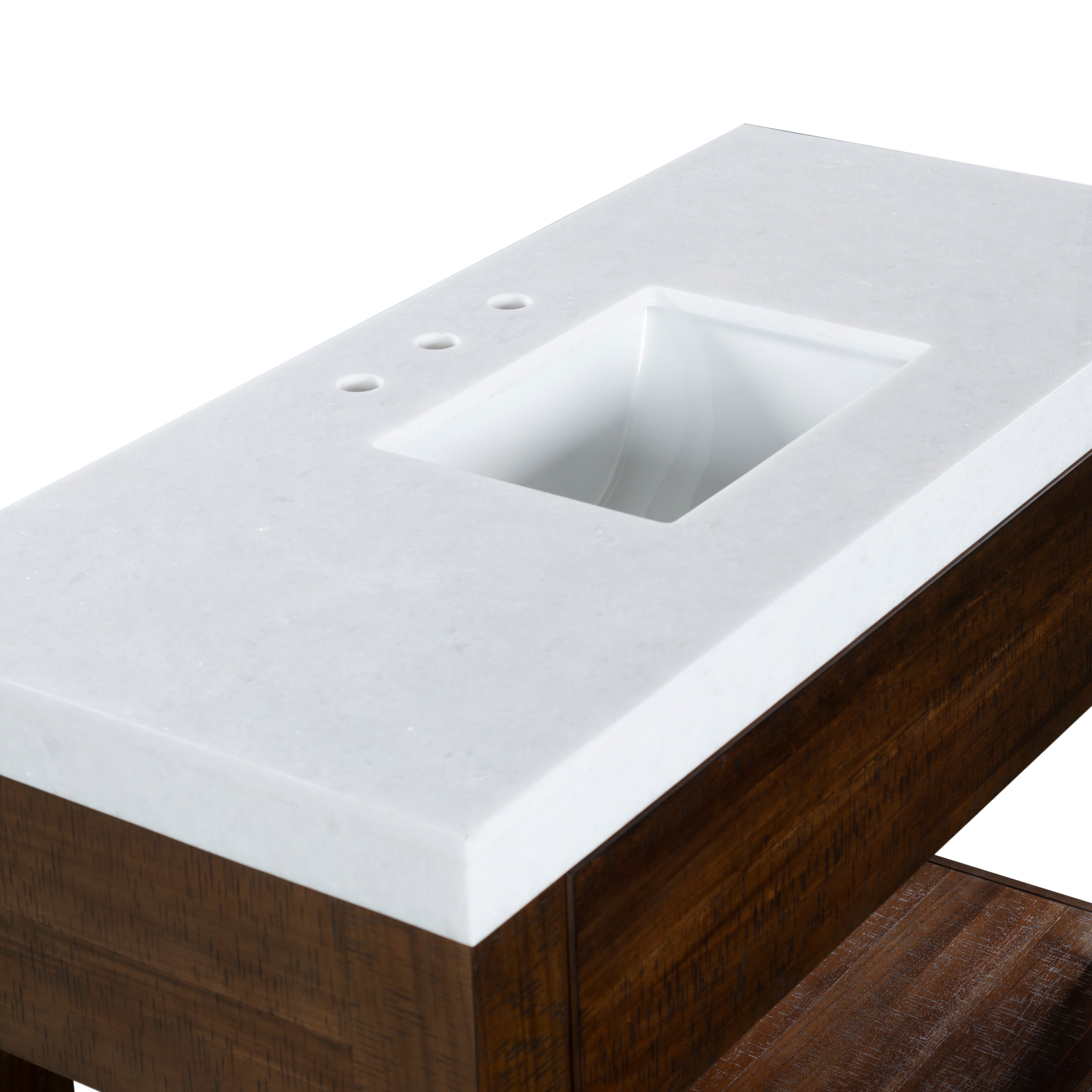 Transform your bathroom into a haven of style and practicality with the Alberto vanity. Embrace the classic charm of walnut complemented by elegant white accents. Crafted from durable wood, the vanity offers a sturdy foundation, while the sleek marble countertop elevates its visual appeal. The integrated ceramic sink provides seamless functionality and easy maintenance. This furniture piece combines natural hues with contemporary design, creating a timeless addition to any bathroom decor. The Alberto vanity offers ample storage space to organize your essentials effortlessly, keeping your space tidy and clutter free. Its design and functionality make it an ideal choice for those seeking an upgrade that balances elegance and utility. Elevate your daily routine with the touch of sophistication that comes with the intelligent design of the Alberto vanity. Find the harmony between practicality and style in this bathroom centerpiece and revitalize the heart of your home with ease and grace.