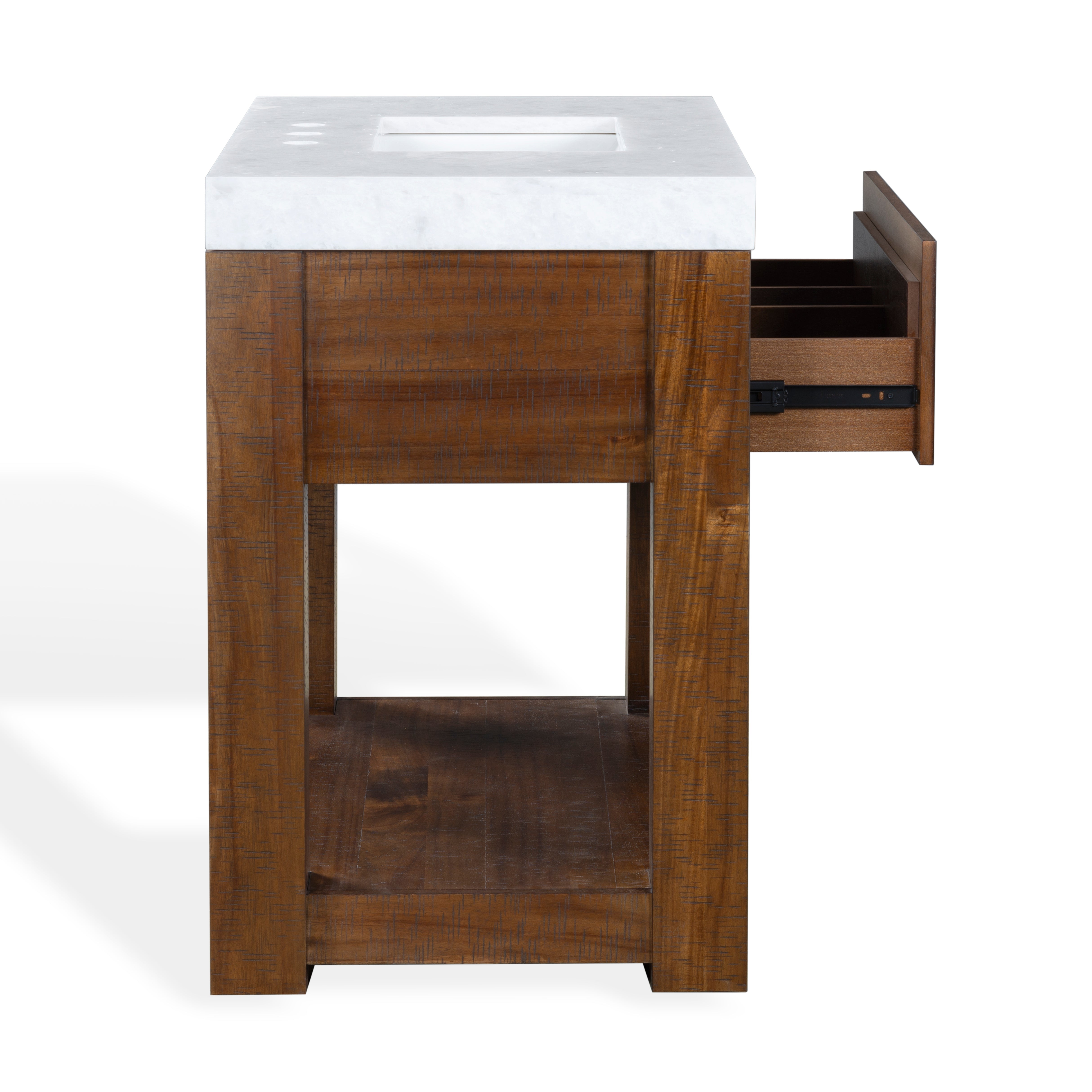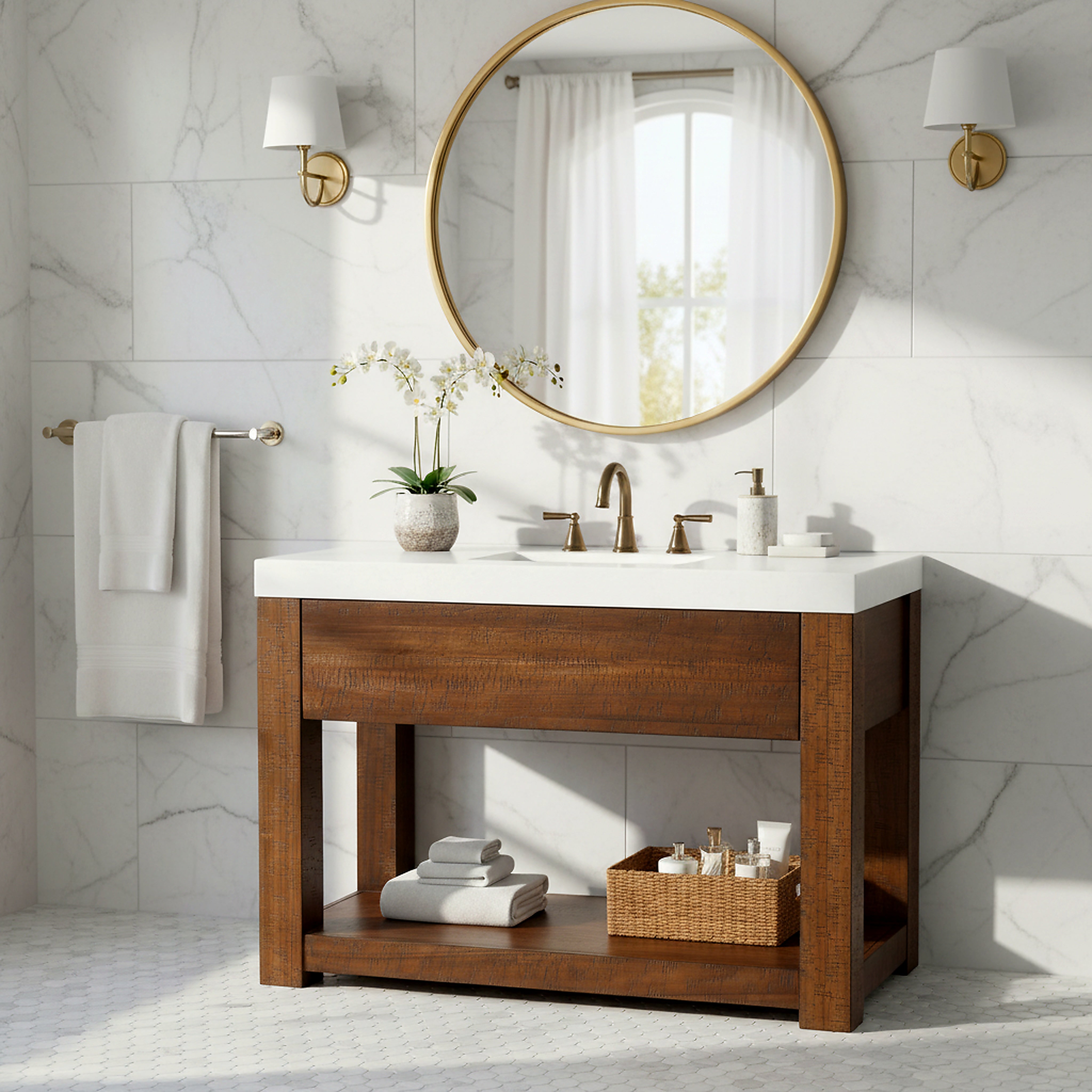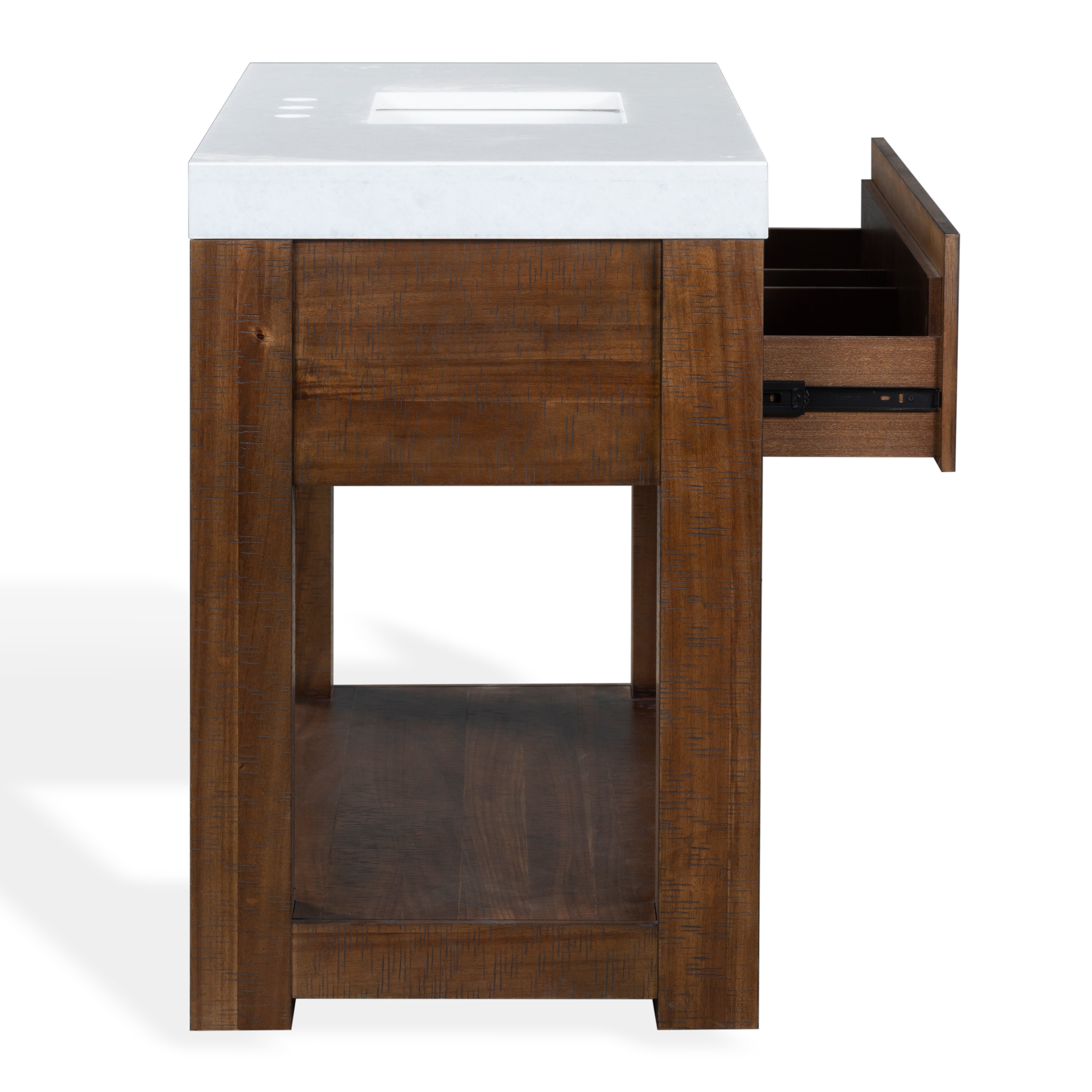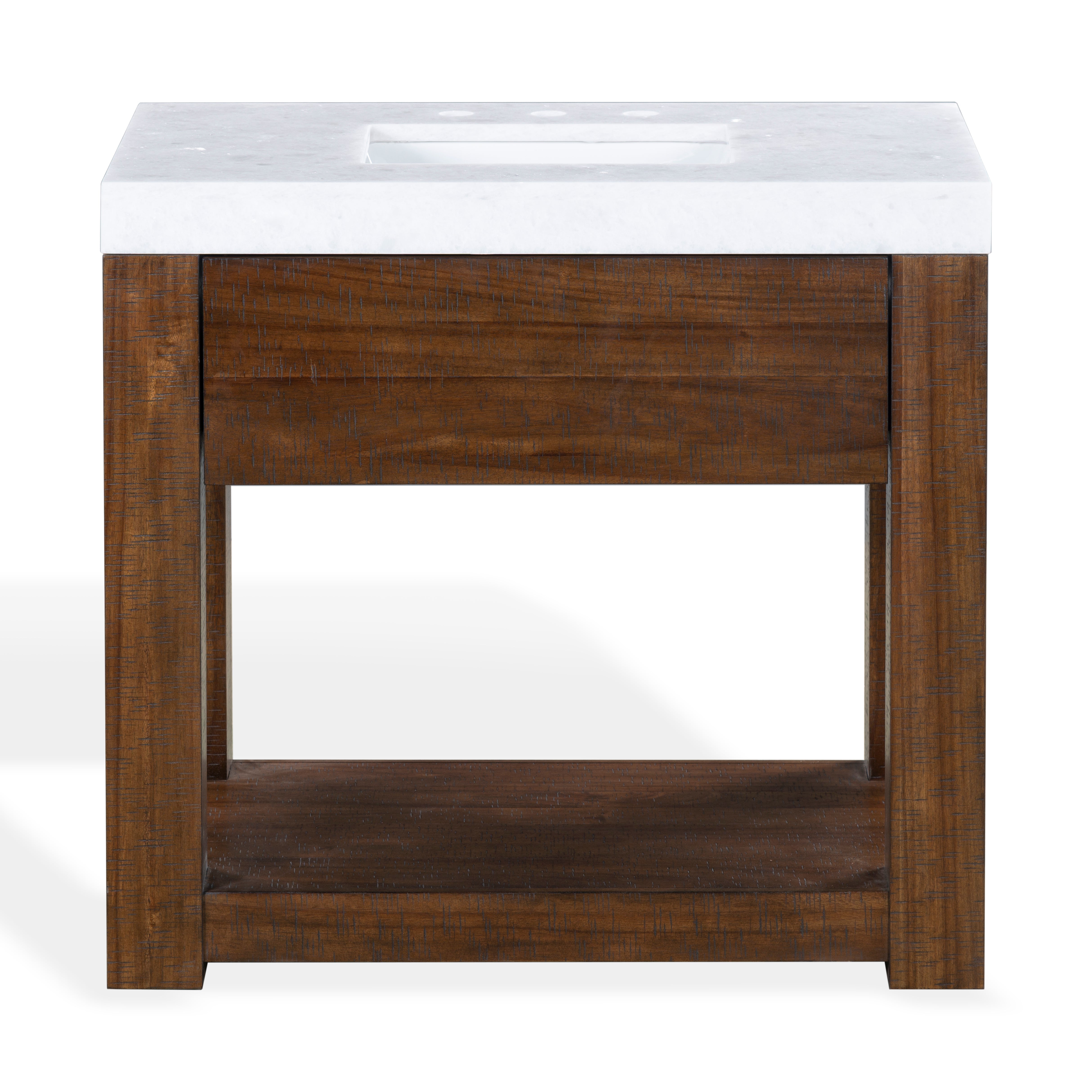 Transform your bathroom into a haven of style and practicality with the Alberto vanity. Embrace the classic charm of walnut complemented by elegant white accents. Crafted from durable wood, the vanity offers a sturdy foundation, while the sleek marble countertop elevates its visual appeal. The integrated ceramic sink provides seamless functionality and easy maintenance. This furniture piece combines natural hues with contemporary design, creating a timeless addition to any bathroom decor. The Alberto vanity offers ample storage space to organize your essentials effortlessly, keeping your space tidy and clutter free. Its design and functionality make it an ideal choice for those seeking an upgrade that balances elegance and utility. Elevate your daily routine with the touch of sophistication that comes with the intelligent design of the Alberto vanity. Find the harmony between practicality and style in this bathroom centerpiece and revitalize the heart of your home with ease and grace.