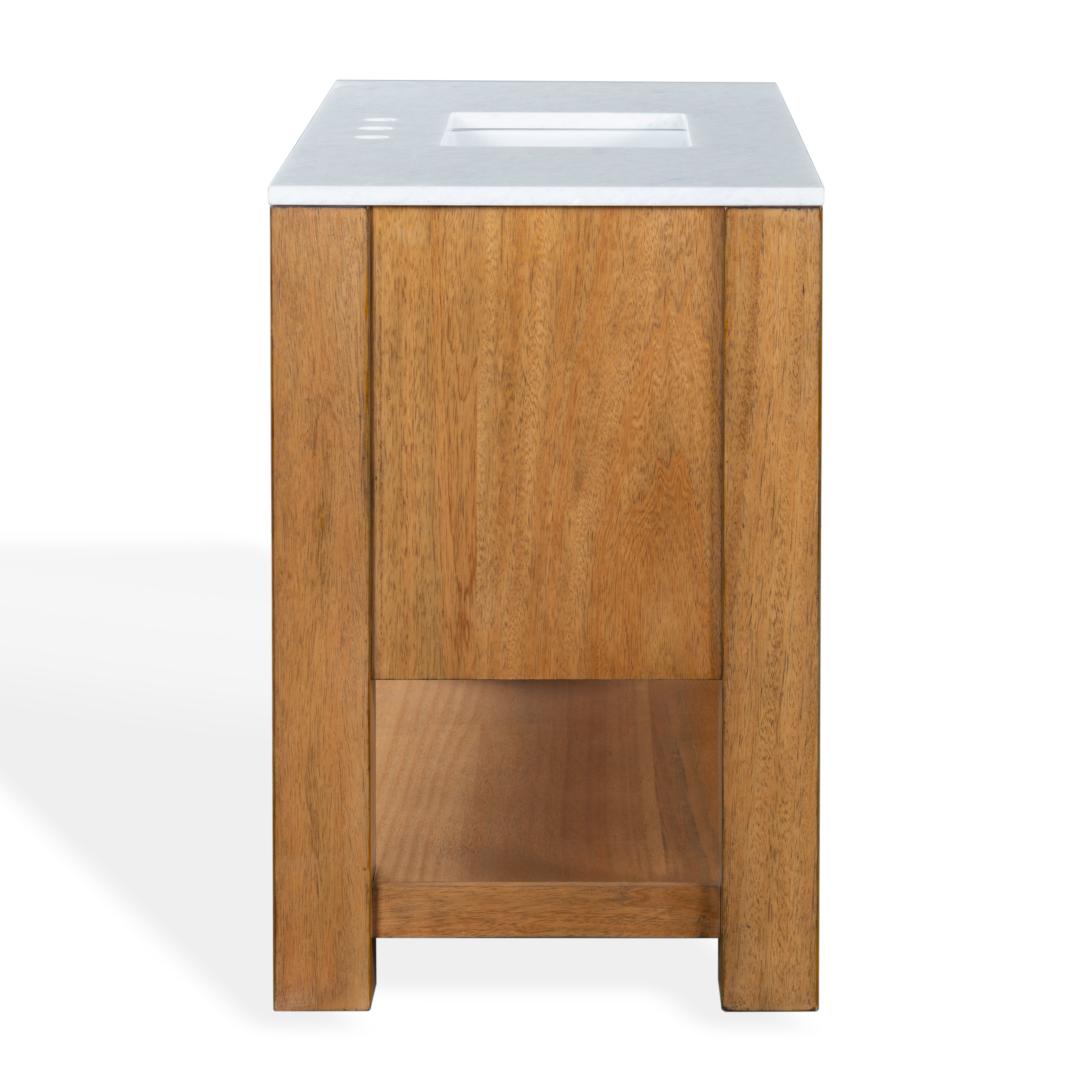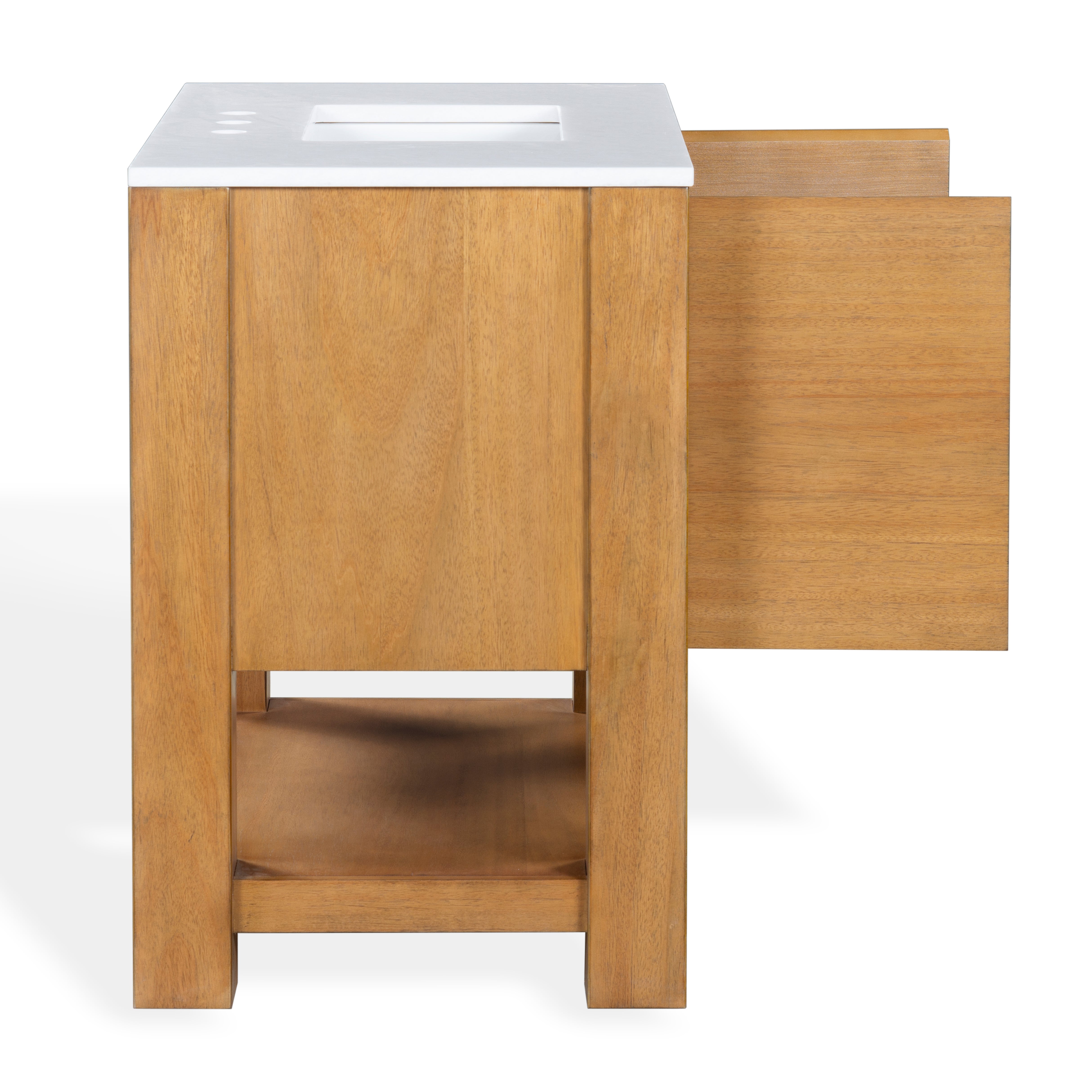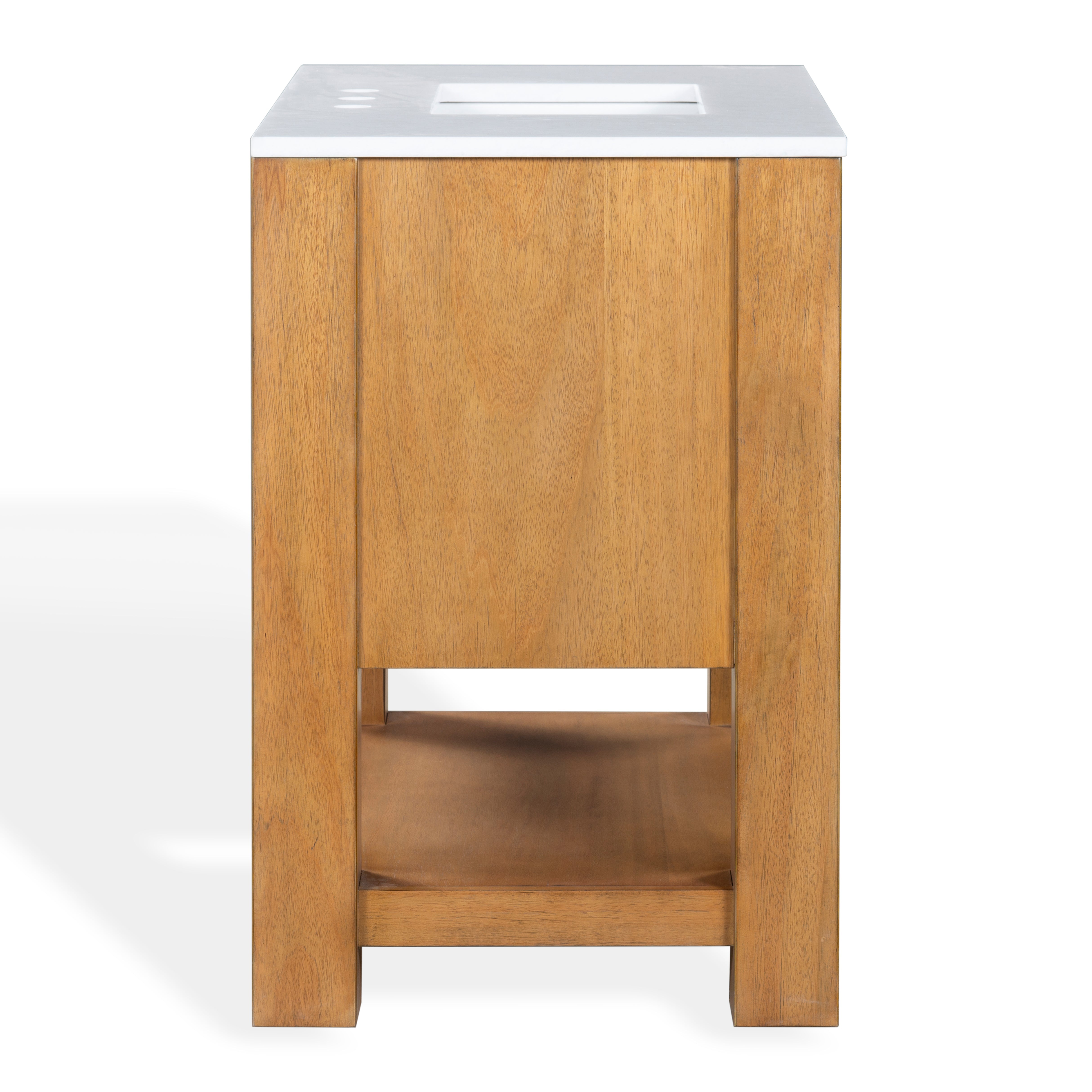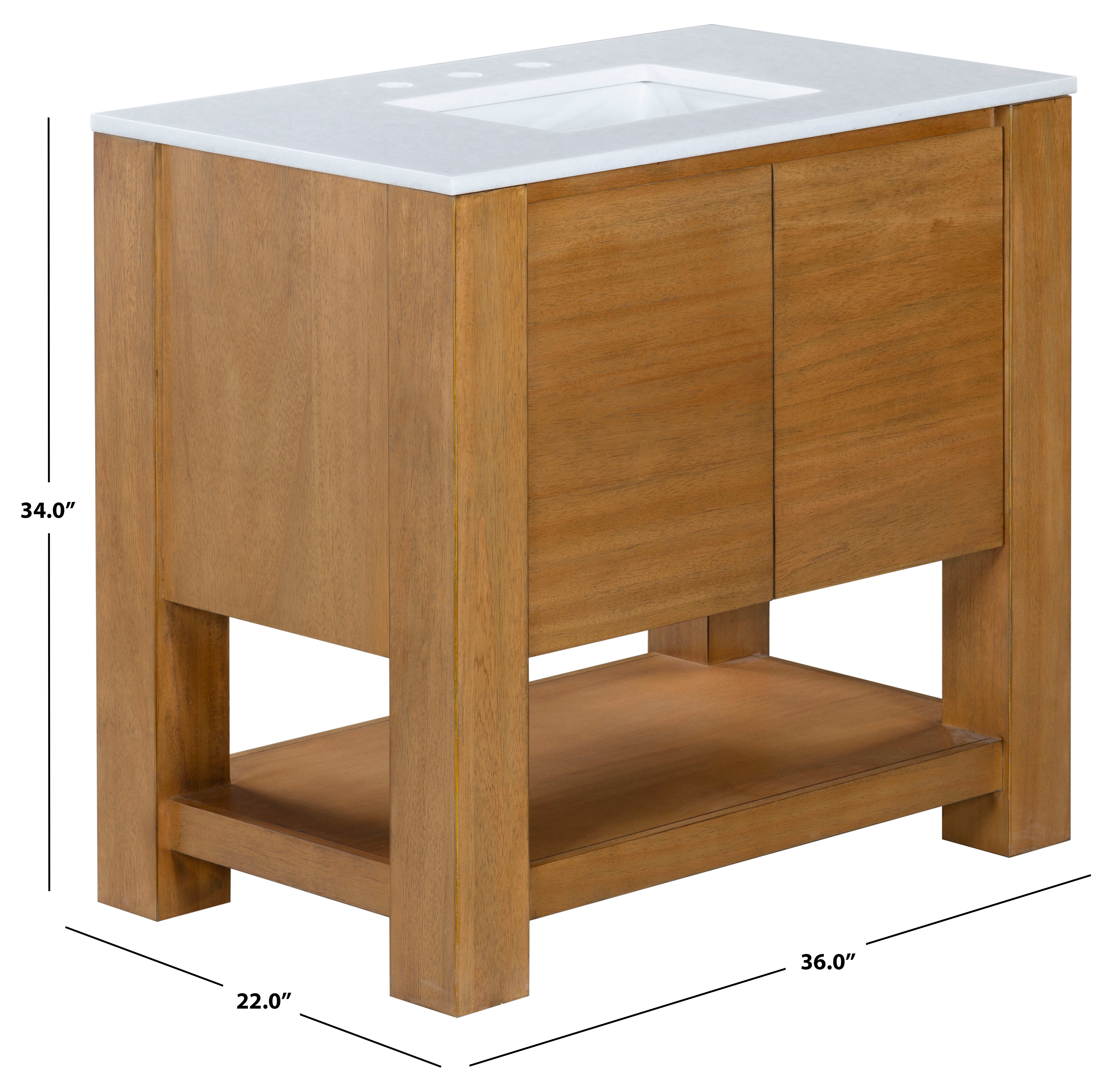 Transform your bathroom into a stylish sanctuary with the Bertino vanity. Crafted in a calming light oak shade, this vanity effortlessly blends rustic charm with modern elegance. The soft, natural tones of the wood create a warm and inviting atmosphere, offering a touch of nature to your interior decor. The Bertino vanity features a sleek white countertop, composed of refined marble that adds a sense of sophistication to your space. Below, a smoothly integrated ceramic sink enhances the overall sleek design, combining functionality with aesthetic appeal. Designed with an eye for detail, the Bertino vanity offers ample storage to keep your essentials organized and within reach. Its asymmetric balance of materials and colors strikes a harmonious note, inviting both utility and beauty into your everyday routine. Revitalize your bathroom with this distinctive vanity, where form meets function in the most charming way.