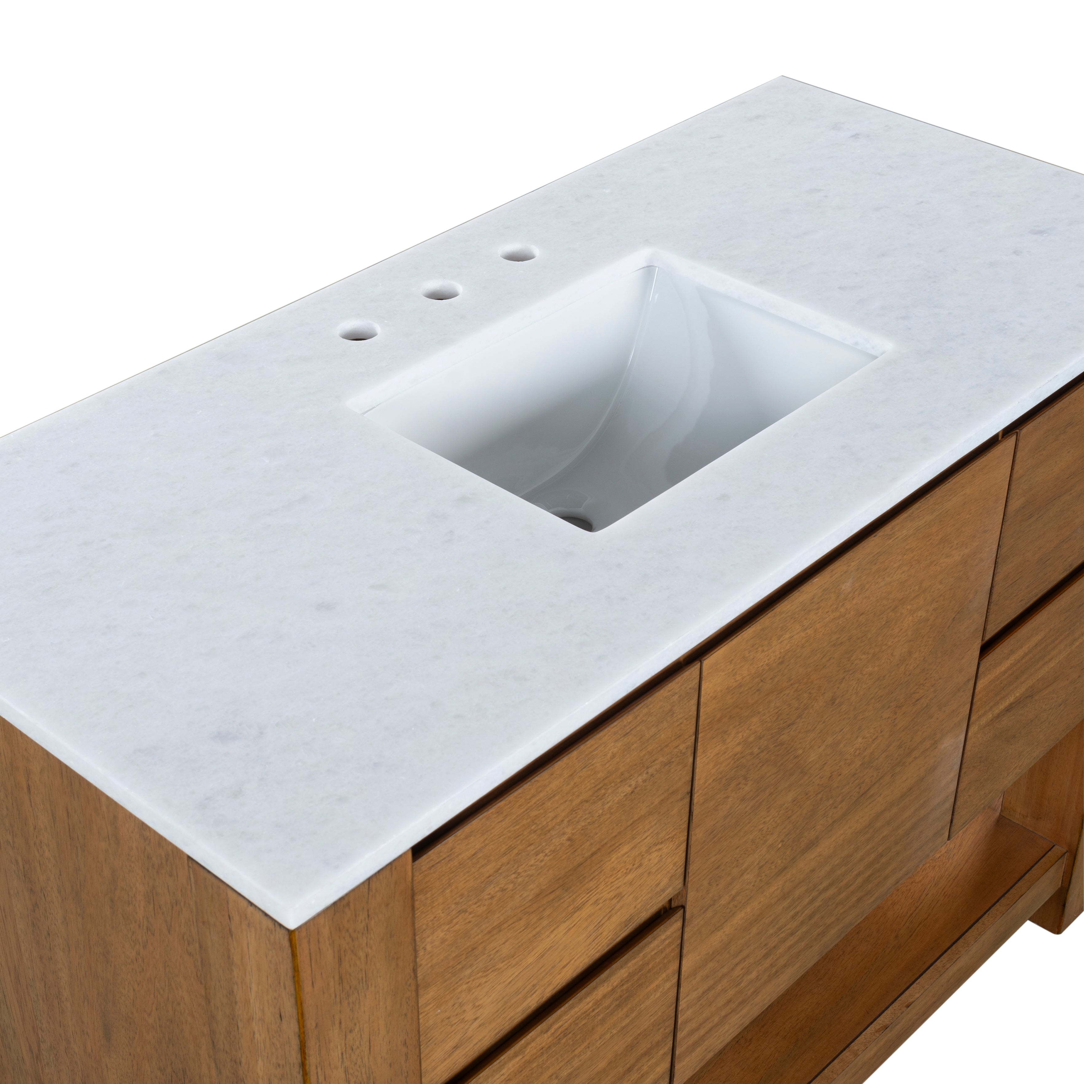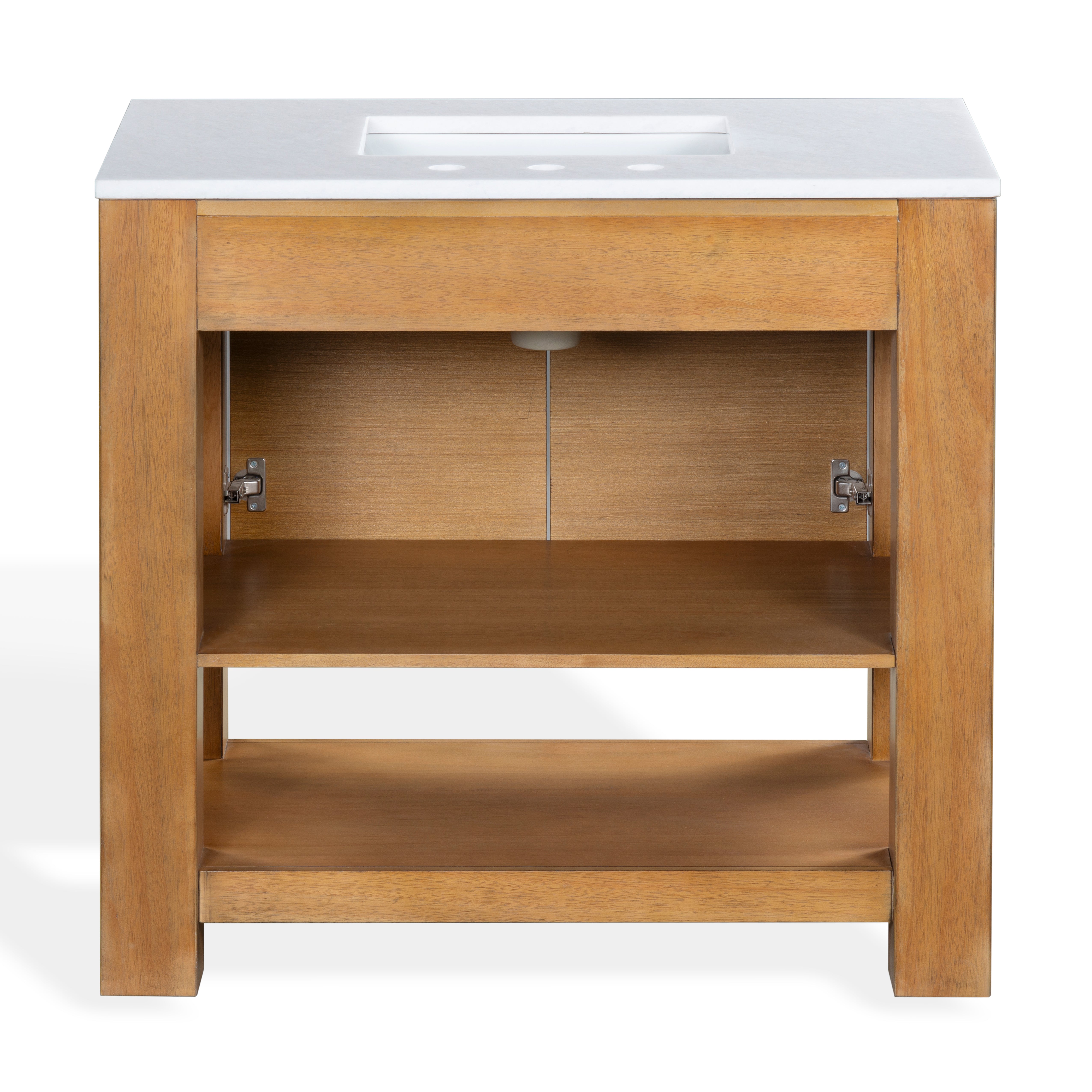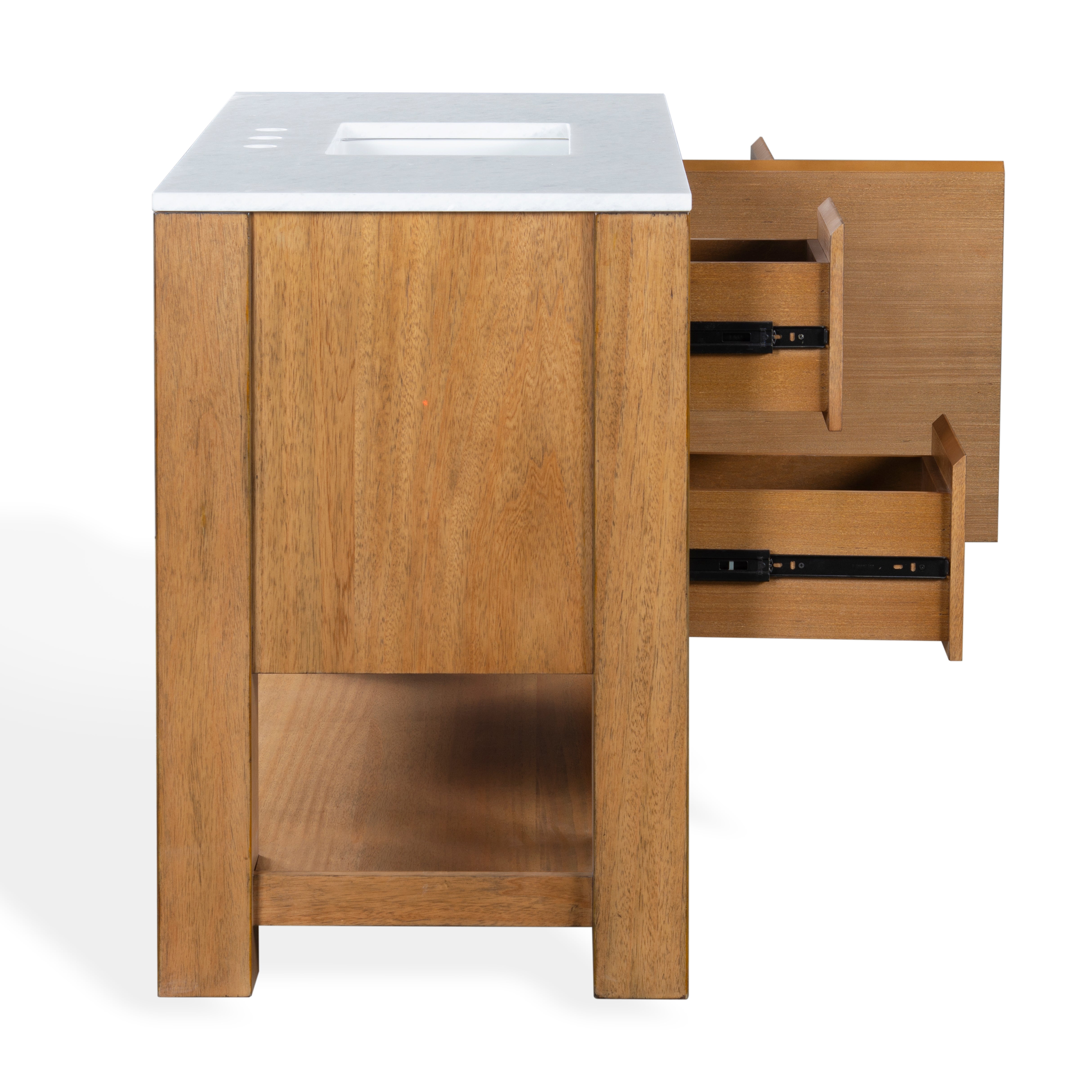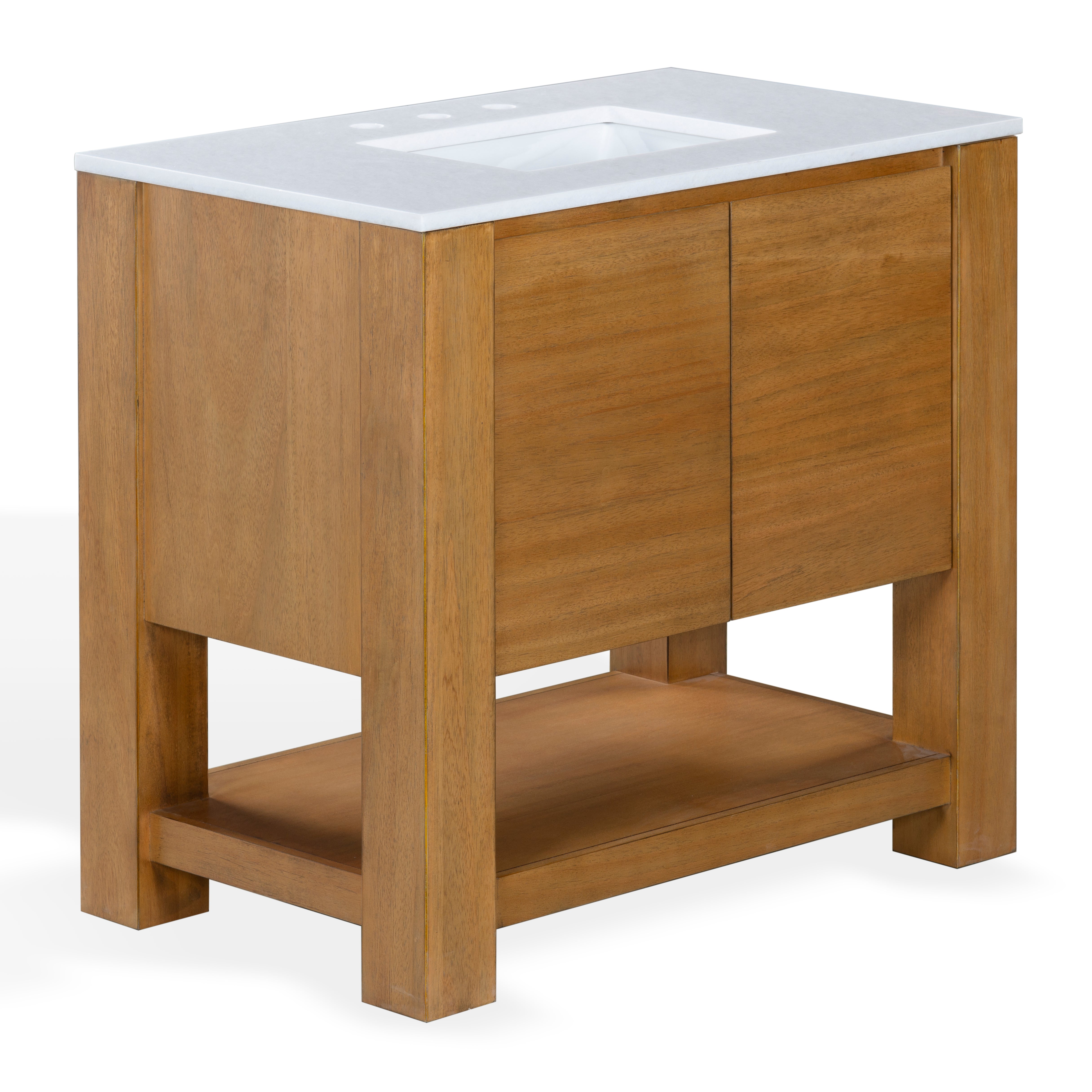 Transform your bathroom into a stylish sanctuary with the Bertino vanity. Crafted in a calming light oak shade, this vanity effortlessly blends rustic charm with modern elegance. The soft, natural tones of the wood create a warm and inviting atmosphere, offering a touch of nature to your interior decor. The Bertino vanity features a sleek white countertop, composed of refined marble that adds a sense of sophistication to your space. Below, a smoothly integrated ceramic sink enhances the overall sleek design, combining functionality with aesthetic appeal. Designed with an eye for detail, the Bertino vanity offers ample storage to keep your essentials organized and within reach. Its asymmetric balance of materials and colors strikes a harmonious note, inviting both utility and beauty into your everyday routine. Revitalize your bathroom with this distinctive vanity, where form meets function in the most charming way.