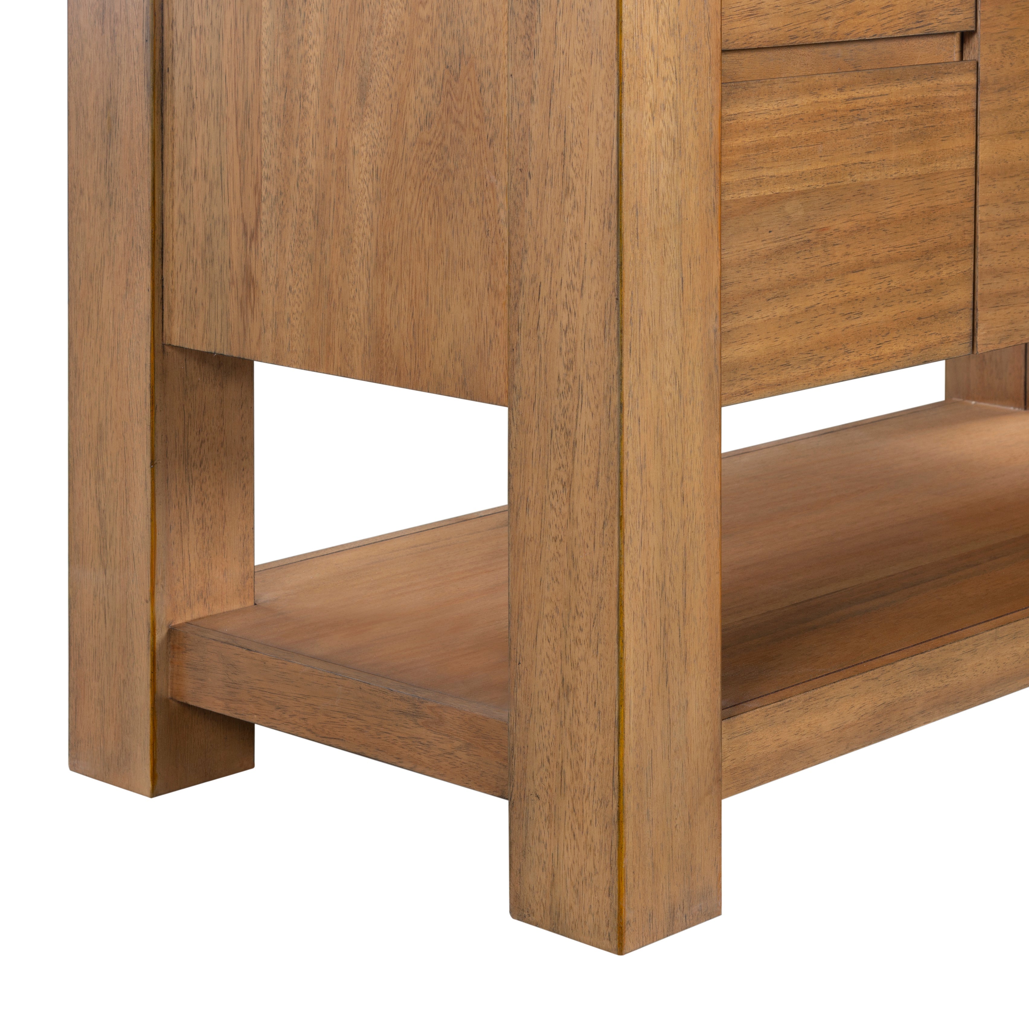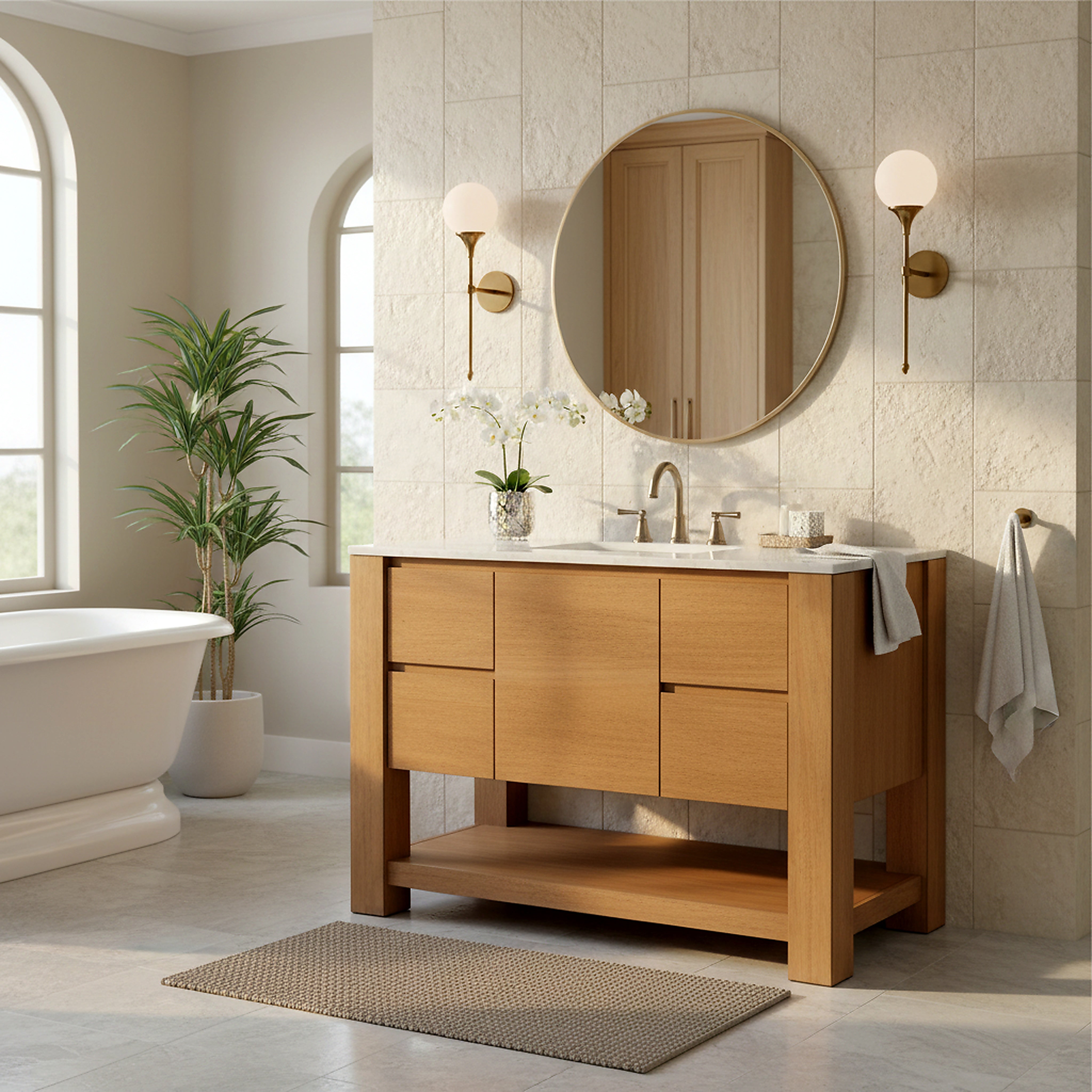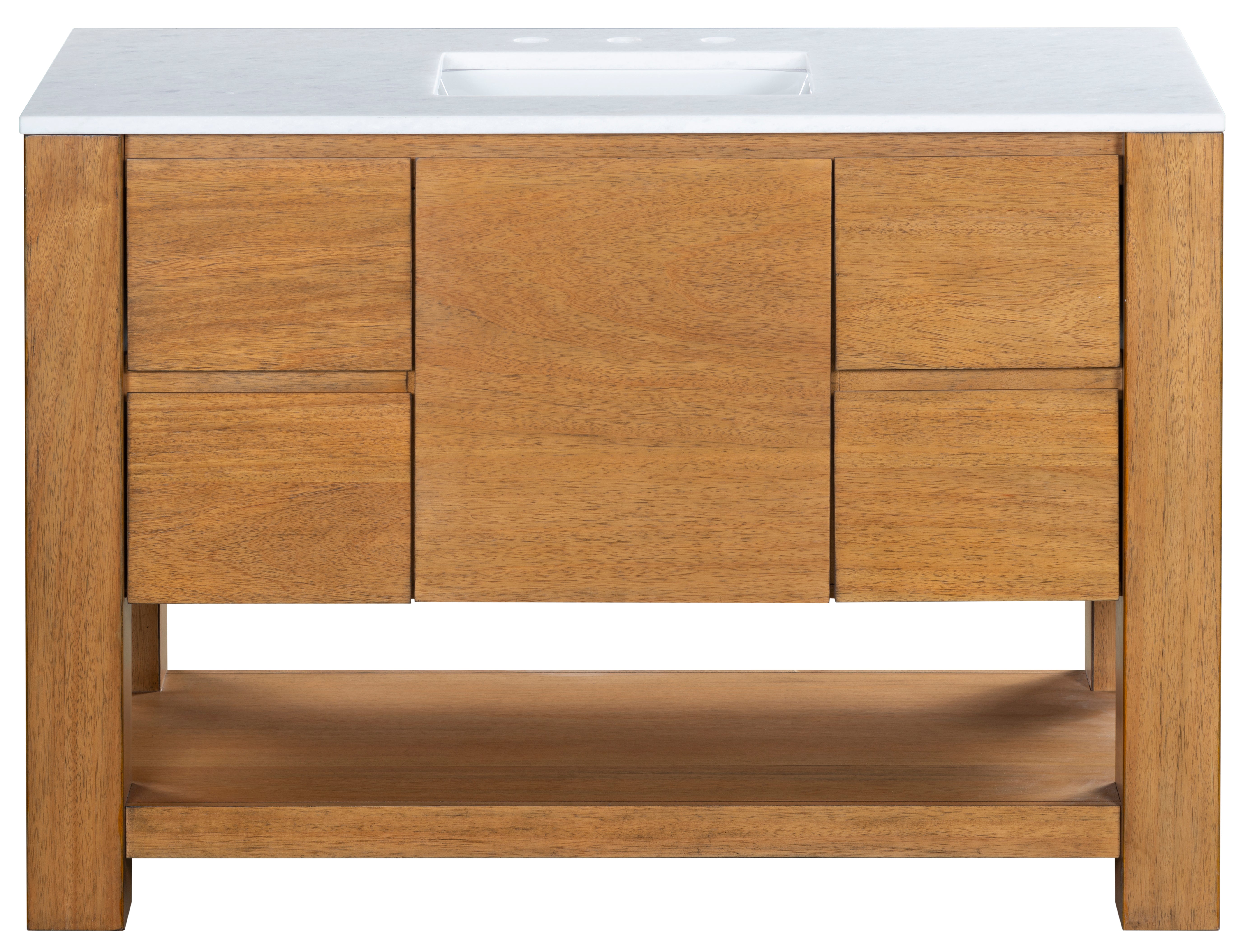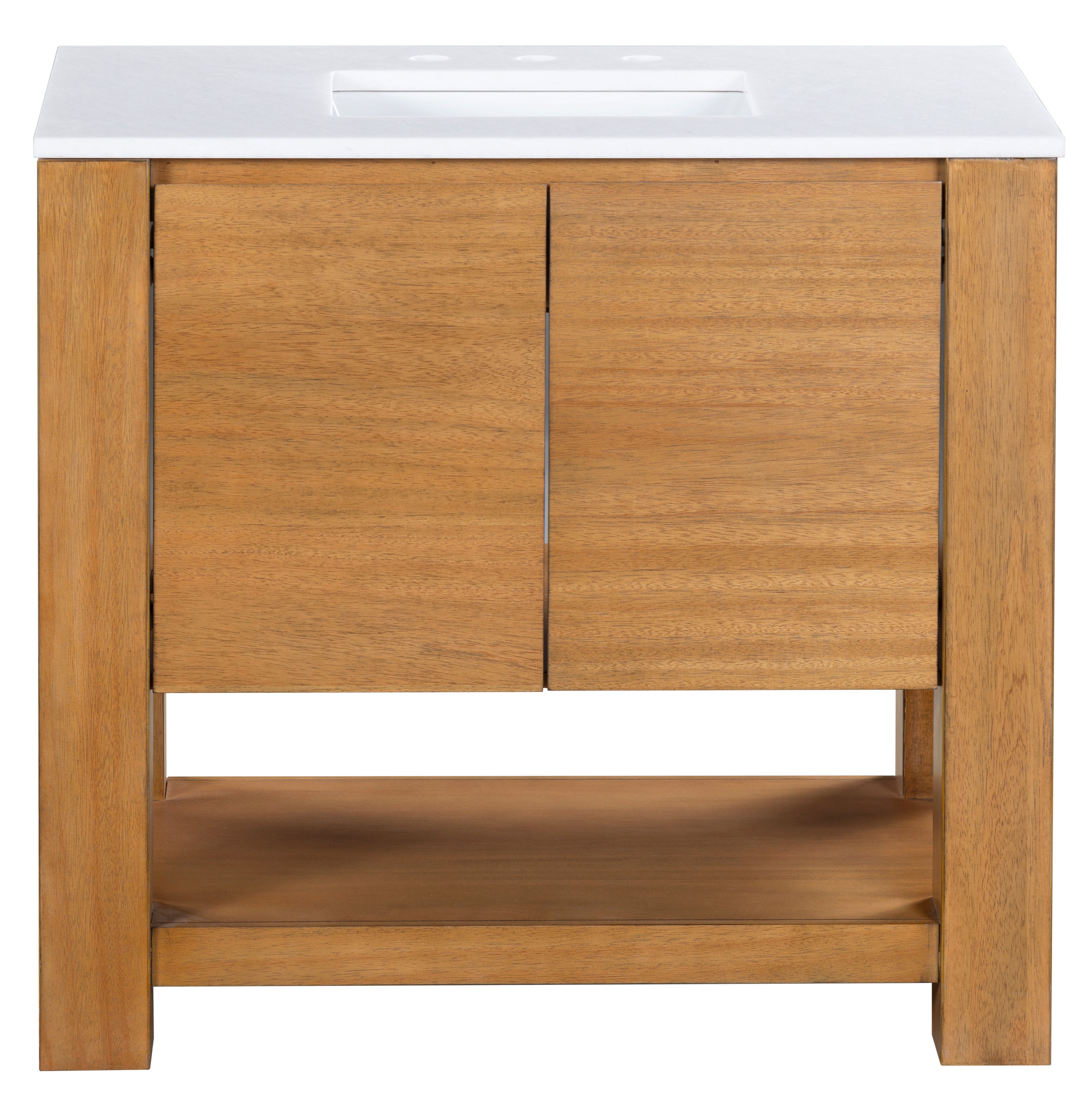 Transform your bathroom into a stylish sanctuary with the Bertino vanity. Crafted in a calming light oak shade, this vanity effortlessly blends rustic charm with modern elegance. The soft, natural tones of the wood create a warm and inviting atmosphere, offering a touch of nature to your interior decor. The Bertino vanity features a sleek white countertop, composed of refined marble that adds a sense of sophistication to your space. Below, a smoothly integrated ceramic sink enhances the overall sleek design, combining functionality with aesthetic appeal. Designed with an eye for detail, the Bertino vanity offers ample storage to keep your essentials organized and within reach. Its asymmetric balance of materials and colors strikes a harmonious note, inviting both utility and beauty into your everyday routine. Revitalize your bathroom with this distinctive vanity, where form meets function in the most charming way.