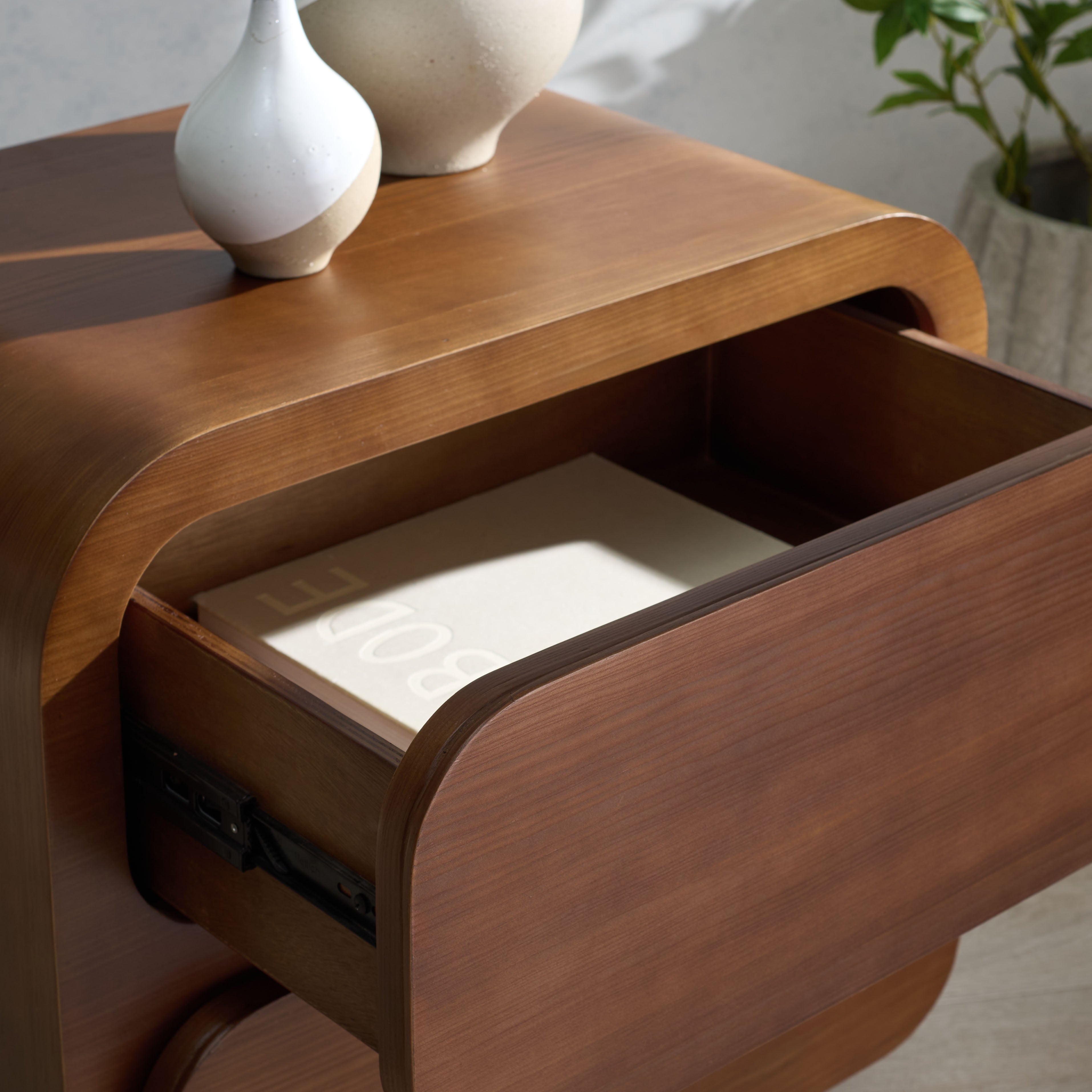Introducing the Herald 2 Drawer Wood Nightstand. The perfect addition to any bedroom, this nightstand comes in a rich, inviting brown color that warms up your space. Made from robust pinewood and overlaid with beautiful pine veneer, it is the embodiment of sturdiness and durability. The dual-drawer feature allows for ample storage space, making it more than just an aesthetic addition to your bedroom but also a practical one. With a contemporary design, this intricately crafted piece adds a touch of elegance and sophistication to your home. The Herald 2 Drawer Wood Nightstand is an investment in style and function, building on its modern appeal with practicality that complements any home d?cor. Whether you need a handy spot for your bedtime read, or a place to stash your sleep time essentials, this nightstand is your go-to piece. Its durability and stylish design will grace your room for a substantial period. Experience a blend of style, function, and practicality with the Herald 2 Drawer Wood Nightstand.