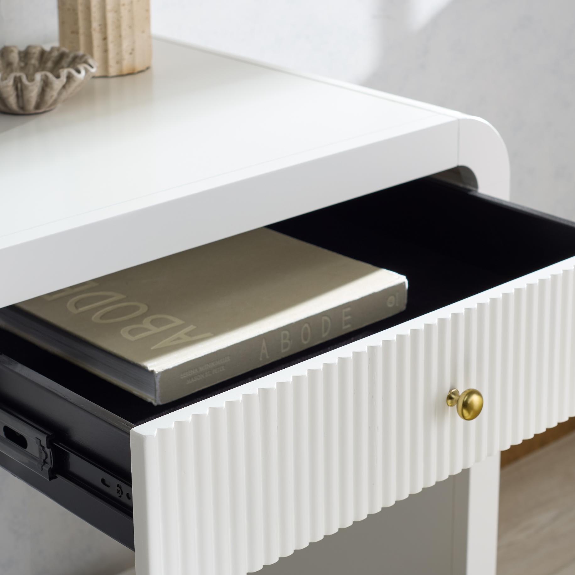 Transform your workspace with the understated elegance of the Liabella 2 Drawer Curved Desk in White. Crafted with a balanced blend of wood and metal, this desk brings a touch of modern sophistication to any room. Its sleek curved design creates a stylish focal point while providing ample space for work essentials. The two spacious drawers offer practical storage solutions to keep your area tidy and clutter-free. The smooth finish not only enhances its aesthetic appeal but also seamlessly complements a variety of decor themes. Whether placed in a home office, bedroom, or living area, the Liabella desk provides a functional and stylish surface for productivity and creativity. Dive into your tasks with ease and style at a desk designed to inspire and organize. Elevate your workspace with a piece that harmonizes form and function, turning any ordinary room into a hub of efficiency and grace. Whether for work or creativity, the Liabella desk provides an ideal environment for productivity and inspiration. Its smart design not only conserves space but also transforms your room into a place of focus and flow. Discover the perfect balance between form and function with the Liabella 2 Drawer Curved Desk.
