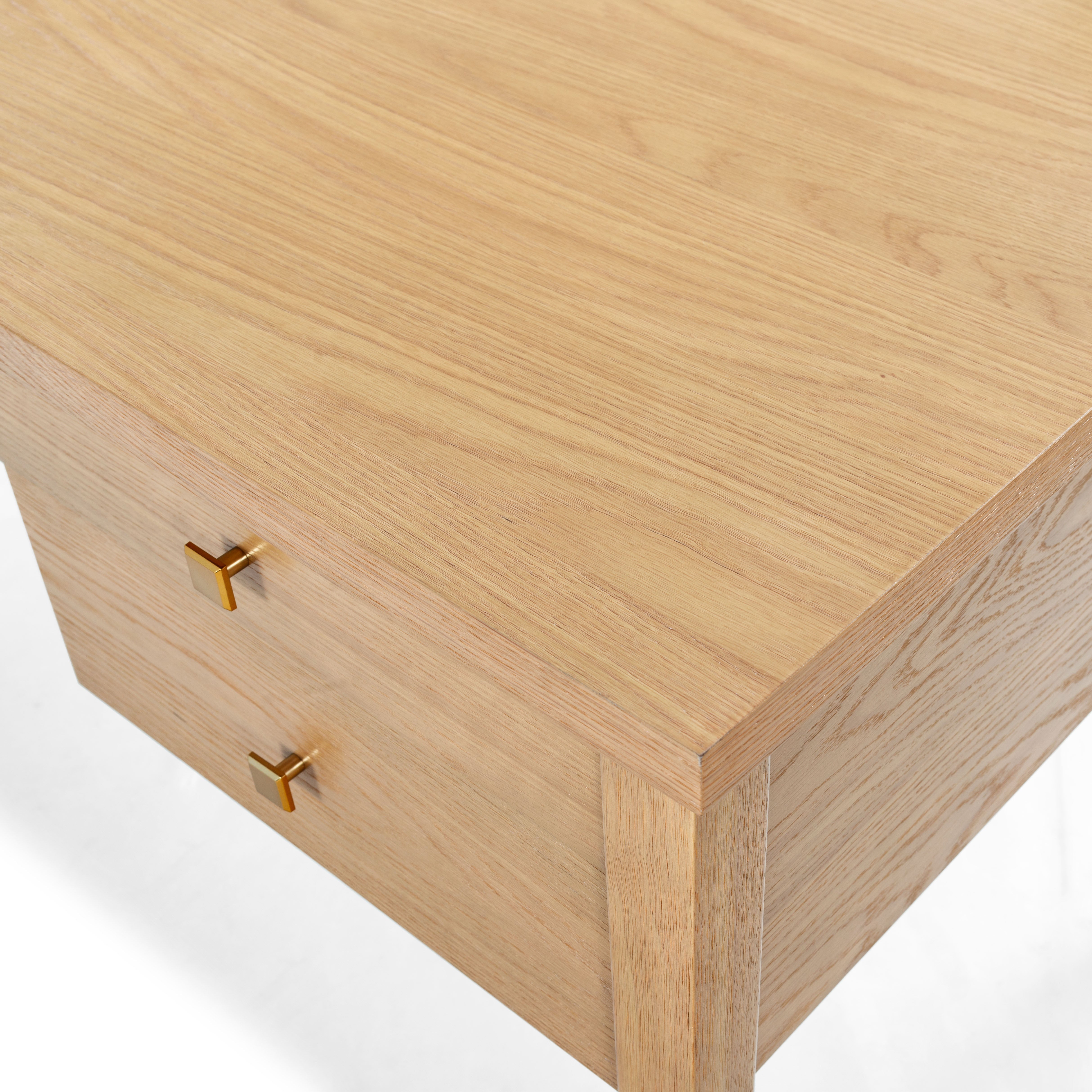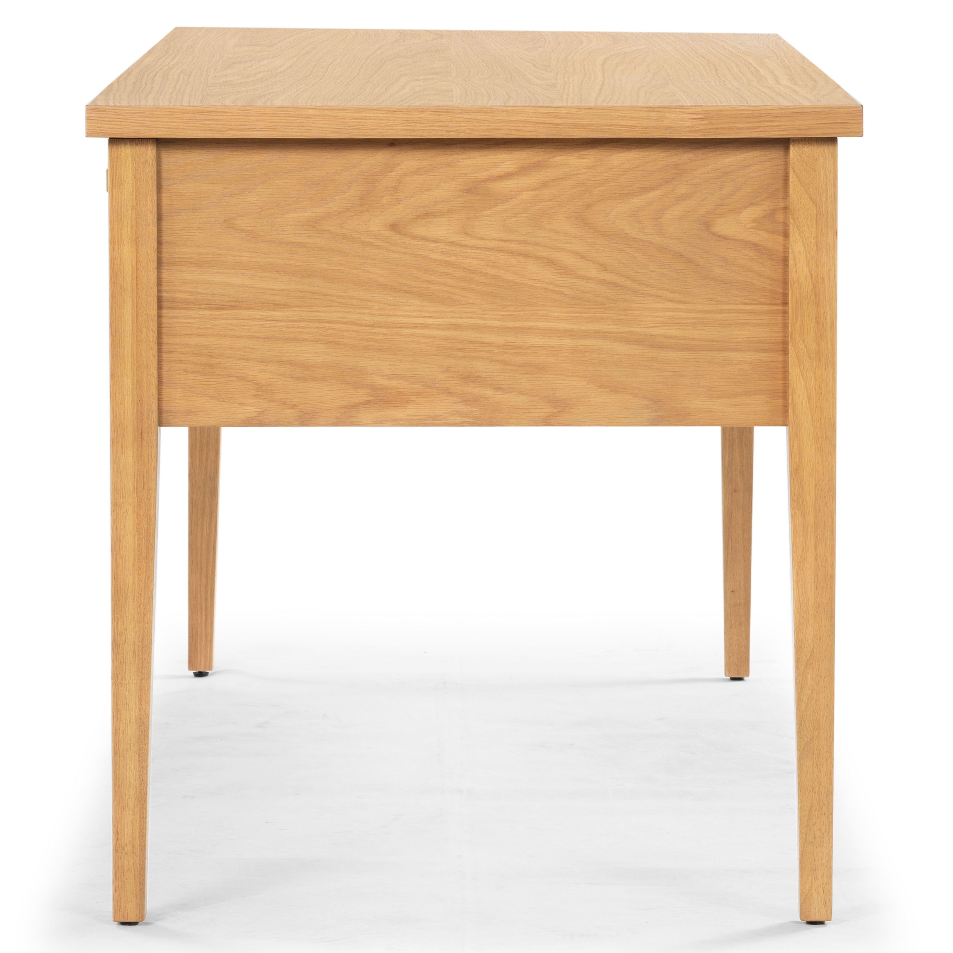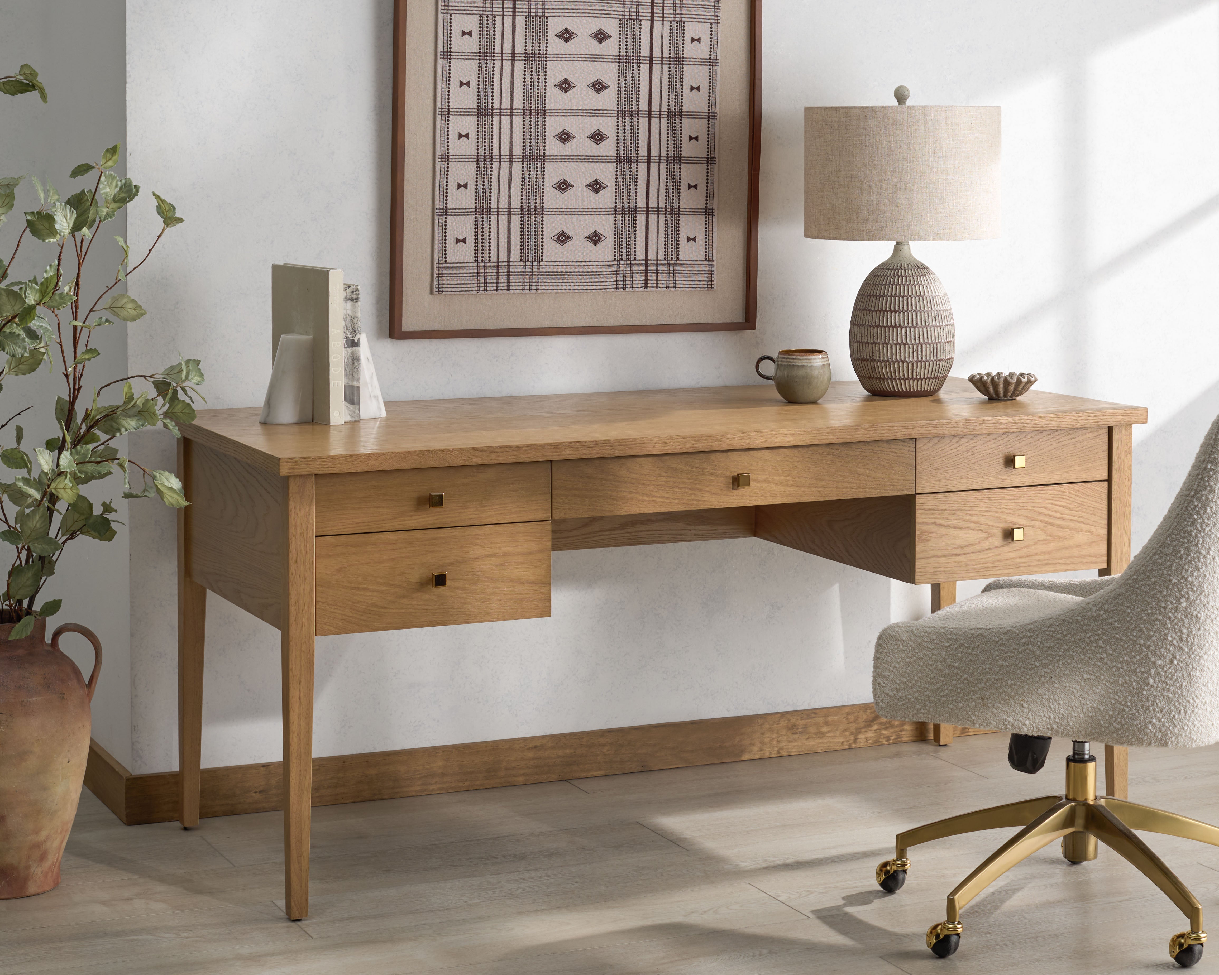 Introducing the Makala 5 Drawer Wood Desk in Natural Gold, where functionality meets elegance. This exquisite piece transforms your workspace with its harmonious blend of natural wood and sleek metal, offering both style and practicality. The desk boasts five spacious drawers, providing ample room for all your essentials while ensuring your space remains clutter-free and organized.